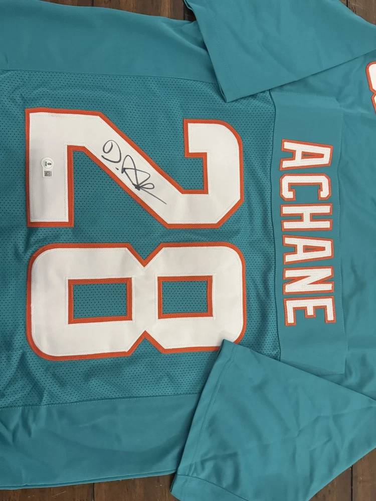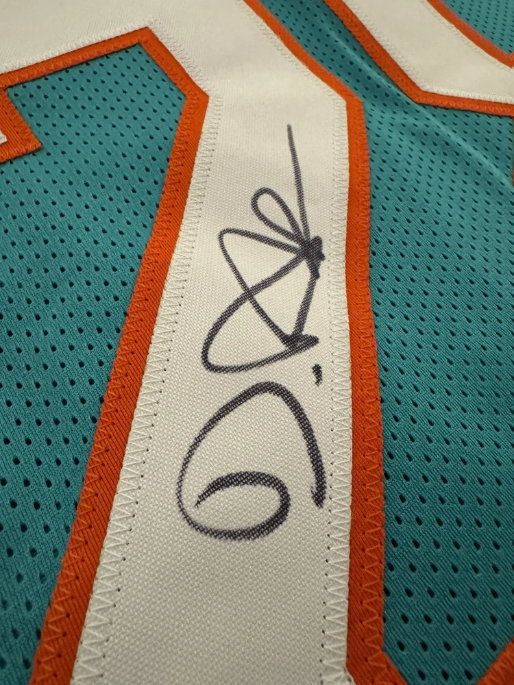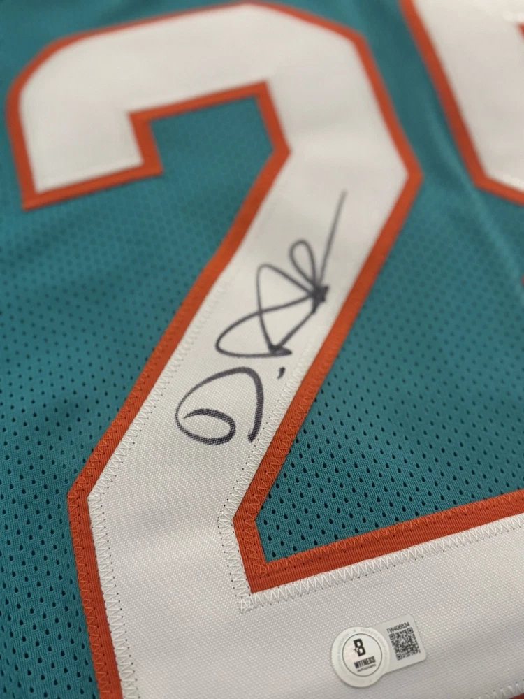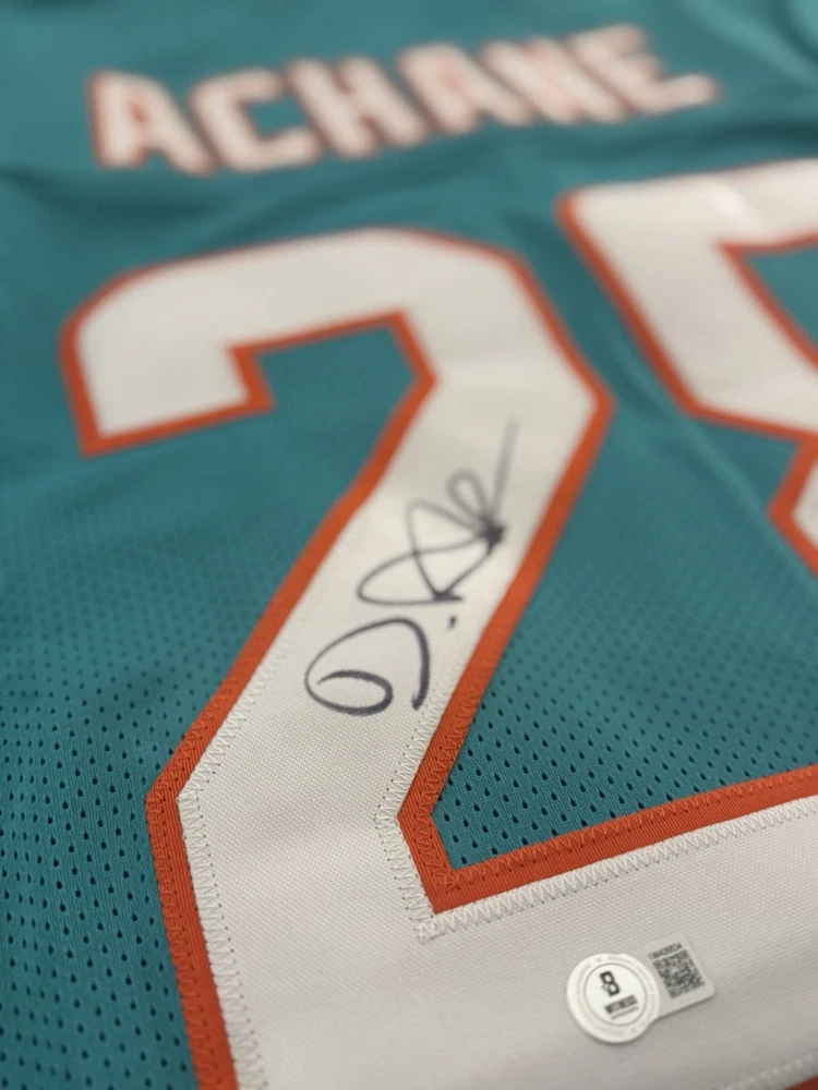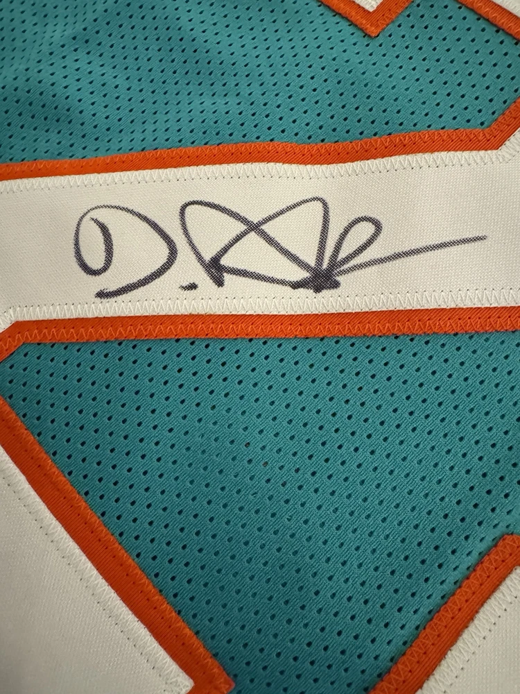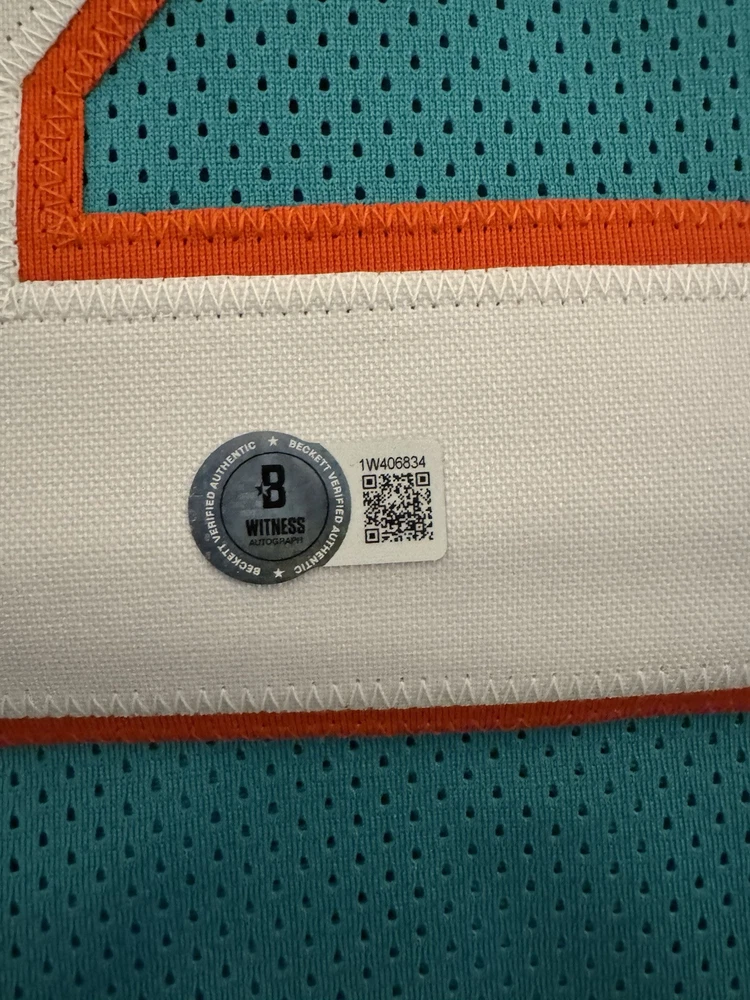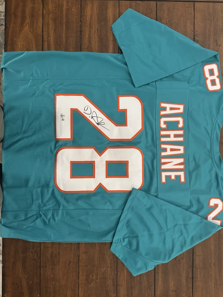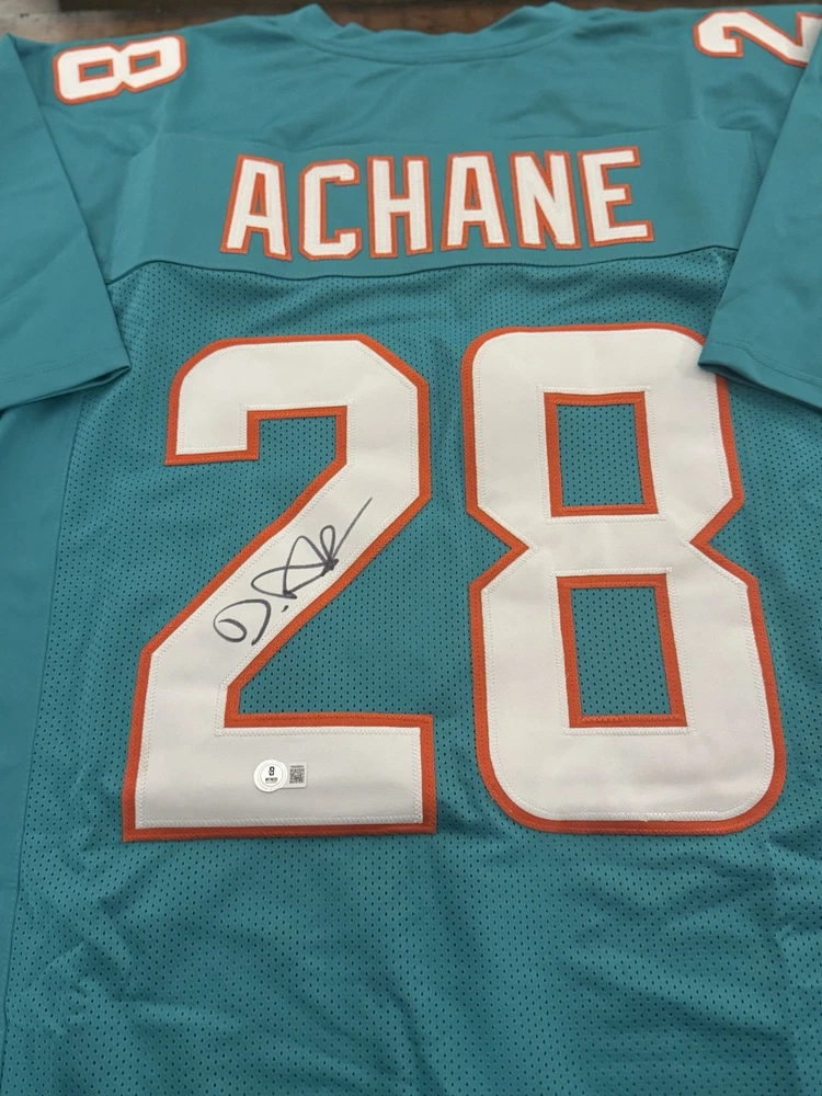 Elevate your collection with a De'Von Achane autographed Miami Dolphins jersey. This authentic piece, verified by Beckett Authentication Services, showcases the dynamic talent of the football star in pristine detail. The signature is a must-have for fans and collectors alike, symbolizing a piece of sports history. Carefully preserved, the jersey reflects the vibrant colors and design of the Miami Dolphins, capturing the essence of the player and the game. Whether displayed in your home or office, this signed jersey is a standout addition to any sports memorabilia ensemble.