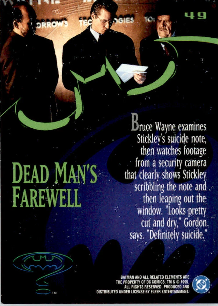 Graded: No Autographed: No Player/Athlete: Dead Man's Farewell Season: 1995 Set: 1995 Ultra Batman Forever Type: Non-Sport Trading Card Franchise: NON_SPORT Year Manufactured: 1995 Card Number: 49