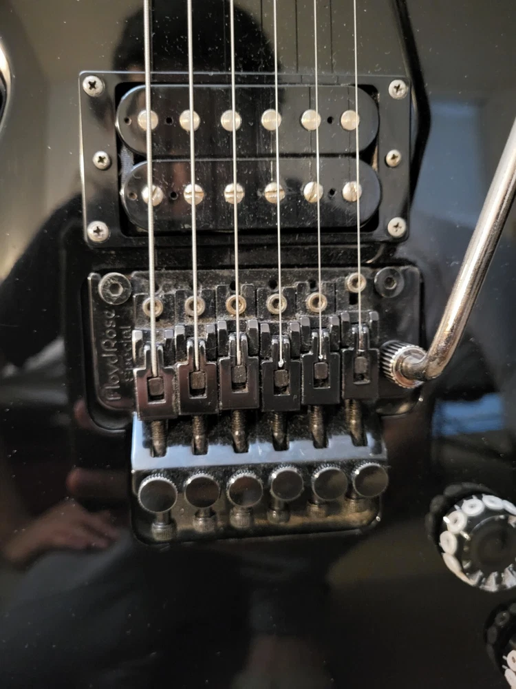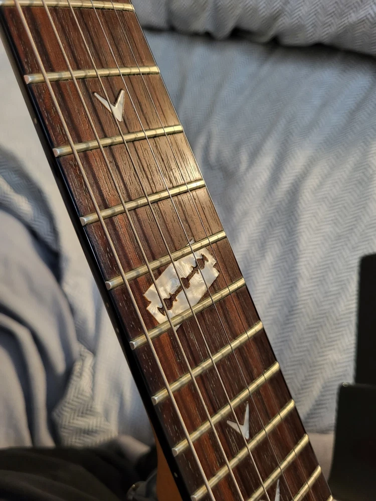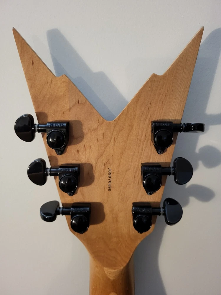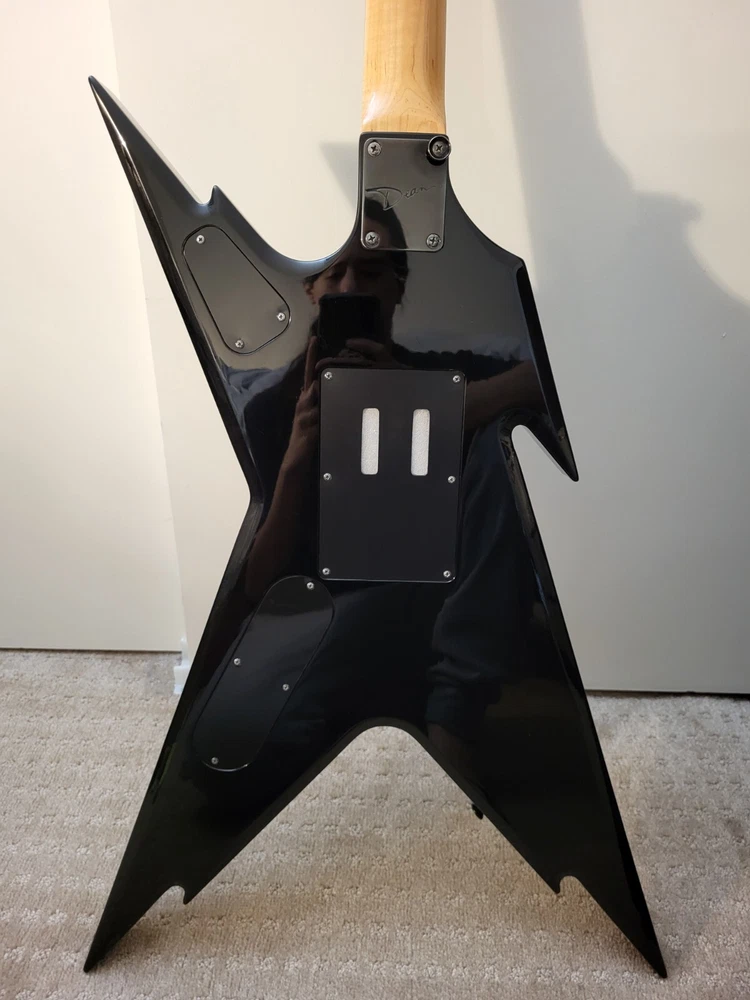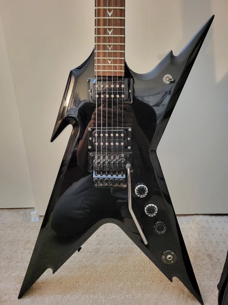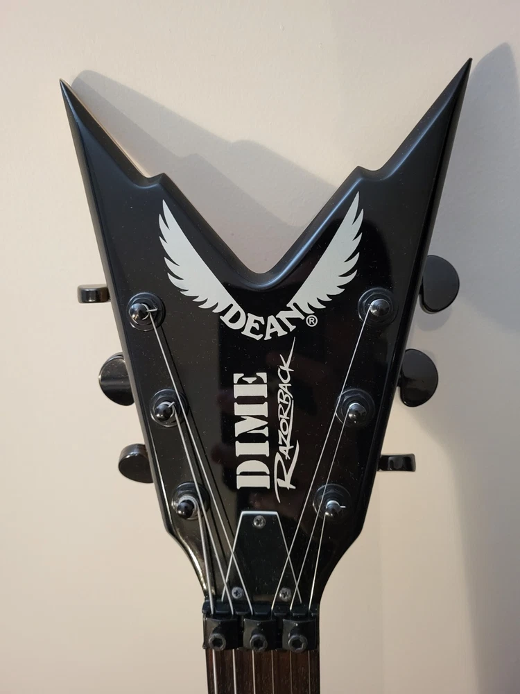 Dean Razorback Dimebag from 2009. I had this guitar for almost 10 years and it is in the same condition it has been given to me. (Only 2 minuscule clear coat chips on each end of the V, no bigger than 2mm, see pictures for reference) Bolt on neck, engraved Dean plate, default passive humbuckers, 3-way pickup selector, 2 Volumes - 1 Tone w custom grip Dime's style, maple neck with satin finish making it smooth to move around it, custom V and Razor inlays, locking Floyd Rose bridge and nut. Currently tuned down to D standard with 10s Ernie Ball strings. I took the guitar to calibrate around 5 months ago and it has been sitting in the corner of my room since then, only occasionally played once in a blue moon. Strings are fairly new, action and intonation are perfect, all string locking systems are fully operational. It is equipped with a Floyd Rose Special. This guitar is a beast, don't let the shape fool you, it is a versatile instrument that can sound mellow and aggressive. The case is not in the best shape possible but it does the right job. It is a soft shell on the outside, but the inside is dense styrofoam following the same guitar shape so it doesn't rock inside it. Located in LA, California.