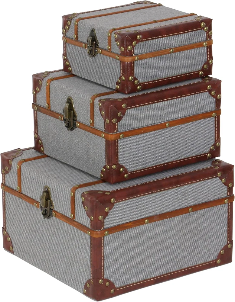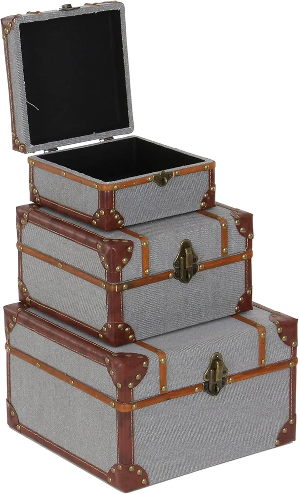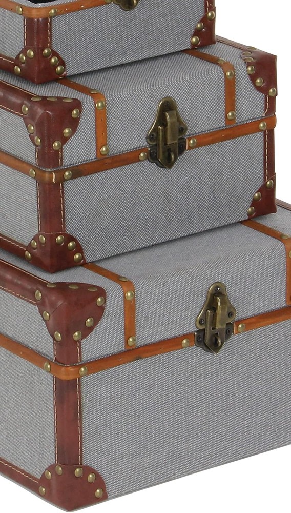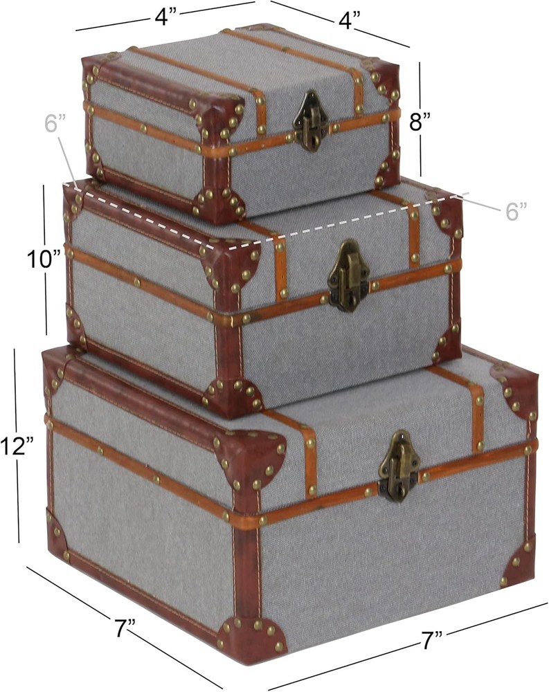 Deco 79 Wooden Decorative Box Upholstered 3 PIECES SMALL SIZE, Gray Product Details Brand: Deco 79 Color: Gray Material: Engineered Wood Special Feature: Lockable Style: Rustic Recommended Uses For Product: Home Product Dimensions: 12"L x 12"W x 7"H Capacity: 12 Liters Closure Type: Latch Water Resistance Level: Not Water Resistant Item Weight: 9 Pounds Opening Mechanism: hinged,latch Shape: Rectangular Pattern: Solid Number of Items: 1 Storage Volume: 12 Liters Number of Compartments: 3 Unit Count: 1.0 Count Item Package Quantity: 1 Item Weight: 9 pounds Manufacturer: Deco 79 Country of Origin: China Item model number: 54070 Fabric Type: Burlap9.00%; PU - 1.00%; Assembly required: No Number of pieces: 1 Batteries required: No Included Components: Box Burlap9.00%; PU - 1.00%; TRADITIONAL DECORATIVE STORAGE BOXES: Designed with the essence of timeless sophistication, where rich old-world textures and warm hues come together for a refined classic taste of understated luxury WOODEN DECORATIVE STORAGE CONTAINERS: This mdf and fabric box set with lid features is made from medium density fiberboard materials and fabric GRAY AND BROWN GIFT BOXES: This traditional style wood fabric box set comes in a gray finish RECTANGLE KEEPSAKE BOXES: These traditional style inspired design gray wood and fabric storage box decors feature a timeless appeal from its fabric surface to its riveting detail and metal latch lock 3 SMALL SIZE TREASURE BOXES: Each gray wooden box measures 12L x 12W x 7H , 10L x 10W x 6H, 8L x 8W x 4H inches, and collectively weighs 8.62 lbs A practical yet stylish upgrade that instantly elevate the look of your room. Perfect way to add depth and texture to your surface space with this compact and discreet box. These wood and fabric boxes will make a great corner filler or shelf decor as well as a handy storage space for small objects. Designed with felt or rubber stoppers at the base that prevent scratching furniture and table tops, as well as sliding around. This item ships in 1 carton. Brown leather strips and studs and locks serve as accents. Mdf box makes a great gift for any occasion. Suitable for indoor use only. This item ships fully assembled in one piece. This gray colored mdf decorative keepsake box comes as a set of 3. Traditional style.