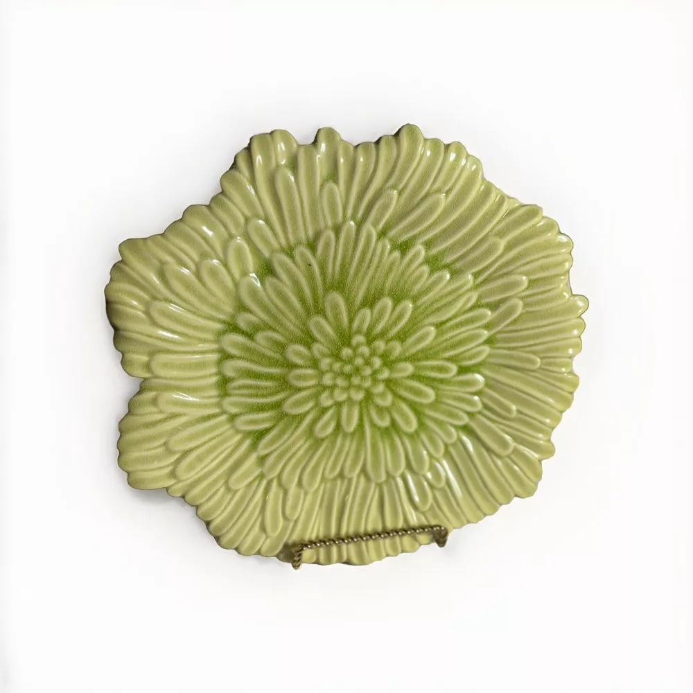 Enhance your dining experience with this beautiful green ceramic serving platter. This 12-inch abstract shaped platter features an all-over leaves theme and a glossy finish. Perfect for all occasions, this contemporary style platter is a limited edition piece and will add a touch of elegance to your table setting. Crafted in China, this platter is a reproduction of a vintage piece and weighs 3 lbs. It is hand wash only and will make a great addition to your home decor collection. This set includes one platter and is the perfect choice for those who love unique and one-of-a-kind pieces. Returns accepted within 30 days; buyer pays return shipping.