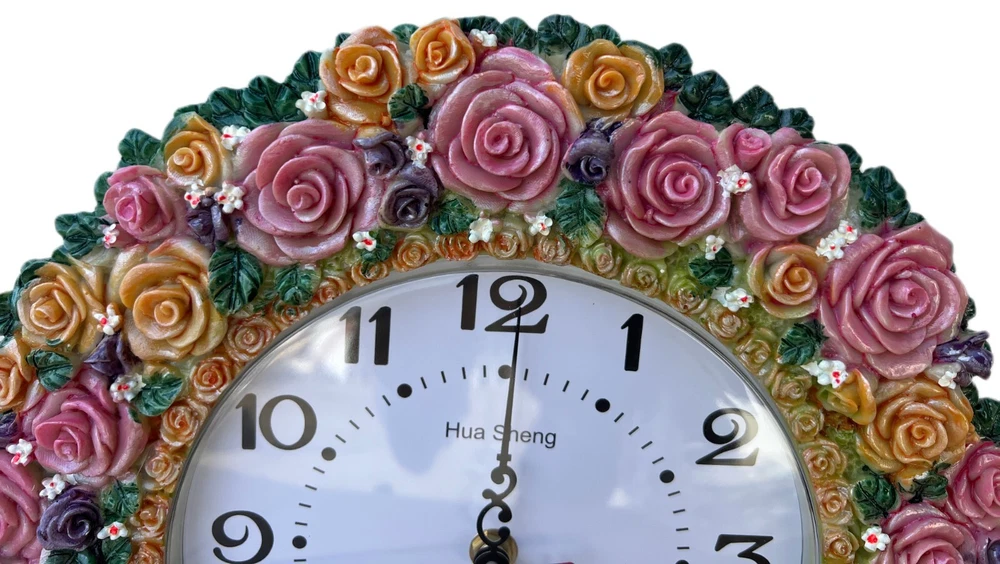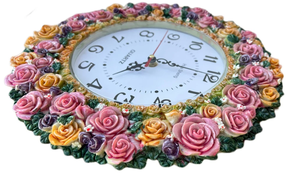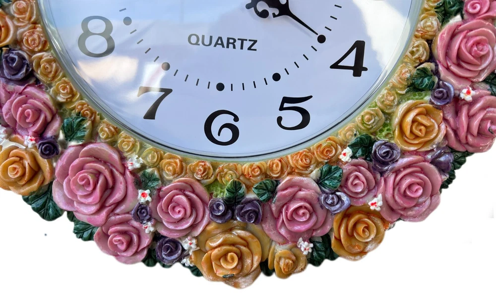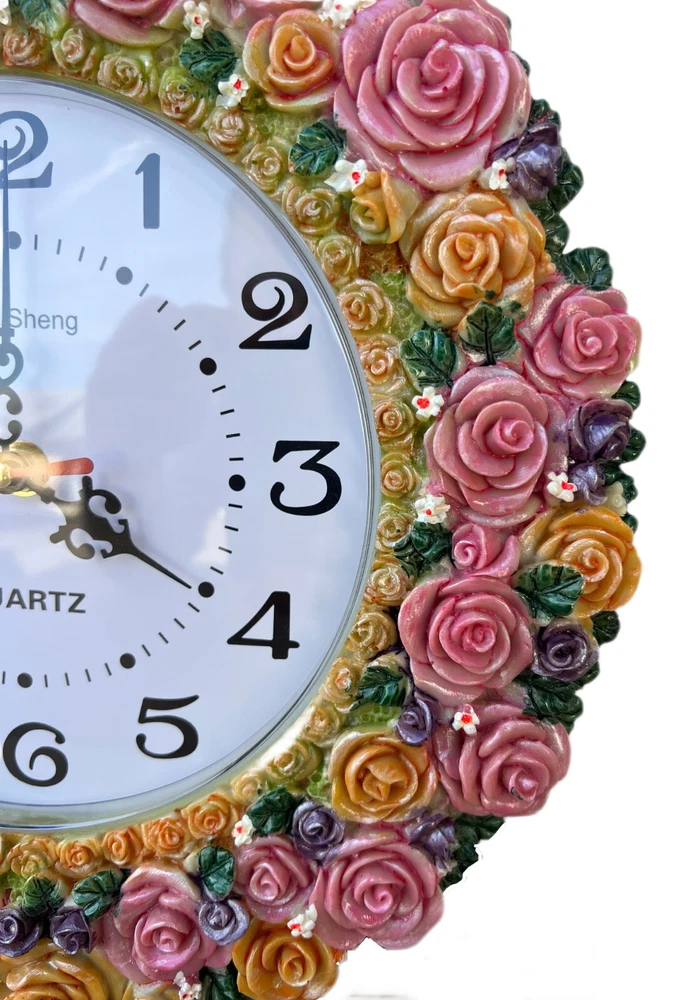 About this item ELEGANT DESIGN: Beautiful wall clock featuring a decorative frame adorned with detailed pink, orange, and purple roses, perfect for adding a romantic touch to any room PRECISE TIMEKEEPING: Reliable quartz movement ensures accurate time display with clear, easy-to-read numbers on a white dial face FLORAL FRAME: Intricately crafted rose arrangement with green leaves and small white flowers creates a stunning circular border around the clock face VERSATILE DECOR: Round wall clock design complements various interior styles, from vintage to modern, making it ideal for living rooms, bedrooms, or dining areas DIMENSIONS: Clock face measures approximately 12 inches in diameter with raised floral frame extending beyond the central timepiece