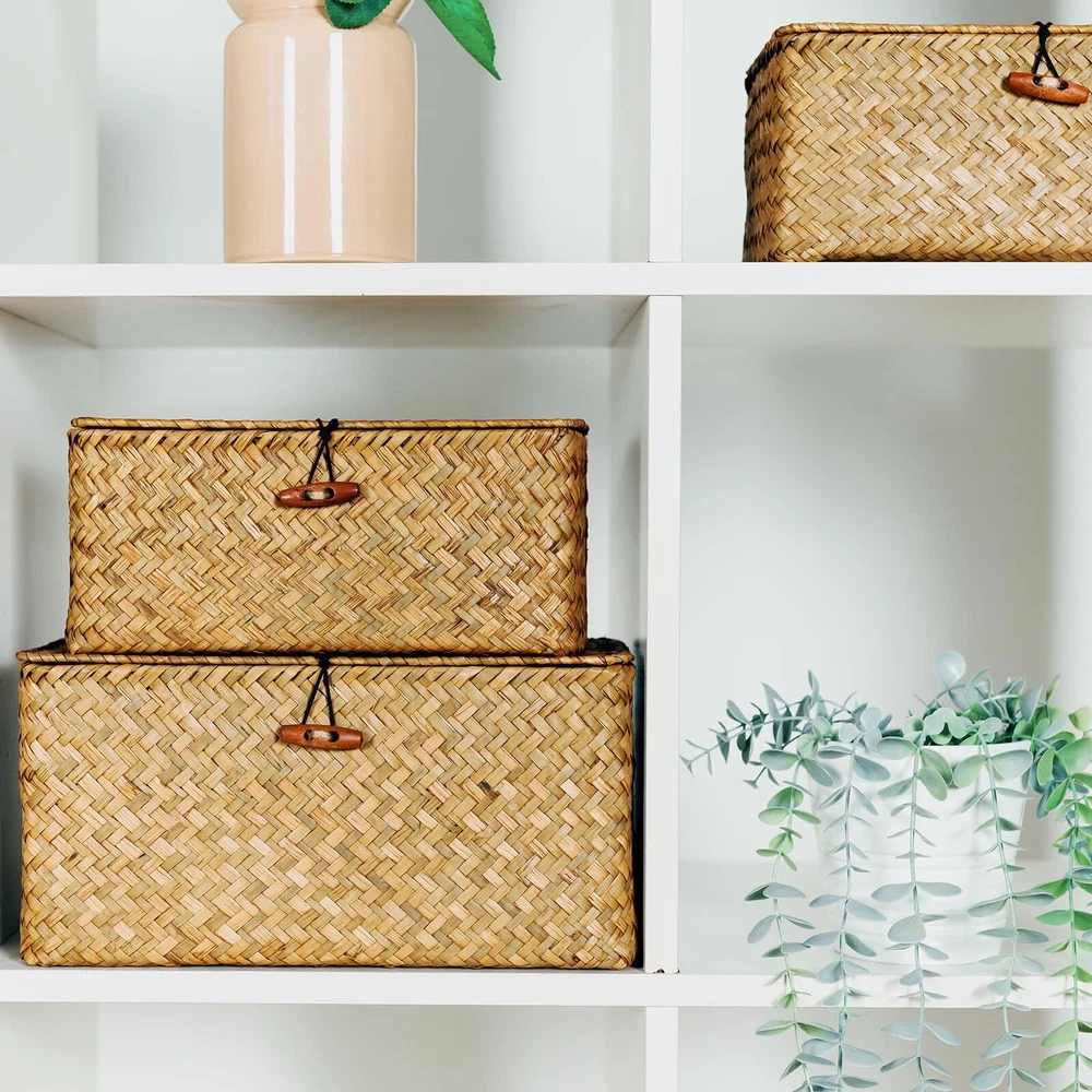 These storage baskets for shelves are handmade with seagrass by skilled craftspeople. Seagrass is one of the materials that humans have used for the longest time to braid various types of objects. Adding a natural and genuine expression to any space. Decorative storage boxes with lids are both handy and elegant. It can be placed in the living room,bedroom,children's room,bathroom and even work place,or to be used as closet storage bins. The small storage basket are good for storing cosmetics, beauty accessories and office supplies. The medium ones are suitable for books,important documents and snacks. The large storage bins can kid toys, clothes, blankets and sundries. Each side of the storage boxes is fixed with an iron frame to increase stability and can bear a certain weight. The woven storage baskets are closed with buttons to prevent dust and naughty babies or pets from opening the box, so that the items can be stored in a safe environment. Package includes:Seagrass storage baskets in a set of 3, large, medium and small.The 3 pieces baskets can be stored inside each other,Wipe clean with dry cloth. Size: L: 14.2"x9.5"x7"H, M: 12"x7"x6"H, S:10.2"x5.5"x4.3"H
