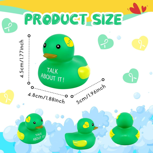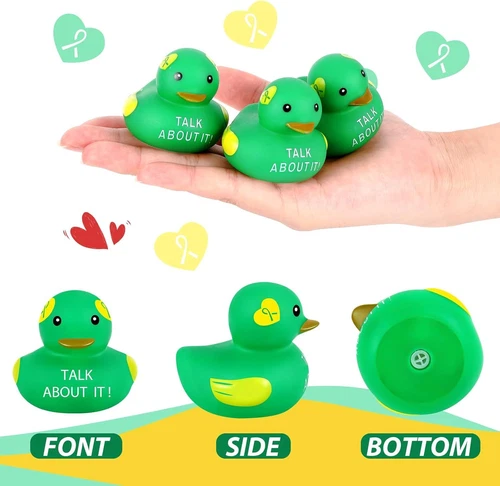 Deekin 100 Pcs Mental Health Rubber Duck Mental Health Awareness Green Ribbon Rubber Duck Mental Health Gifts Duck for Friend Family Coworkers Fundraiser Giveaways LuxeFusion Product Description Features: The small green ducks can be applied as nice decorations for your car, table, room, etc., and they are also funny bath duck. The rubber ducky is suitable for mental health themed parties, carnivals, birthday parties and more. Specifications: Material: rubber Color: as shown in pictures Size: approx. 4.8 cm/ 1.89 inches Package includes: 100 x Mental health awareness rubber ducks Notes: Manual measurement, please allow slight errors on size. The color may exist a slight difference due to different screen displays. Suitable for people over 12 years old. The words printed on the products are only for decorative using, not working as trademark using, our trademark is Deekin. Kindly noted. Features What Can You Get: the package contains 100 pieces of mental health awareness rubber ducks, enough quantity to meet your various needs for parties, you can share them with your mates Reliable and Safe Material: the mental health awareness ducks are made of quality rubber material, which is smooth and soft, not easy to fade or break, waterproof and safe to use, you can use them with confidence Mental Health Theme: the mental health rubber ducks are mainly green color, featuring ribbon pattern, which is in lined with the theme of mental health awareness, nice gift choices for friend, family or coworkers Mini Size: each mental health awareness rubber duck measures approx. 4.8 cm/ 1.89 inches, which is small and lightweight to carry, you can put them into your handbag, purse, or backpack, will not occupy much space Versatile Uses: the mini rubber duckies can be applied for most occasions, such as mental health themed parties, carnivals, birthday parties and so on, and they are also adorable car decorations, goodie bag stuffers and more Product Details Product Dimensions: 11.81 x 8.27 x 3.94 inches Item Weight: 1.76 pounds Country of Origin: China Item model number: KV-Deekin-3931 Manufacturer recommended age: 12 years and up Manufacturer: Deekin ๐ Free Shipping All orders ship free and fast to your doorstep. ๐ Easy Returns Satisfaction guaranteed. 30-day returns, no questions asked. ๐ฌ 24/7 Support Contact us anytime; weโre here to help, day or night. Brought to you by LuxeFusion โ Quality you can trust.