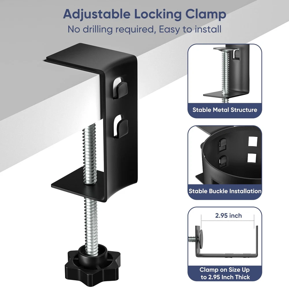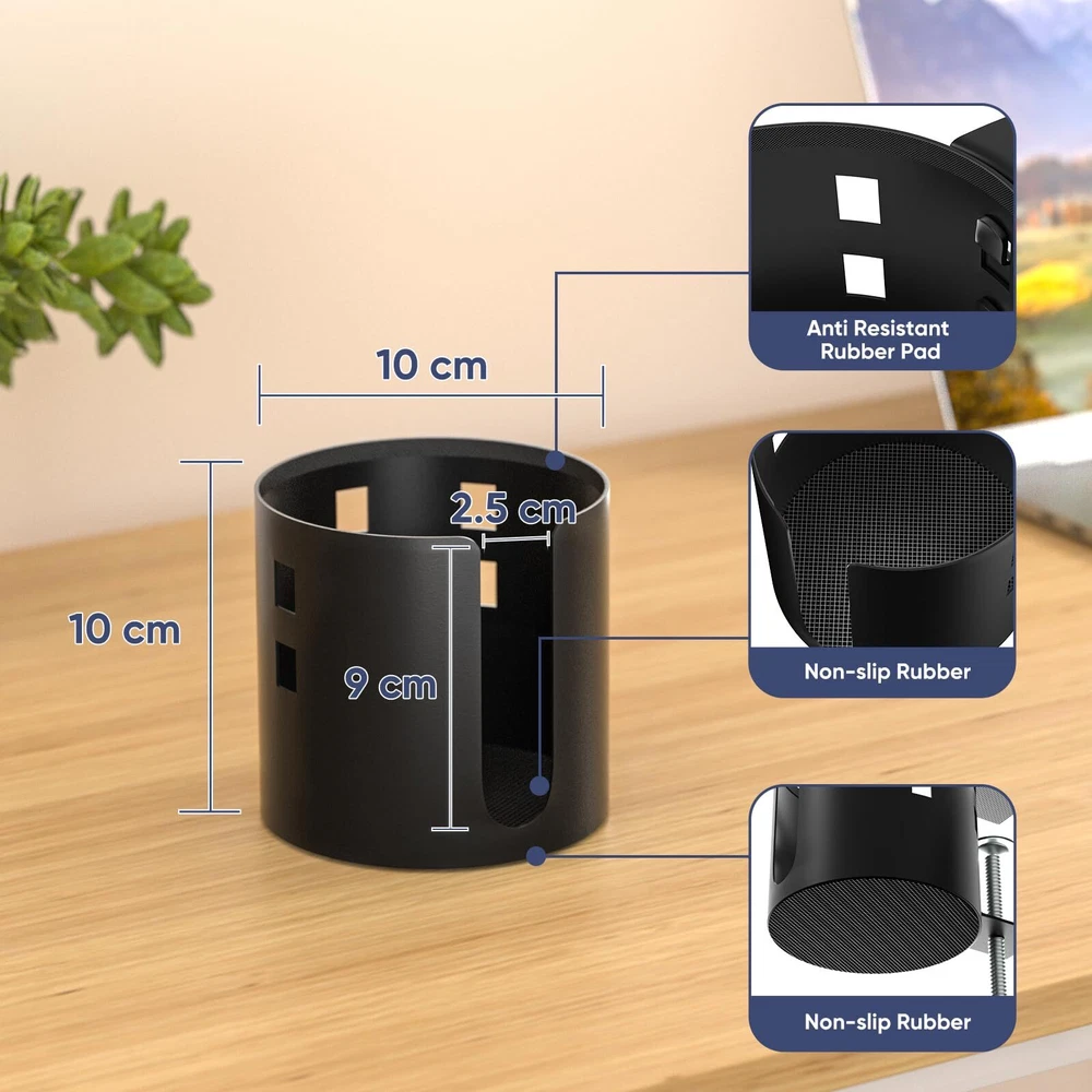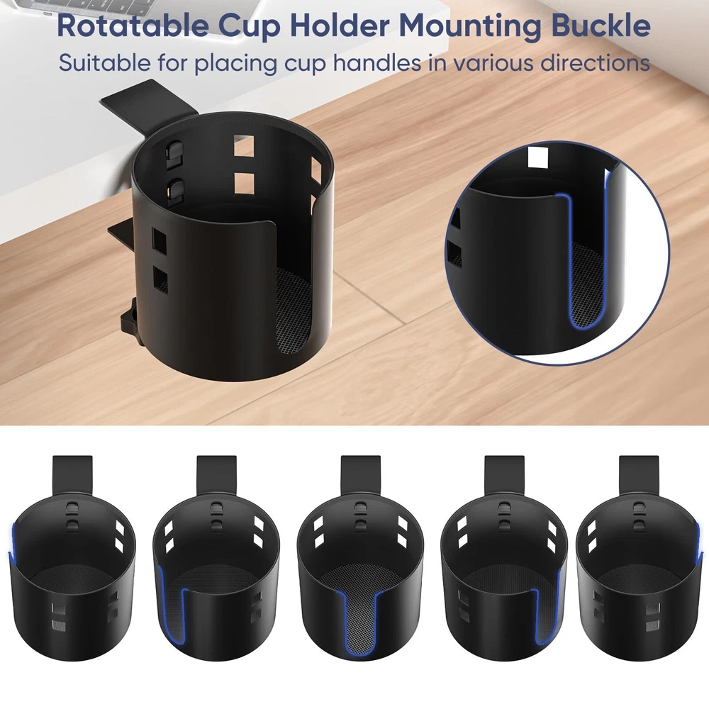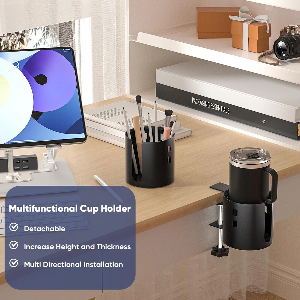 【Upgrade Version Desk Accessories】 Enjoy more space in your desk with the Upgraded Large cup holder, which the desk cup holder has five adjustable installation directions to allow two cup holders to be used side by side without any lack of space. 【Large and Deeper Capacity】 Our cup holder has a diameter and height of 3.95 inches. It can work perfectly with most popular brands bottles of 18-40 oz. 【Sturdier Metal Material】 The desk cup holder is made of high-quality metal materials, which are more durable and tear resistant than traditional plastic materials. The cup clamp is made of metal material with anti-slip pad, which is more stable than the ordinary clip, is not easy to break, and bears more gravity. 【Multifunctional】 The cup holder has U-shaped slots for perfect placement of cups with handles. Fits most glasses, cans, cups, large to-go cups, tumblers, thermoses, and bottles. 【No Drill Needed & Protect Your Desk】 The cup holder with five installation buckles and a clamp mount helps easily install and remove. Simply tighten the black knob downward by hand instead of drilling a hole or paste with glue to the underside of your desk, so leave no damage to your desk. The protective pads between the clips are perfect for preventing scratches on your table and stabilizing the cup holder. 【No Spill】 Our large cup holder come with spill-proof lines and non-slip pads at the bottom to prevent drinks from dripping and spilling over. Keep your desk clean and uncluttered with the cup holder for desk. 【Widely Applicable】 It is very suitable for organizing and storing desktop accessories such as water cups, coffee cups, pen holders, etc. in scenarios such as university dormitories, office desks, gaming desks, and painting tables. It is the most excellent choice for gift.