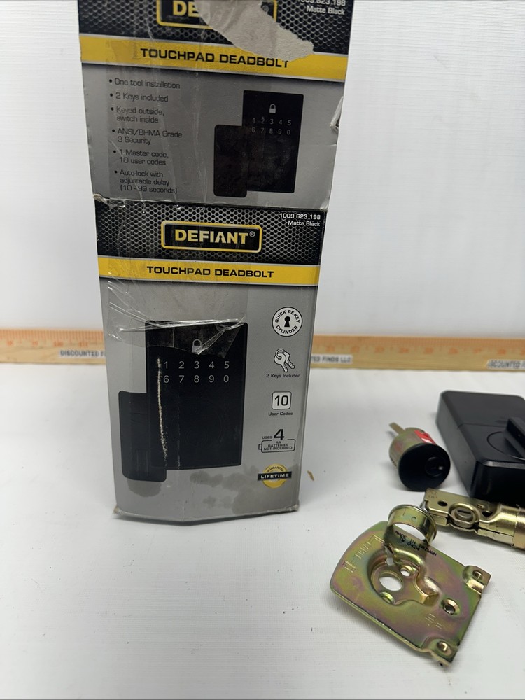 UPC: 0050134008540 Material: Metal Features: Adjustable Backset, Easy to Install, Electronic, With Key Cross Bore Diameter: 1 in gtin13: 0050134008540 Country/Region of Manufacture: Taiwan Model: 1009 623 198 Style: Modern Items Included: Hardware, Instructions, Key Brand: Defiant Mounting: Universal Finish: Matte Number in Pack: 1 Suitable For: Front Door, Front Entrance Door, Residential Color: Matte Black Door Handing: Universal/Reversible Manufacturer Warranty: None MPN: 1009 623 198 Type: Touchpad Deadbolt ANSI Grade: ANSI Grade 3 (Good)