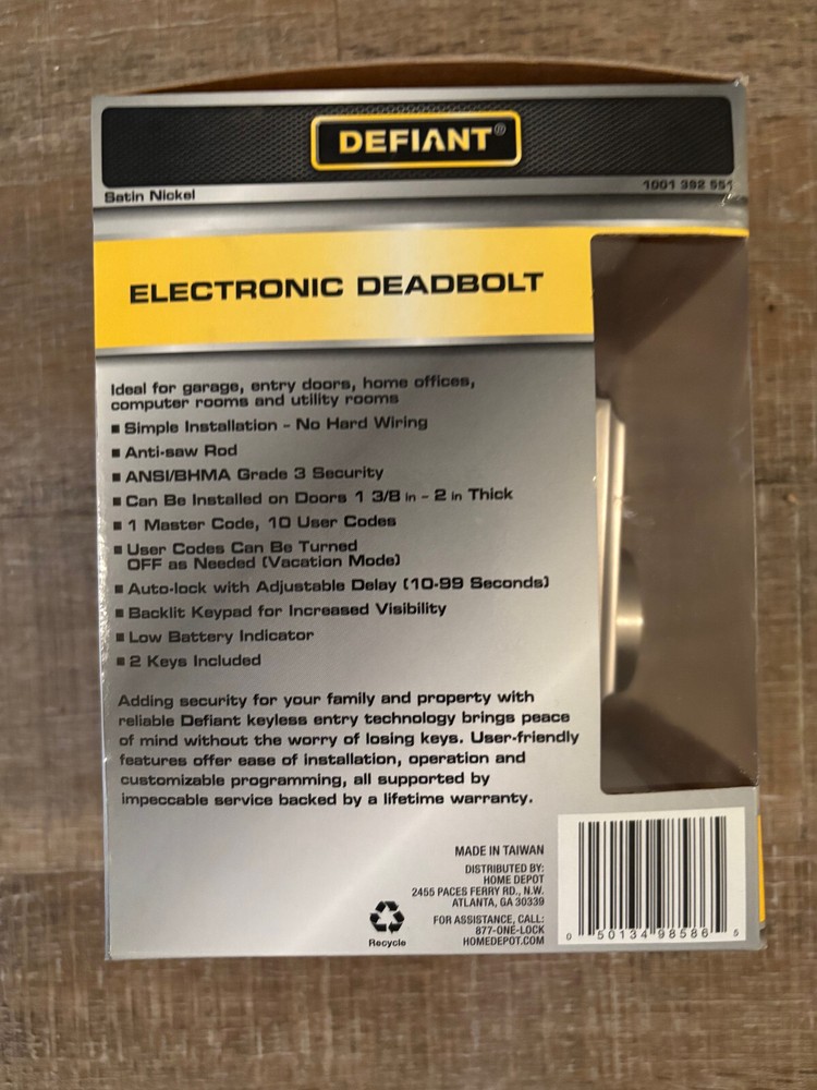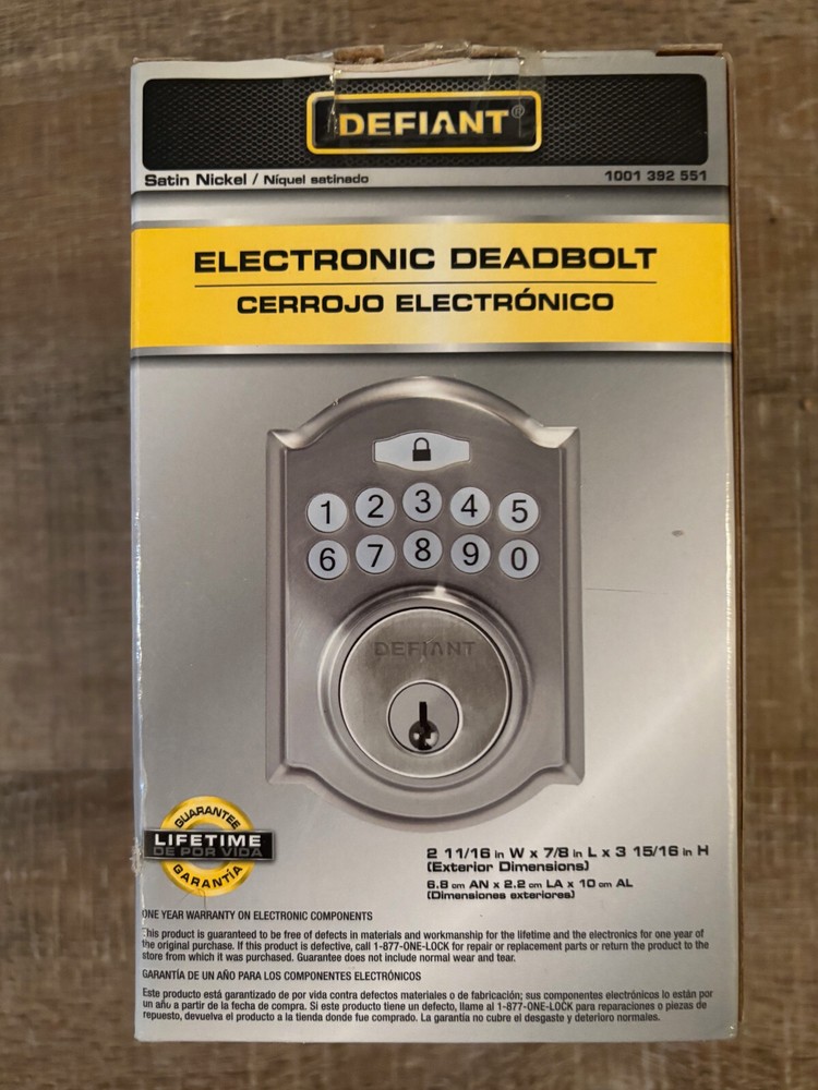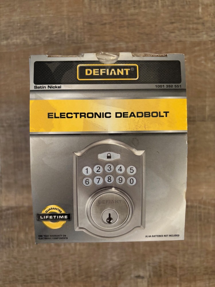 The DEFIANT Electronic Keypad Deadbolt in Satin Nickel is a modern and stylish addition to any door. Made from brass and nickel, this deadbolt features a 1-inch throw length and is suitable for a variety of doors including residential, commercial, and security doors. With easy installation and electronic features, this deadbolt provides security and convenience for your home or business. The package includes hardware, instructions, and a key, ensuring you have everything you need to upgrade your door with this ANSI Grade 3 rated product from Defiant.