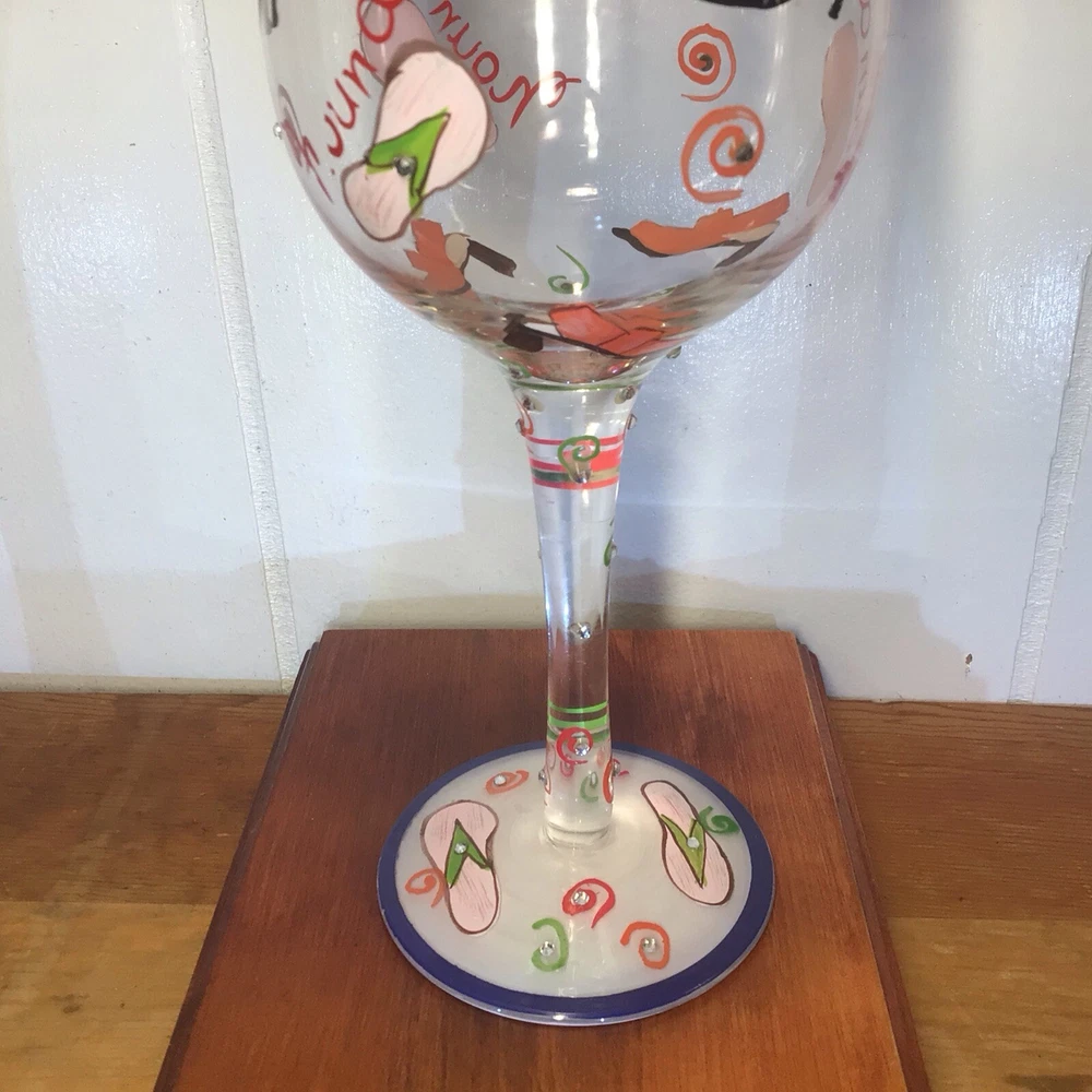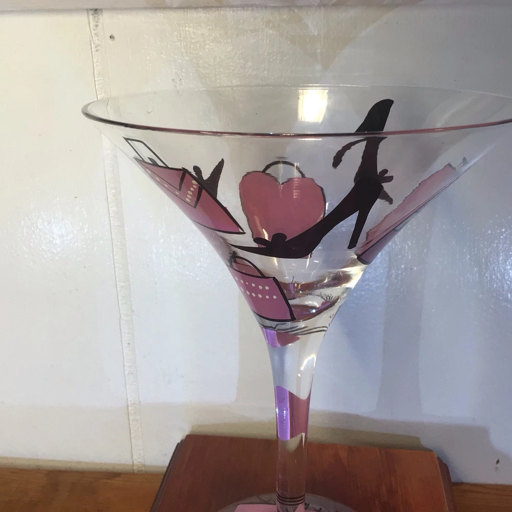 This is a set of two hand-painted crystal wine glasses with a contemporary abstract design featuring shoes and purses. Each glass has a round shape and a capacity of 15 oz. The brand is Fifth Avenue Crystal ( wine glass) and Lolita ( martini glass). These glasses are ideal for all occasions and are perfect for adults.