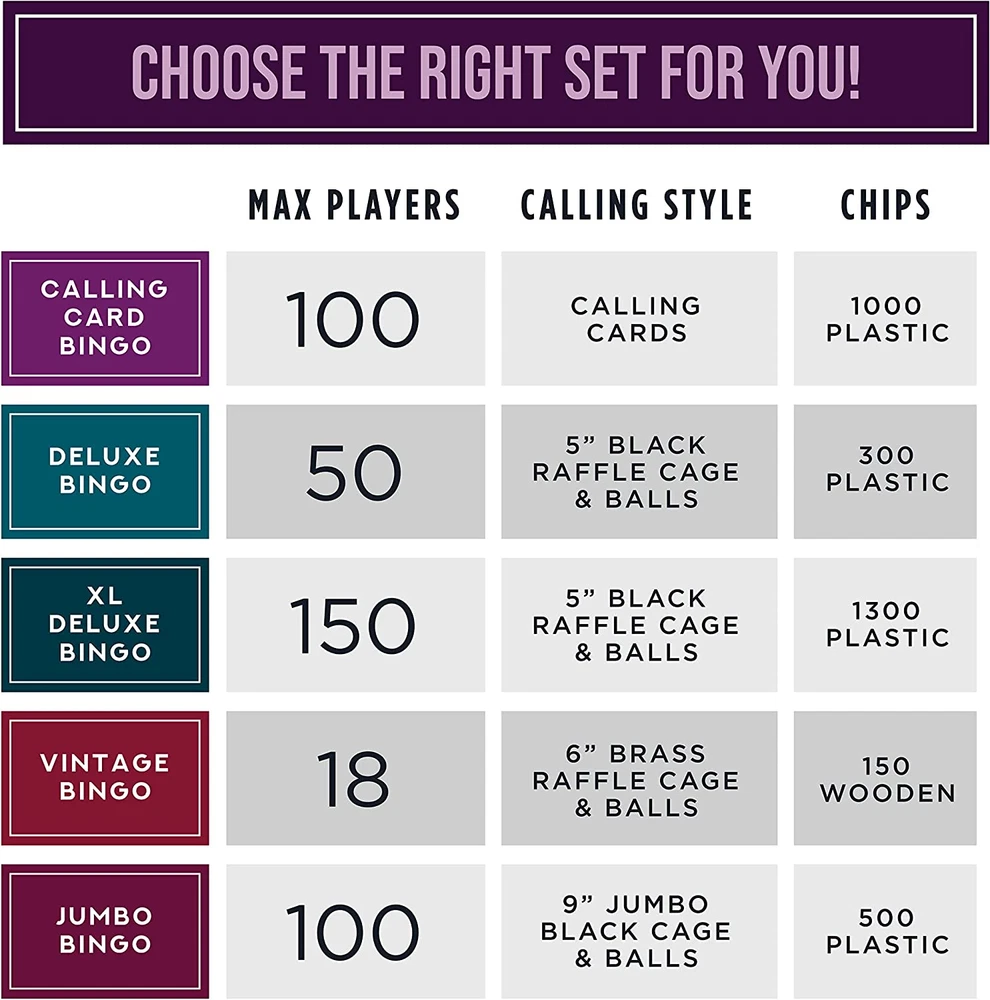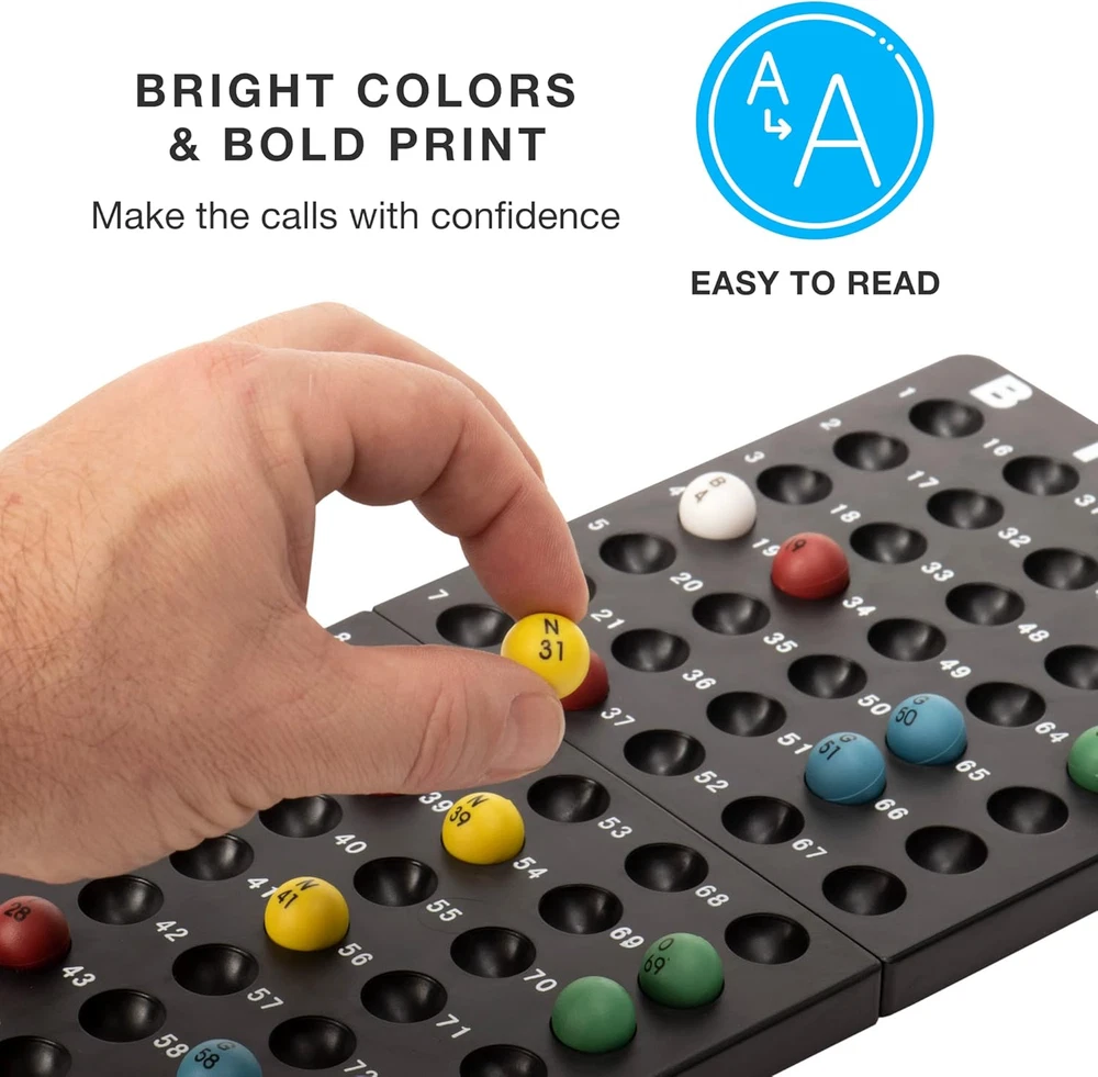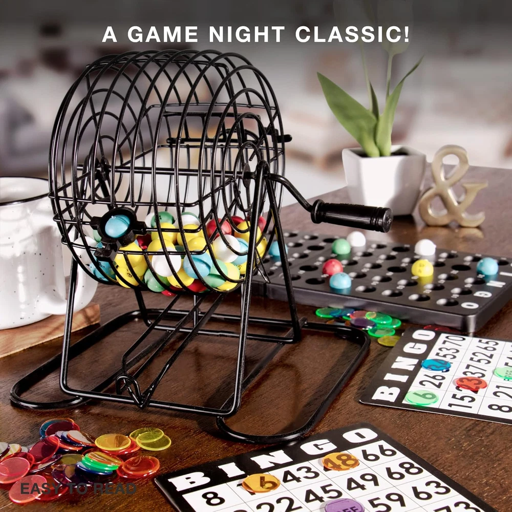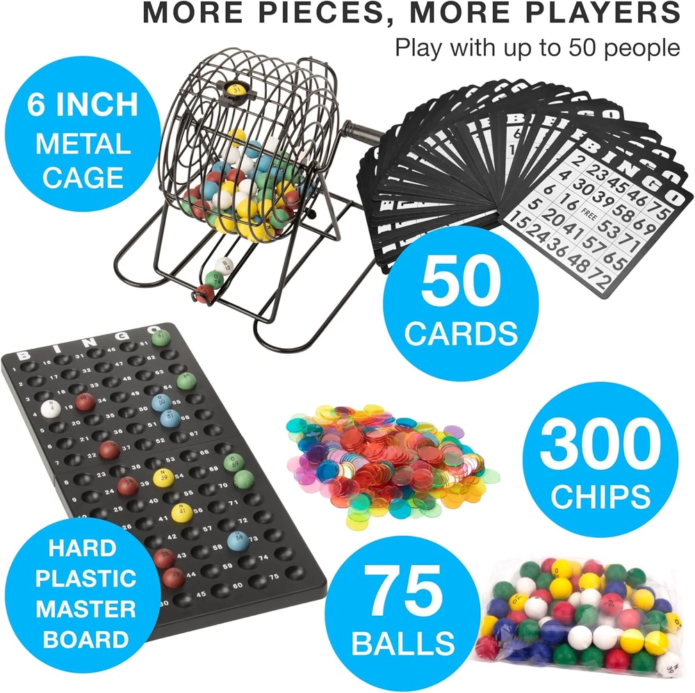 Free Expansion Set - Most starter Bingo sets offer just 18 bingo cards and 100 bingo chips, barely enough for 4 games of cover-all. Our Deluxe Bingo Set with Free Expansion Pack includes an additional 32 cards and 200 chips. That's a total of 50 cards and 300 chips! More Pieces, More Players, More Bingo - Our Deluxe Bingo game set is great for large groups, parties, classrooms, or experienced players playing multiple cards at once Pedal to the Metal - Our metal Bingo cage is superior to plastic cages. It spins smoothly and won't crack with use. And, instead of flimsy paper, our Bingo Cards are printed on reusable card stock Easy Reading - Our colorful Bingo Balls have a proprietary clear coating that competitors don't, which prevents the letters and numbers printed on from rubbing off over time Why You'll Love It - Because it suits so many players, our Deluxe Bingo Set is perfect for community centers, school classrooms, retirement homes, firehalls, family games for Christmas, game night, anywhere a game of Bingo is sure to get started Product Description More Pieces. More Players. More Bingo. This deluxe Bingo Game is ideal for larger parties and groups, offering more playing pieces than most sets. Each luxury set comes with 50 Bingo cards, 300 Bingo chips, a Bingo board, a metal cage, 75 colorful plastic balls and instructions for different Bingo game variations. The Bingo board is made from two sturdy plastic pieces that hook together at the top and bottom. Each board measures 13 inches long and 5.5 inches wide. The boards hold a combined total of 60 plastic balls, each measuring 0.33 inches in diameter. Why You'll Love It: Our superior quality, metal Bingo cage is simple to use. Just give it a spin and watch as the balls roll down the metal slot for number callouts. The cage is 6" tall, including the base. The Bingo cards are made from heavy cardboard, measuring 4.88" x 5.25", making them highly durable and easy to read. You can use and reuse the cards after each game. Our set packs 300 multi-color Bingo chips to go alongside the 50 cards, while most Bingo sets rely on cheap fold-over numbers. Includes Bingo Boards, Balls, and Cage! There are 50 blue Bingo cards included in each set, along with 300 multi-color Bingo chips, enough for 12-15 players to play. For BIG Bingo Groups! Use the 300 Bingo chips, purchase more chips, or use anything for extra pieces, and you're ready to host a massive 50 player Bingo game. Easy to Read The brightly-colored Bingo balls feature jumbo-sized numbering for easy reading. There are 15 balls of each red, blue, green, yellow, and white, 75 balls in total. It's becoming a prize possession of many Bingo enthusiasts and board gamers alike. EVERYTHING You Need for Bingo Night Enough Cards for 50 Players 300 Multi-Color Chips 75 Total Bingo Balls in 5 Colors! The King of Bingo! From bingo markers to entire bingo game sets, Royal Bingo Supplies covers all needs related to playing bingo from full sets with cages, to even replacement balls and counters in case you're running low. Royal Bingo Supplies believes that the game of bingo brings friends and Families together. When you buy a product from Royal Bingo Supplies, you can always count on a quality item that will enhance any bingo playing experience!