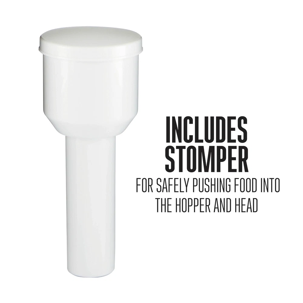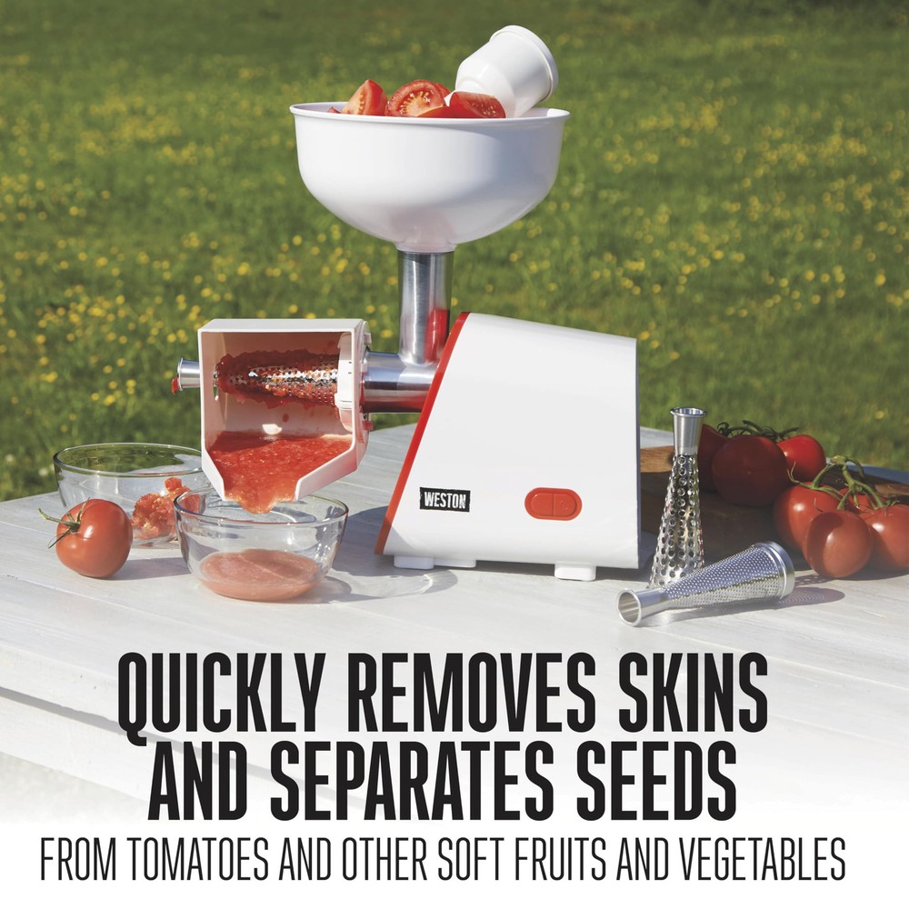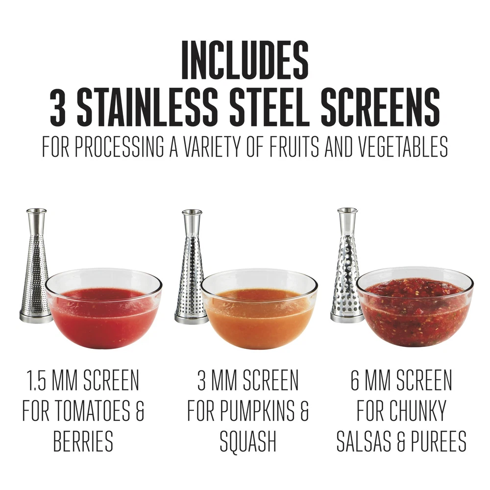 There's nothing that says summer more than a vine-ripened tomato, and Deluxe electric tomato strainer allows you to process and preserve the flavors of summer to enjoy the whole year through. And it's not for just tomatoes. 3 strainer sizes (tomato/Berry - 1 mm), (Pumpkin -3 mm), (salsa - 6mm) makes it easy to process large batches of berries, Pumpkins and other fruits for canning sauces, jams & salsa. A powerful 250 watt motor makes easy work of processing, and a reverse function prevents jamming. The large hopper holds a gallon of produce. QUICKLY REMOVES SKINS AND SEPARATES SEEDS: The electric tomato strainer is great for making homemade sauces, purees, jellies, salsa and more. It quickly removes skins and separates seeds from tomatoes and other soft fruits and vegetables without coring. POWERFUL 250 WATT MOTOR: The powerful 250 watt motor on the electric tomato press has two speeds. Use forward speed to remove skins and seeds from fruits and vegetables. The reverse speed helps prevent jamming. 1 GALLON HOPPER: The 1 gallon hopper lets you process large batches of fruits and vegetables without slowing down. It's perfect for preserving garden harvests or produce purchased in bulk. INCLUDES 3 STAINLESS STEEL SCREENS: The tomato strainer comes with a 1.5mm multipurpose screen for tomatoes and berries, a 3mm screen for pureeing larger vegetables like pumpkins and squash, and a 6mm screen for making chunky salsas and purees. INCLUDES STOMPER: Use the stomper to safely push pieces of food into the hopper and head of the tomato strainer and sauce maker.