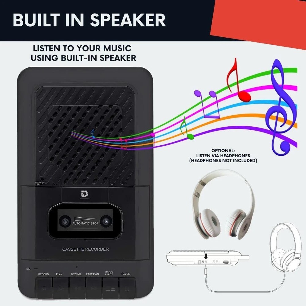 Easy to Use: Retro cassette Deck: Pull our your old vintage cassettes! and relive the old memories! Large easy to press buttons to playback your old favourite tapes! The perfect gift for the elderly! Record your voice to cassette: Use the included External Microphone or built-in Built-in Condenser Microphone to capture your own sound, like interviews or music shows. Record Media to cassette: Use the included Aux-In Cable, you can record from your smartphone, laptop, or tablet to cassettes! (Device must have headphone out jack) Portability: The Built-In carrying handle shoebox cassette player makes it easy to carry around and use on the go. Use the Included AC Adapter or 4 C Batteries (Not Included) Included in Package: Cassette Recorder with Built in Speaker, External microphone, AC Adapter, Aux in Cable.