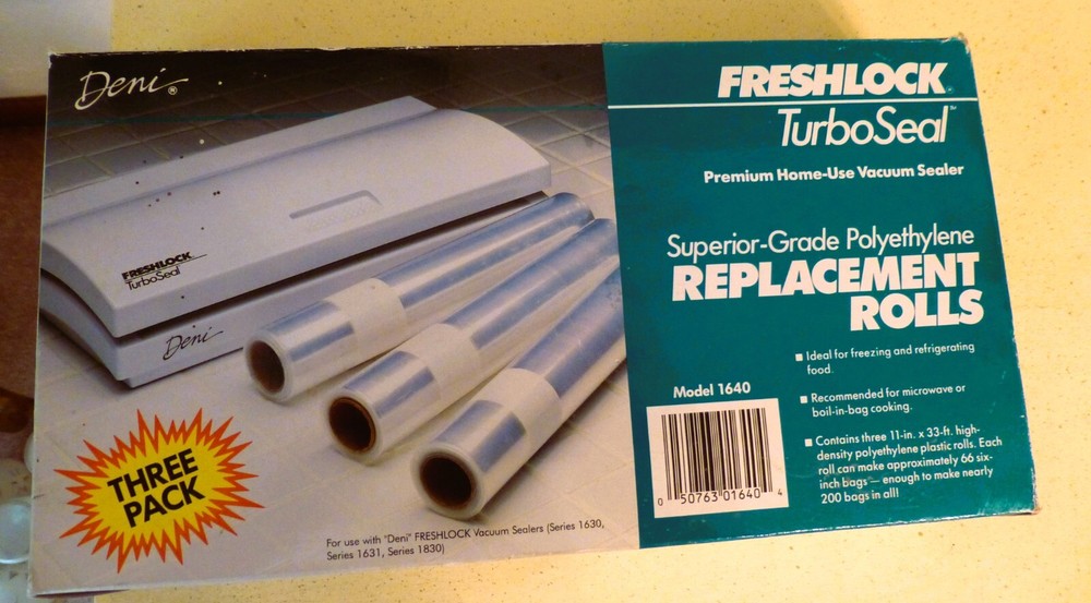 Deni Freshlock Turbo Seal Vacuum Sealer Food Storage Replacement Rolls 3-Pack as shown in photos. Open box or unsealed. Few scuffs on box, see photos. Never used. Complete. For used with Deni Freshlock vacuum sealers series 1630, 1631, 1830. See photos. If you win and aren't 100% satisfied, we will gladly refund your winning bid. We estimate shipping and it will never be more and may be less than quote. Tracking included in your shipping fee. Free local pickup or delivery. E-mail us if any questions. Check our feedback history and BID WITH CONFIDENCE. Thanks, and good luck! Have a great day! Ships to USA