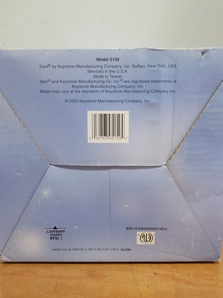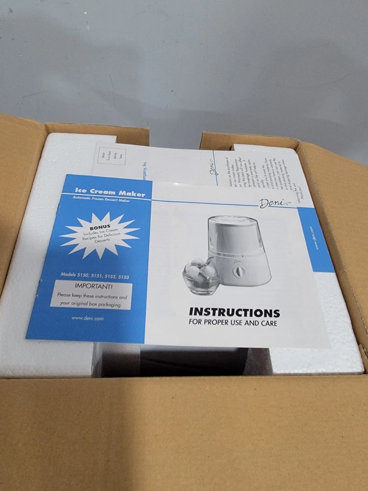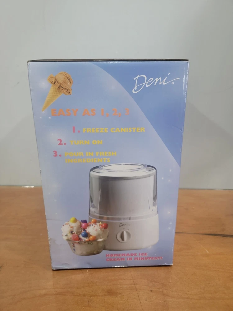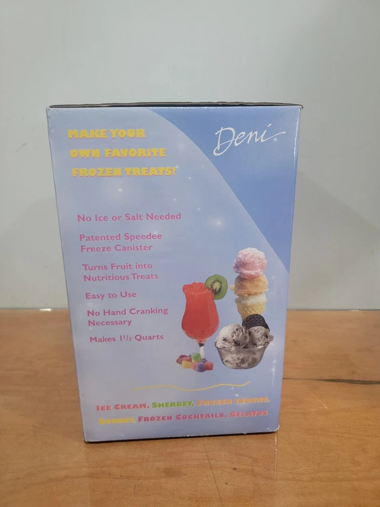 Deni Fully Automated Fast Ice Cream Maker 10 Servings 1.5 Quart 28 Recipes New Deni Fully Automated Fast Ice Cream Maker New in Box • makes 10 servings • 1/1/2 qt • 10 to 20 minutes to make ice cream • 28 recipes No ice or salt needed Thank you
