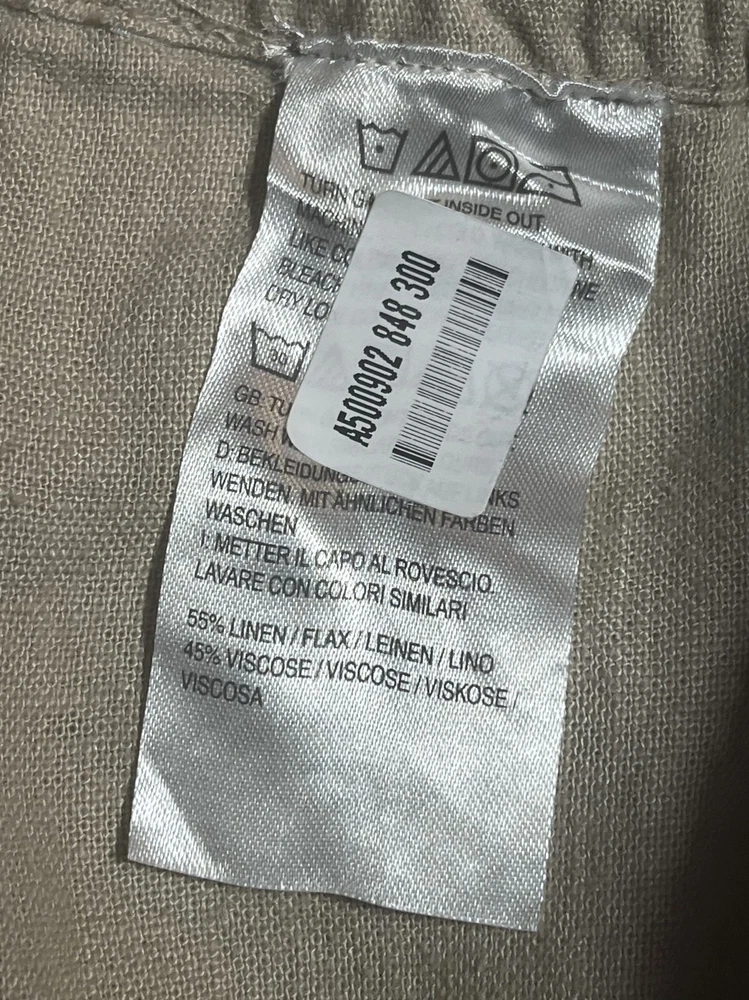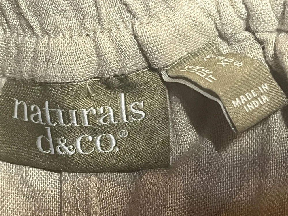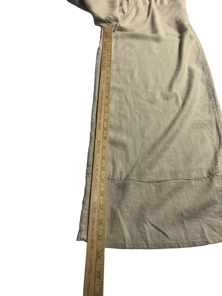 Fabrication: woven Features: side buttons at hem, elastic waistband, side pocket Rise: slightly below the waist Fit: semi-fitted; follows the lines of the body with added wearing ease Leg Shape: wide leg; widens fashionably from thigh to leg opening Inseam: missy/plus inseam 28" Content: 55% linen/45% viscose Care: machine wash, tumble dry Imported Features: • Side Button Ankle Size: Womens XS Condition: New Without Tags