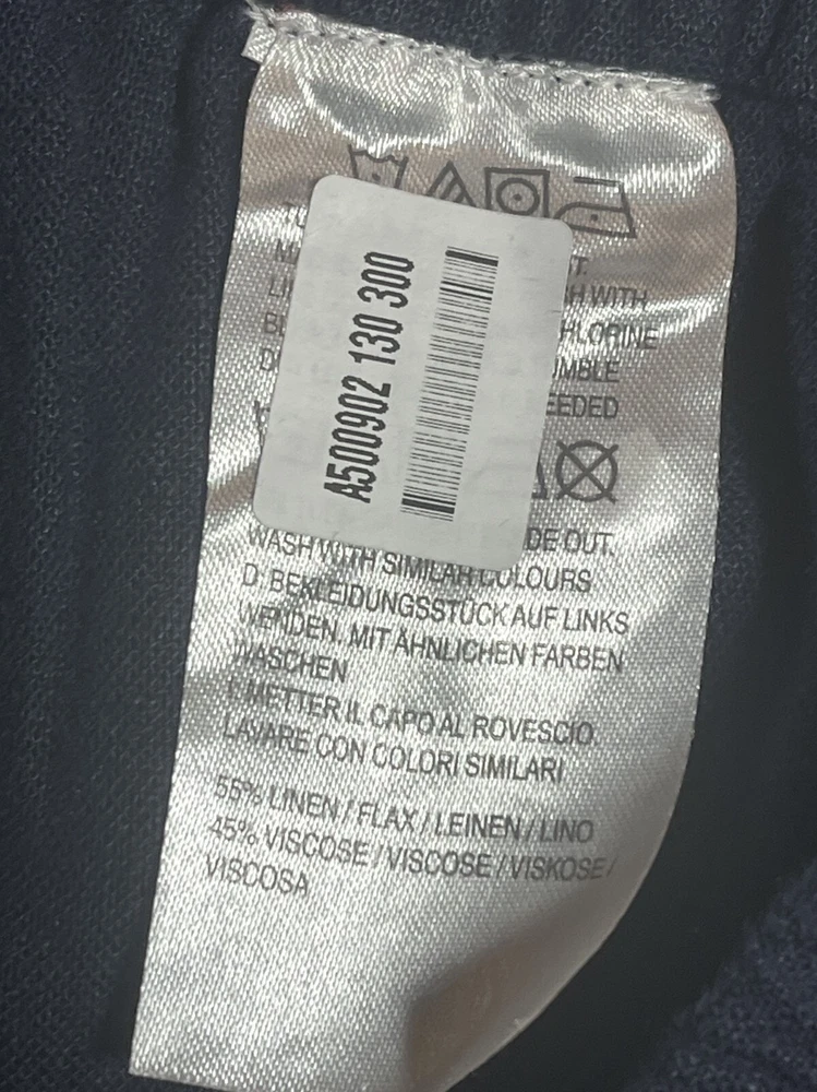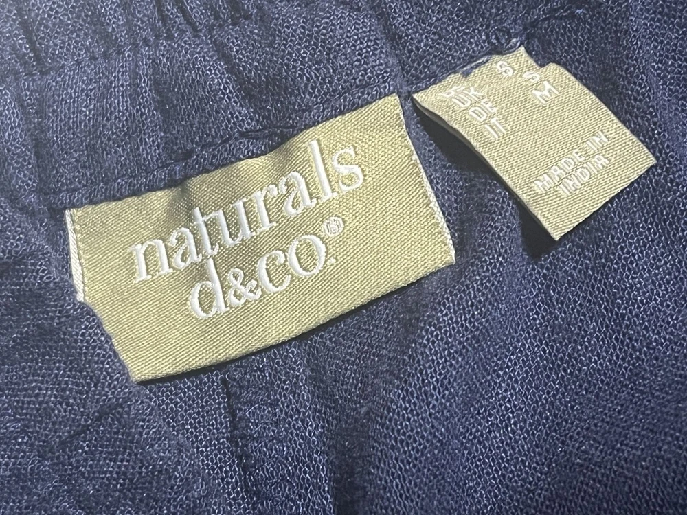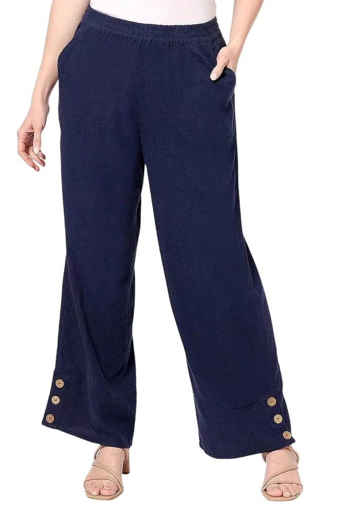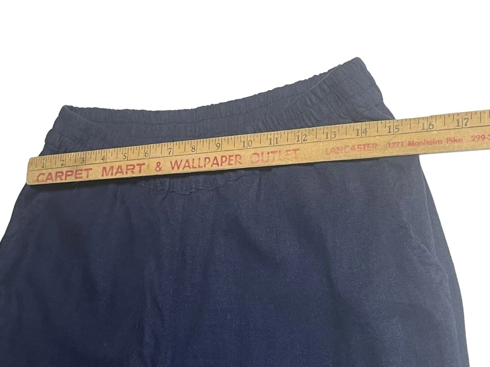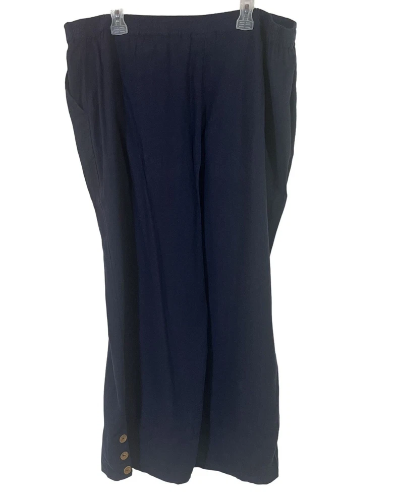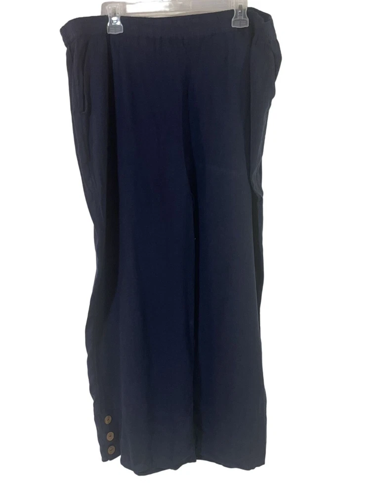 Fabrication: woven Features: side buttons at hem, elastic waistband, side pocket Rise: slightly below the waist Fit: semi-fitted; follows the lines of the body with added wearing ease Leg Shape: wide leg; widens fashionably from thigh to leg opening Inseam: missy/plus inseam 27 1/2" Content: 55% linen/45% viscose Care: machine wash, tumble dry Imported Features: • Side Button Ankle Size: S Condition: New Without Tags