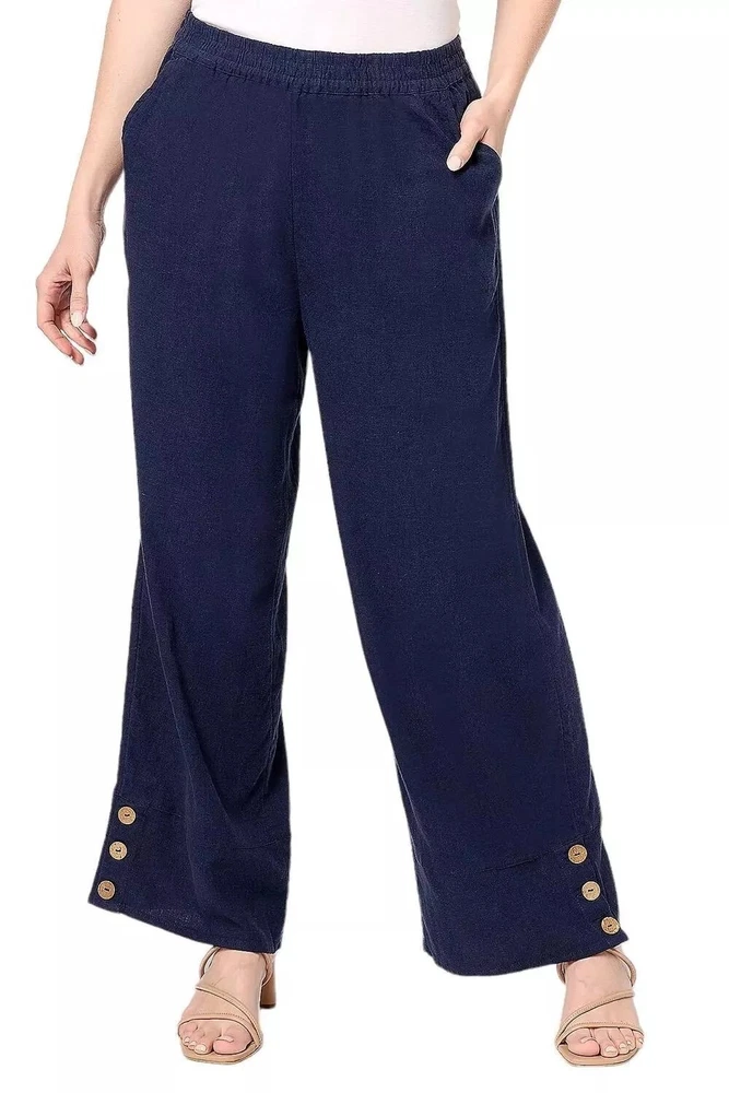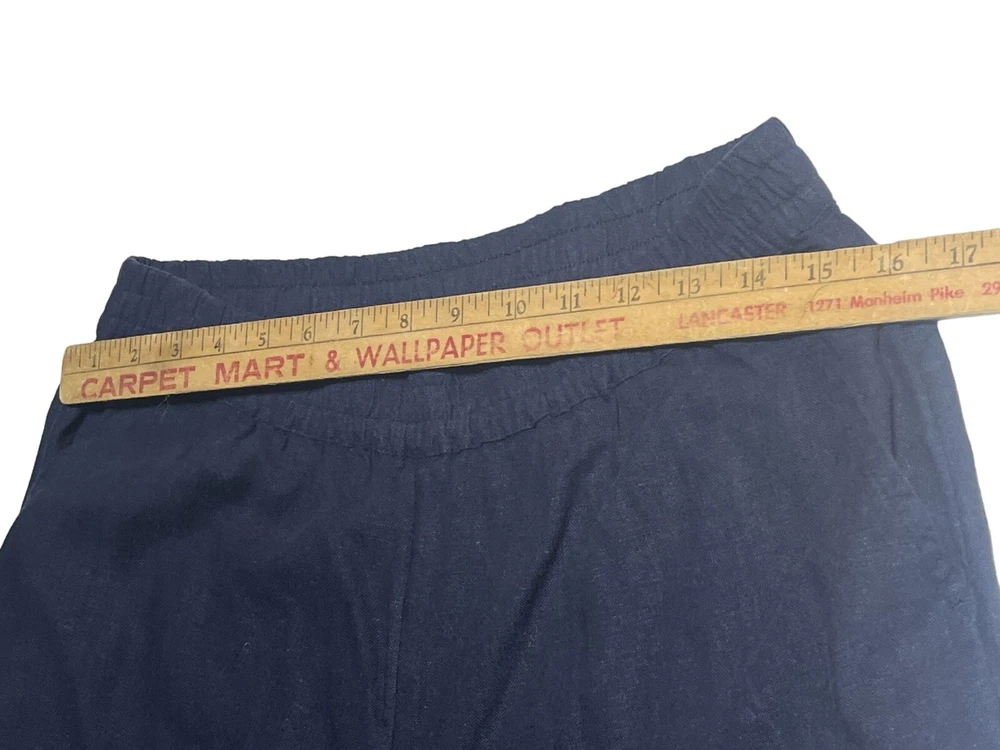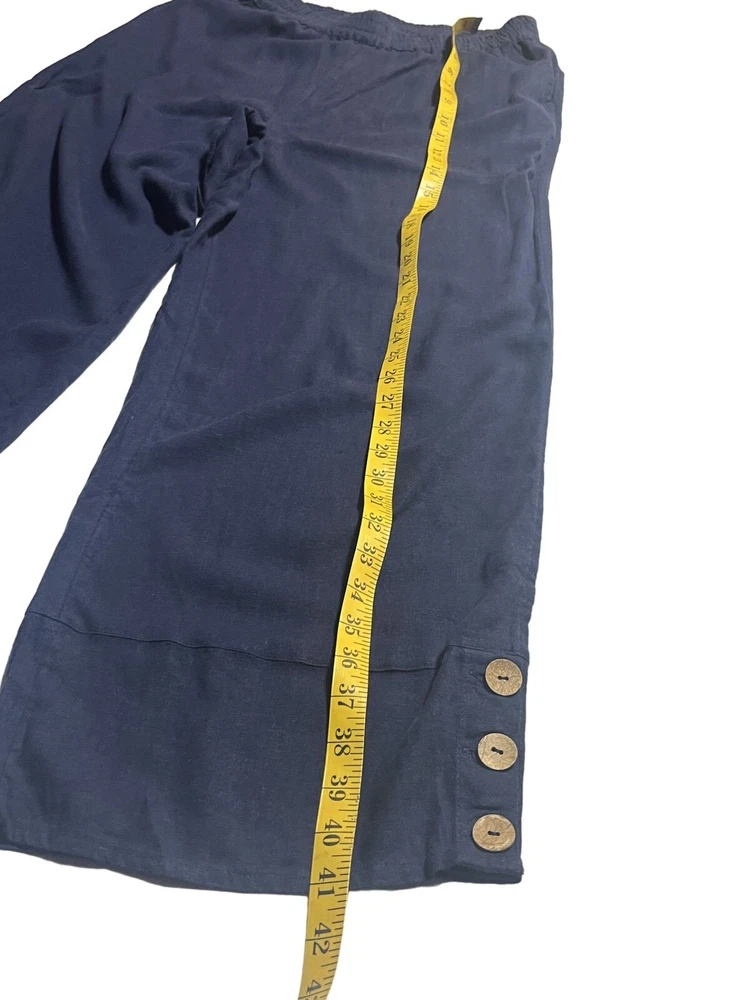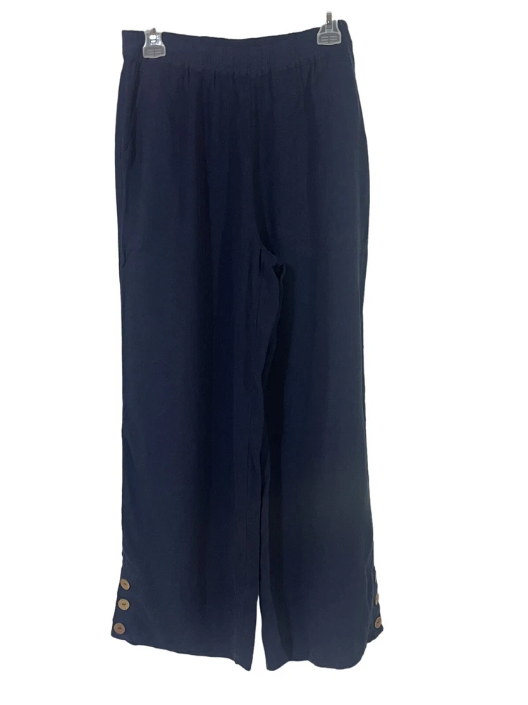 Fabrication: woven Features: side buttons at hem, elastic waistband, side pocket Rise: slightly below the waist Fit: semi-fitted; follows the lines of the body with added wearing ease Leg Shape: wide leg; widens fashionably from thigh to leg opening Inseam: missy/plus inseam 28" Content: 55% linen/45% viscose Care: machine wash, tumble dry Imported Features: • Side Button Ankle Size: Womens XS Condition: New Without Tags
