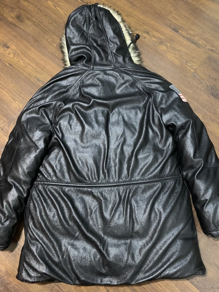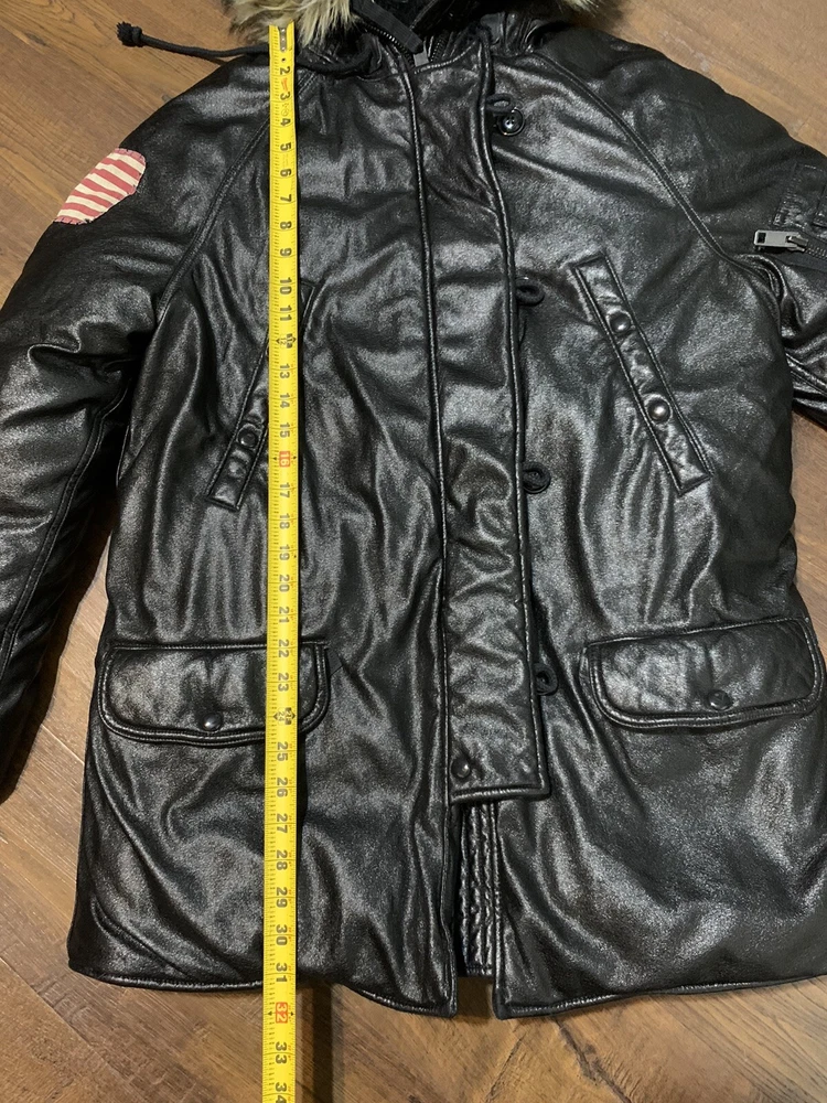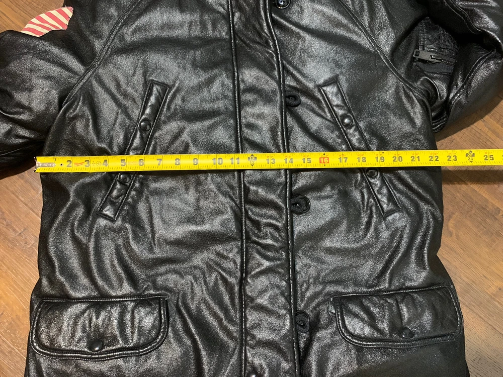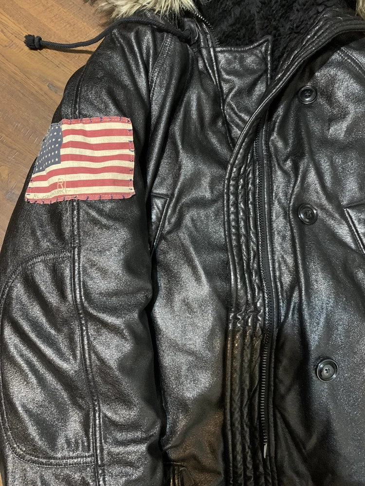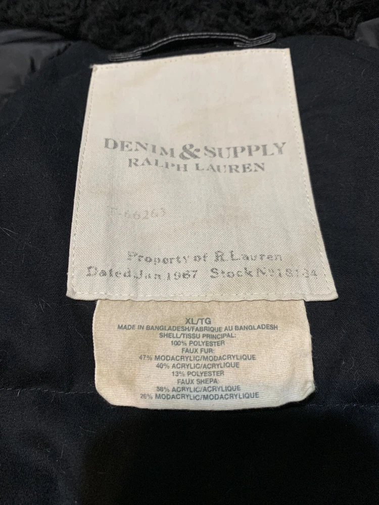 Denim & Supply Ralph Lauren Black Parka Coat Sz. XL NWOT. Showing....Denim & Supply Ralph Lauren black parka coat with faux leather and fur, size XL. Measures approx. 33" length, 27" sleeves, 23" pit to pit. American patch flag on sleeve, detachable hood, polyester and acrylic, lightweight and warm. NWOT, excellent condition.
