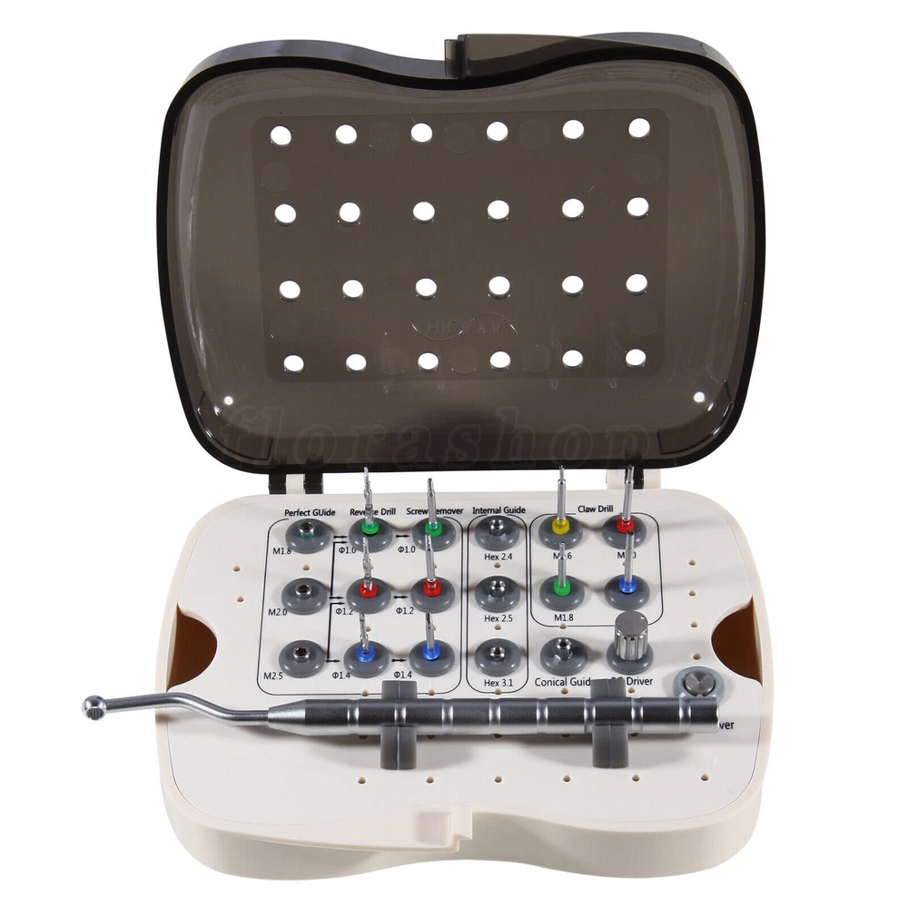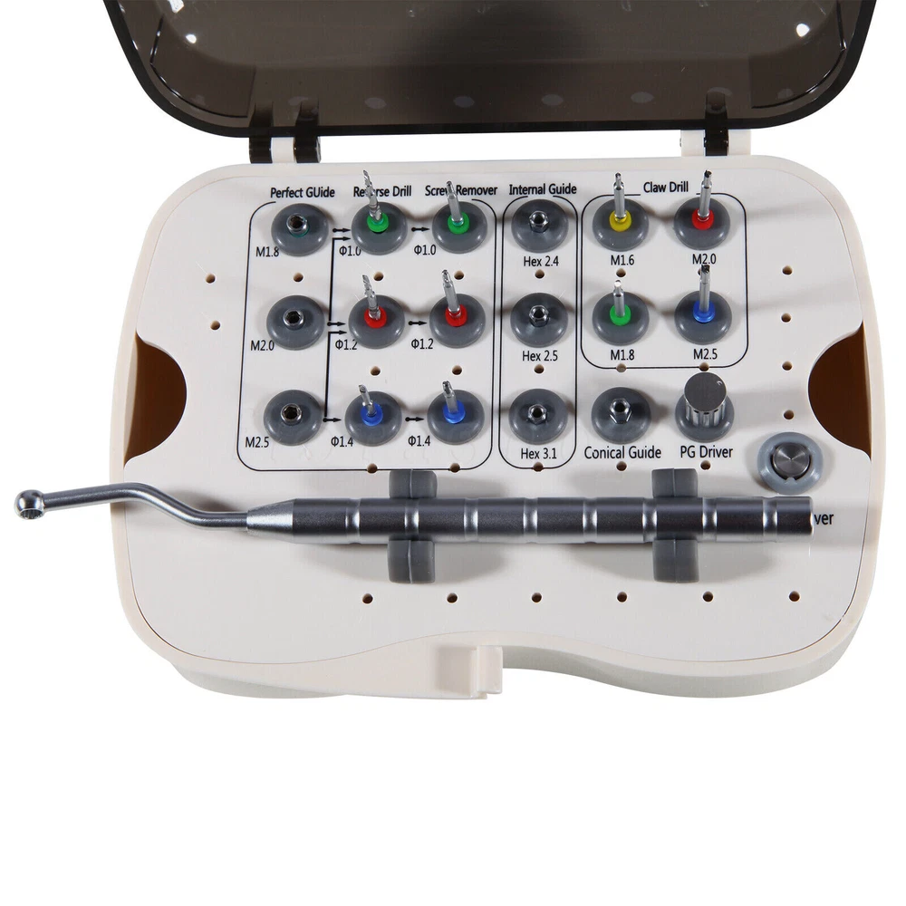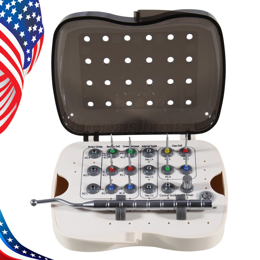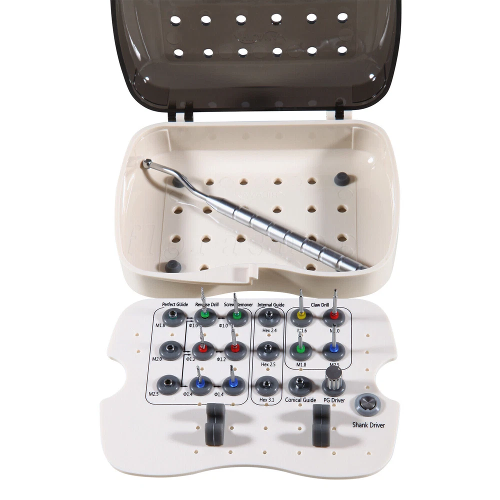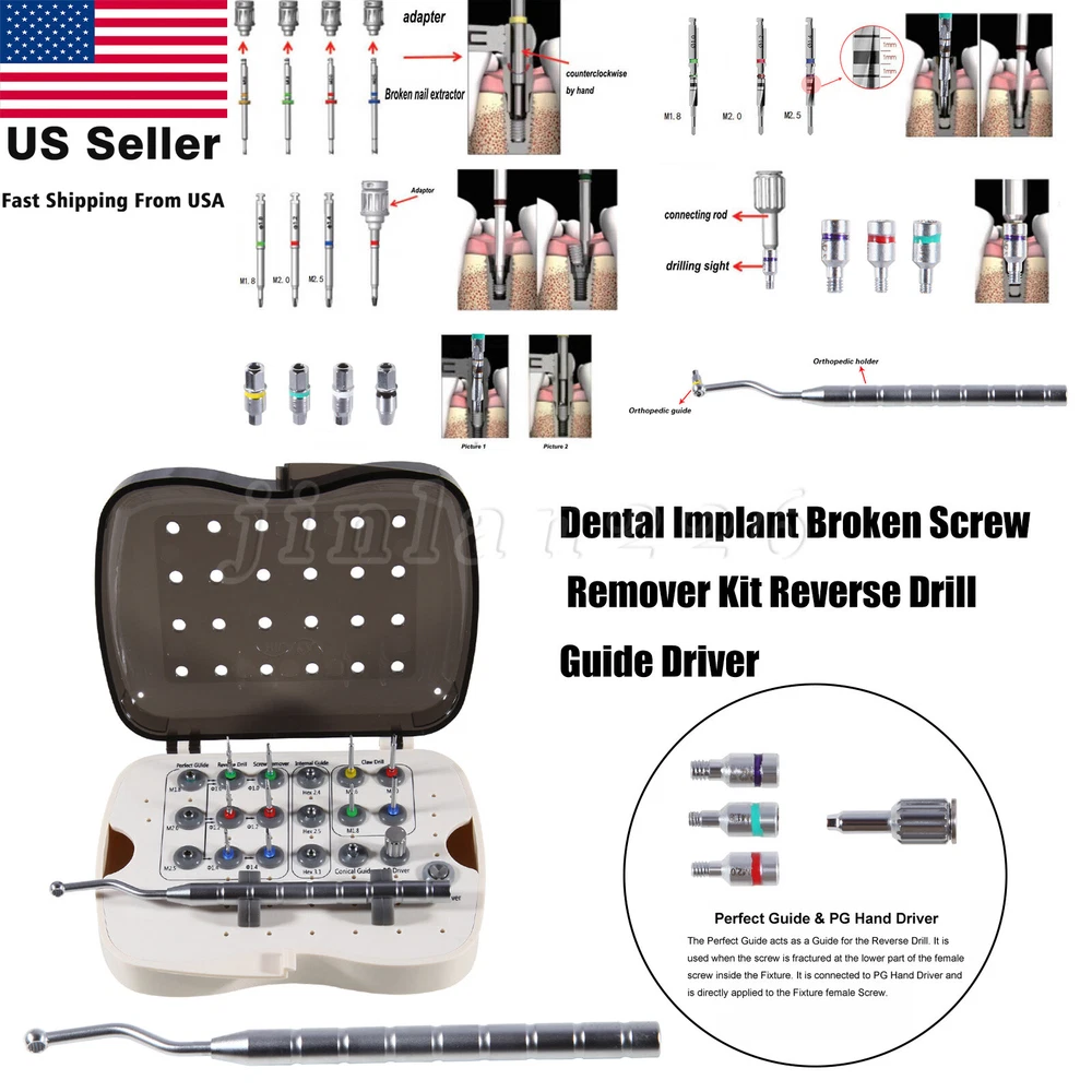 Dental Implant Screw Remover Kit Fractured Broken Surgical Tool NeoBiotech SR Screw Remover Kit is a surgical tool developed in order safely and quickly to remove screws that have become fractured inside an implanted Fixture for various reasons. After removing the Screw, a new Abutment may be connected to the Fixture. Remove Fractured Screw, Screw Remover! No Worries About Fractured Screw. Components 1. Claw This is a surgical tool that removes a screw that has become fractured inside the Fixture. After selecting the size that is appropriate for the size of the screw that is to be removed, it must be used by connecting a guide to the Fixture (Conical/Internal/External Guide). Then it is connected to the Shank Driver, and the fractured screw can be removed by rotating by hand in the reverse direction. If the fractured screw cannot be removed using the Claw, it must be removed using the Reverse Drill and the Screw Remover. Product Name Fractured Screw size Product Name Fractured Screw size CD16 M1.6 CD20 M2.0 CD18 M1.8 CD25 M2.5 2. Reverse Drill - This is a tool that creates a hole on the fractured face of the Screw that will be used by the Screw Remover. - After selecting the appropriate Reverse Drill for the size of the screw that needs to be removed, it must be used by connecting a guide for the fi xture (Perfect/ Conical/Internal/ External Guide). The depth of the drill can be adjusted from 1 mm to 3 mm, because the Drill body has markings. - The removal of an M1.6 size Screw Should utilize the Claw. - Although diff erent manufacturers produce diff erent sizes of abutment screws, except in rare cases, typically they utilize screws of Size M1.6, M1.8, M2.0, or M2.5. (‘M’ stands for a metric screw. The number indicates the external size of the screw. For example, “M1.6 Screw” indicates that it is a metric screw the external diameter of Wh ich is 1.6 mm). Product Name Diameter(Ø) Fractured Screw size RCD10 Ø 1.0 M1.8 RCD12 Ø 1.2 M1.8 RCD14 Ø 1.4 M1.8 3. Screw Remover - This is a device that removes a fractured screw. Insert a Screw Remover that is appropriate for the size of the hole that has been formed using the Reverse Drill and rotate at a low speed (at or below 80 rpm) in the reverse direction. - The Screw Remover was designed in a tapered shape so as to increase, as it turns, the amount of friction, which is necessary to loosen the Screw. Product Name Diameter (Ø) Fractured Screw size SR10 Ø 1.0 M1.8 SR12 Ø 1.2 M2.0 SR14 Ø 1.4 M2.5 4. Shank Driver - This is a surgical tool that was designed to be connected to the Screw Remover to allow the use of the hand, Torque Wrench, or Ratchet. Product Name Standard Applicable Products SHD00 for Hand or Ratchet Screw Remover (SR10, SR12, SR14) 5. Perfect Guide & PG Hand Driver - The Perfect Guide acts as a Guide for the Reverse Drill. It is used when the screw is fractured at the lower part of the female screw inside the Fixture. It is connected to PG Hand Driver and is directly applied to the Fixture female Screw. - The Perfect Guide can be safely used because it has a stop structure inside that prevents the Reverse Drill from drilling more than 2 mm. 6. Conical, Internal, External Guide - They act as the Guide when using the Reverse Drill. They are used when the Perfect Guide cannot be used, or if the screw was fractured at a location deeper than 2 mm into the lower part of the female screw inside the Fixture. - The Guide appropriate for connecting to the Fixture must be selected. 7. SR Driver Holder This can be easily affixed to the Fixture by connecting it to the 3.5 Double Hex part of the Conical, Internal, or External Guide. Payment 1.We only accept payment by Paypal. 2.Please make sure you PayPal account is valid prior bidding. Feedback We commited ourselves to your 100% satisfaction both with our goods and services. 1. Please leave me FIVE star POSITIVE feedback if you are satisfied with our items. 2. Please CONTACT me immediately before leave us neutral feedback or negtive feedback, We will try our best to resolve any problem for you untill you are satisfied. Pls let me know before taking any action, because your action will has an important impact on our shop. So pls give me a chance to offer the best sollution for you!! About US We're one of the largest online dental suppliers based on our own qualified manufacturers in China. We supply all dental items with very nice qualities and the best reasonable prices for worldwide dentistry students, dentists and other professionals. Looking forward to our friendly & win-win cooperation. Our working time: Monday - Friday 9:00 AM - 5:30PM (Beijing) Company name: Dreamland Technology Ltd City, State: Beijing, China Telephone number: 0371-56645662 The following FDA Disclaimer is required. REFERENCE: Statement:The sale of this item may be subject to regulation by the U.S. Food & Drug Administration and state and local regulatory agencies.You can bid on this item if you are an authorized purchaser. If the item is subject to FDA regulation, We will verify your status as an authorized purchaser of this item before shipping of the item.If you have questions about legal obligations regarding sales of medical devices, you should consult with the FDA's Center for Devices and Radiological Health.(This dental items is not meant to replace your doctor diagnostic. It is mainly for your piece of mind and comfort.) This item has been cleaned and treated according to the manufacturer's instructions. FDA for Curing Light: 510(K) Number: K192233, Regulation Number: 21 CFR 872.6070, Product Code: EBZ FDA for Handpiece: 510(K) Number: K181691, Regulation Number: 872.4200, Classification Product Code: EFB, Subsequent Product Code: EGS FDA for Scaler: 510(K) Number: K163414, Regulation Number: 872.4850, Product Code: ELC Copyright © jinlan226