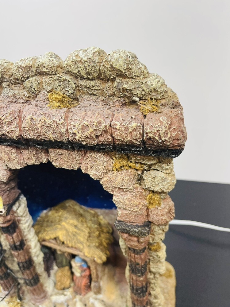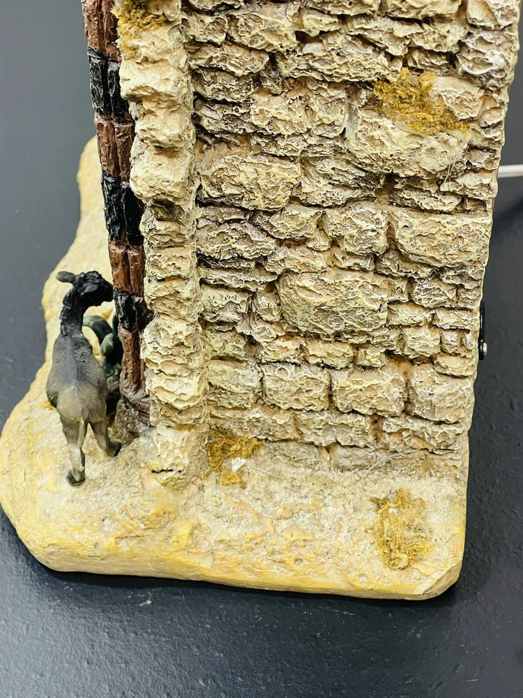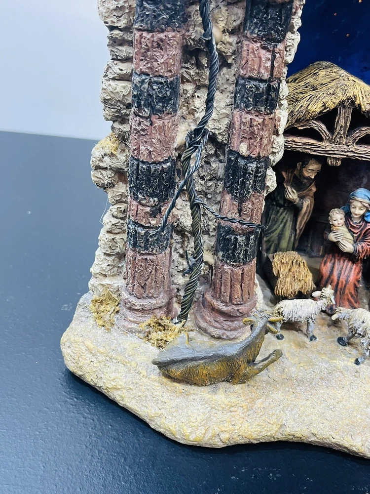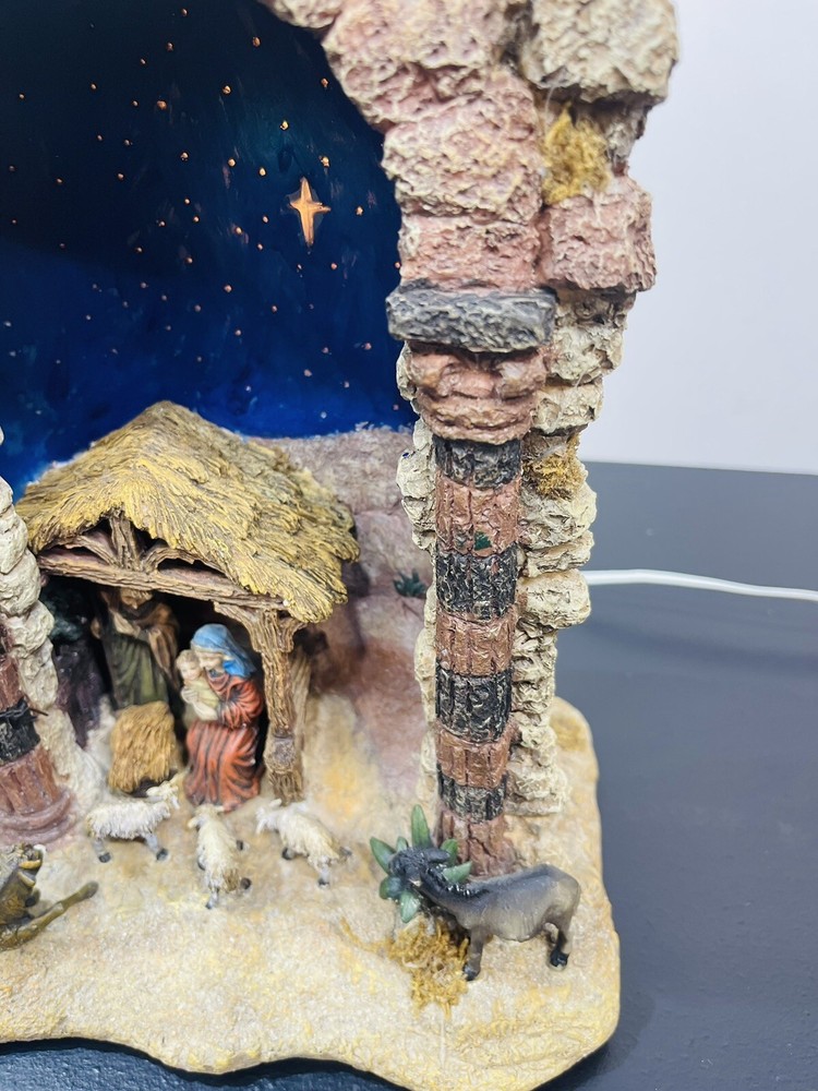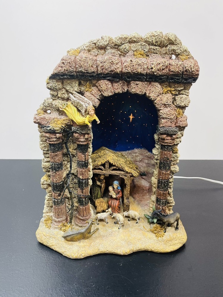 The department 56 starry night over Bethlehem is in good working condition. It does have a couple areas that are damaged, such as the donkeys tail and the cows horn , as well as one spot on the side that is missing a bit of the moss . it measures 13 1/2 inches high by 11 inches long by 6 inches wide . No box.
