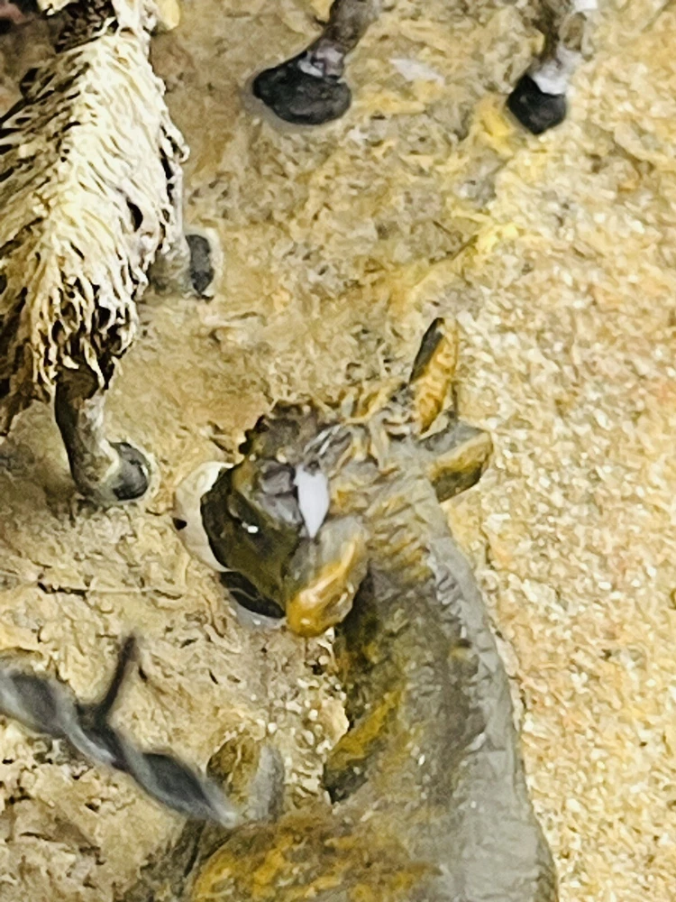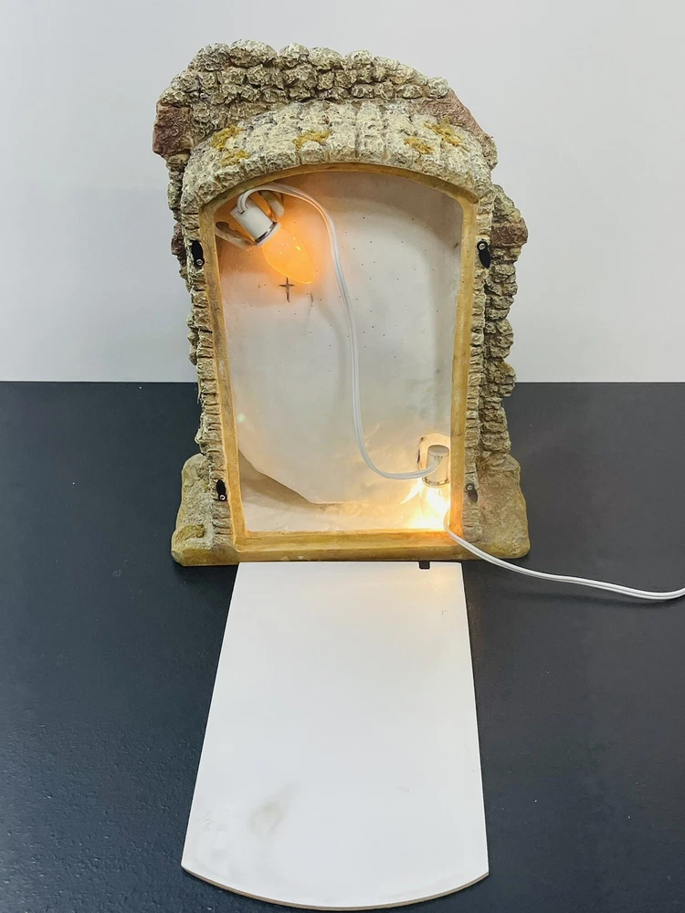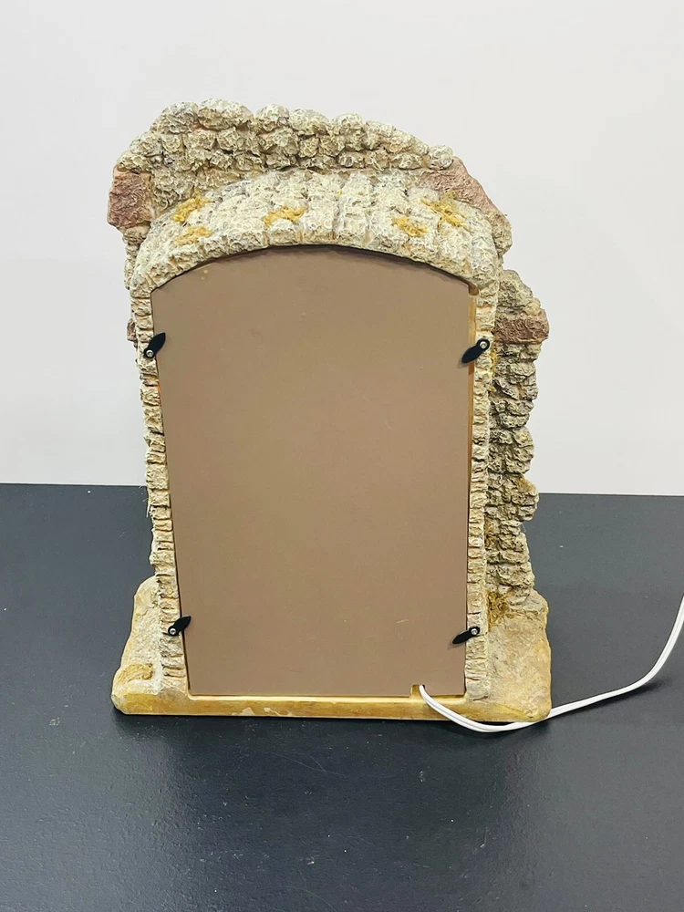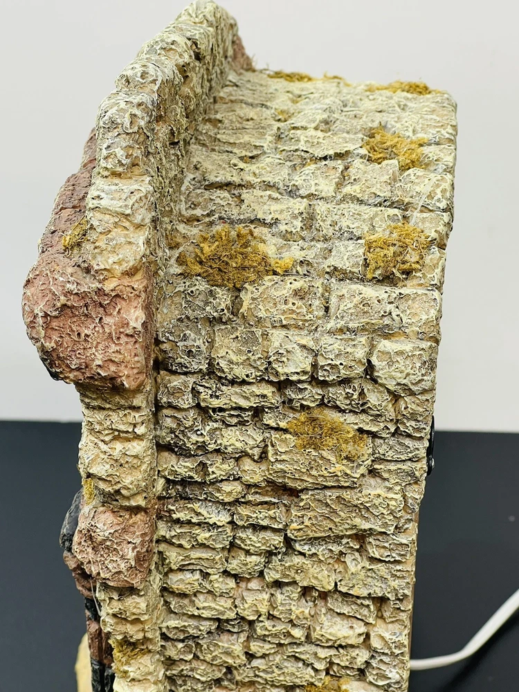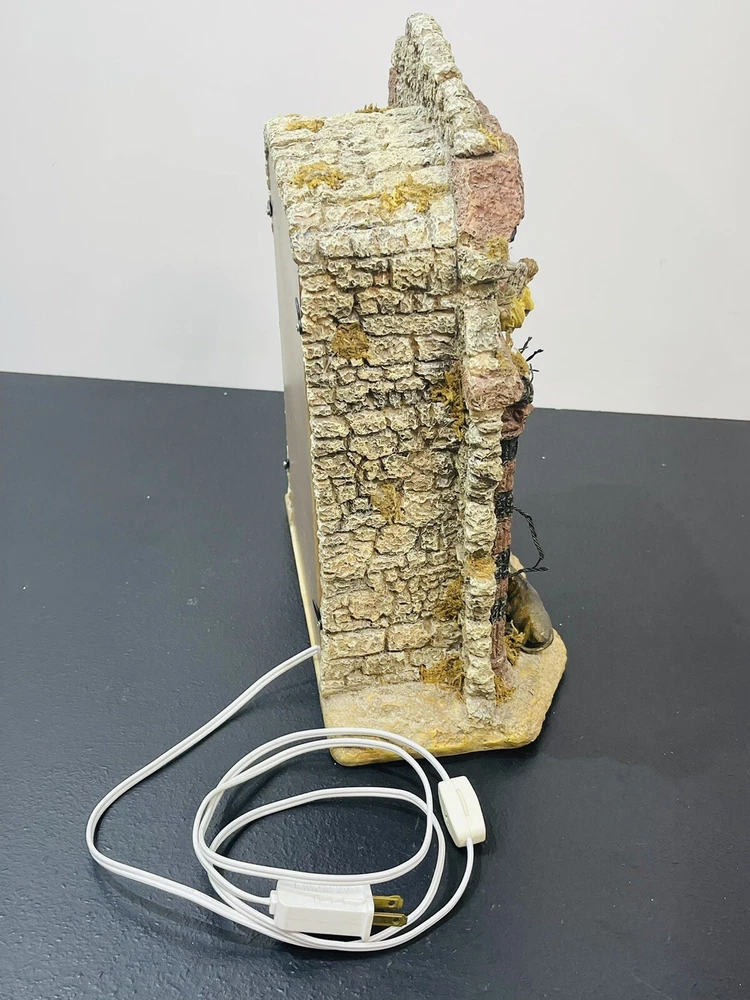 The department 56 starry night over Bethlehem is in good working condition. It does have a couple areas that are damaged, such as the donkeys tail and the cows horn , as well as one spot on the side that is missing a bit of the moss . it measures 13 1/2 inches high by 11 inches long by 6 inches wide . No box.