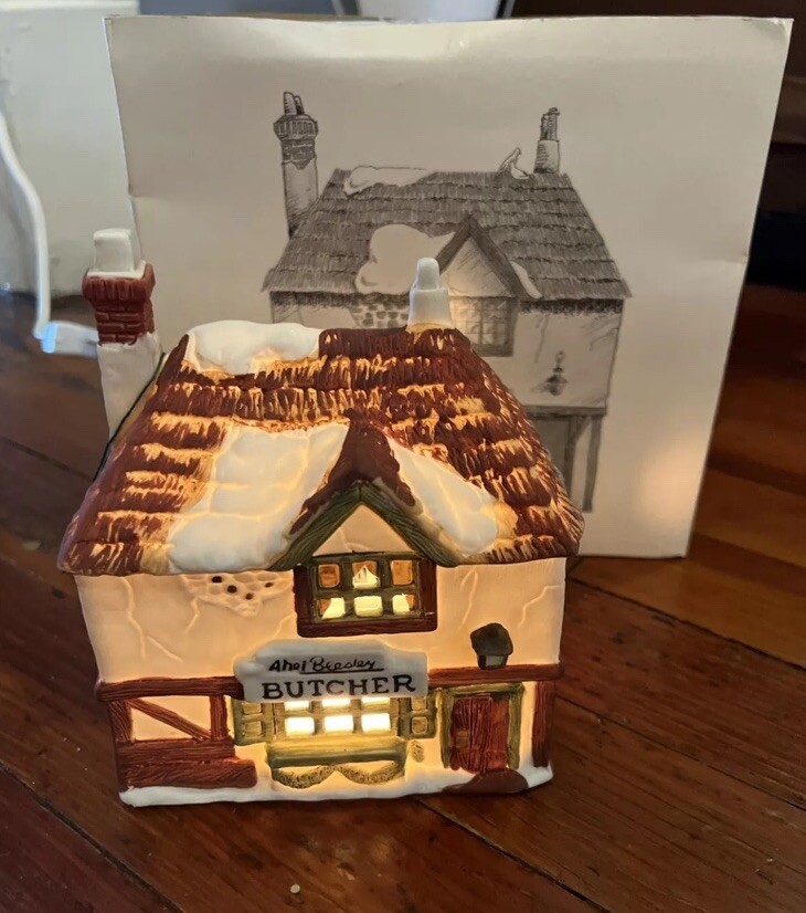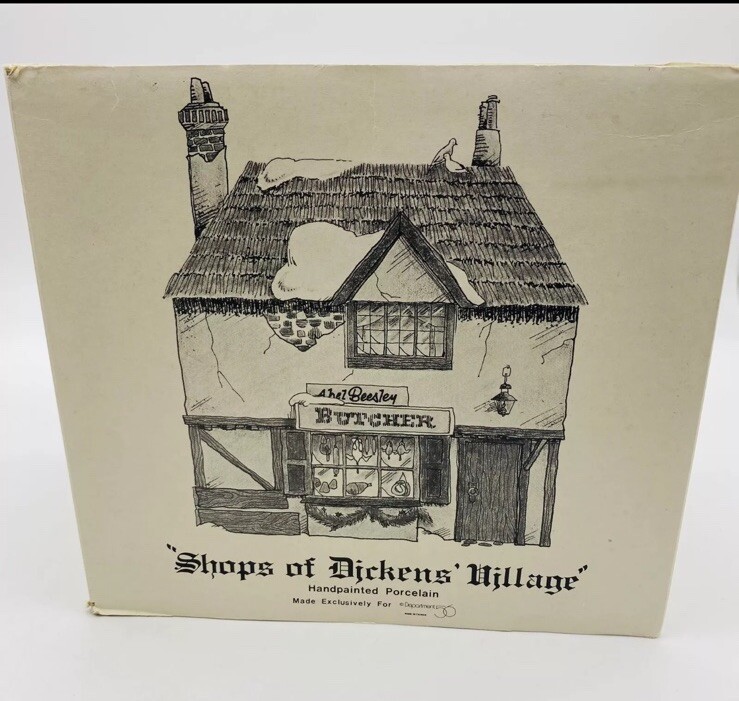 This product is a medium-sized, asymmetrical porcelain Christmas village house from the Department 56 collection. It features an all-over hand-painted finish and depicts Abel Beesley Butcher from Dickens Village. The piece was manufactured in Taiwan in 1984 and is part of a set of Christmas Villages. It comes in its original packaging and is a retired item.