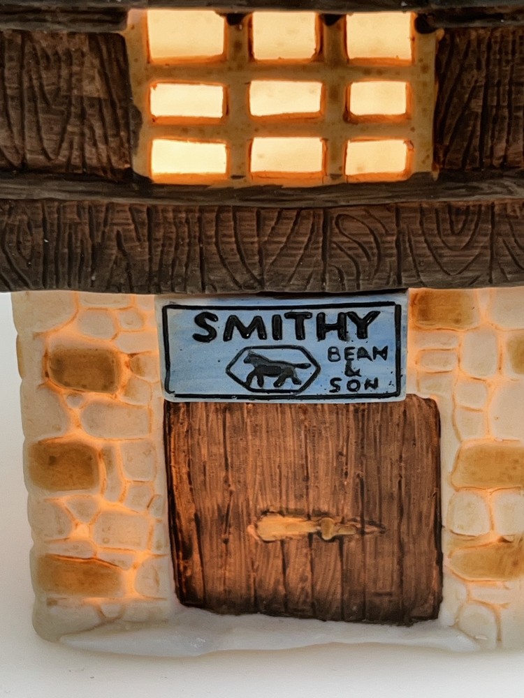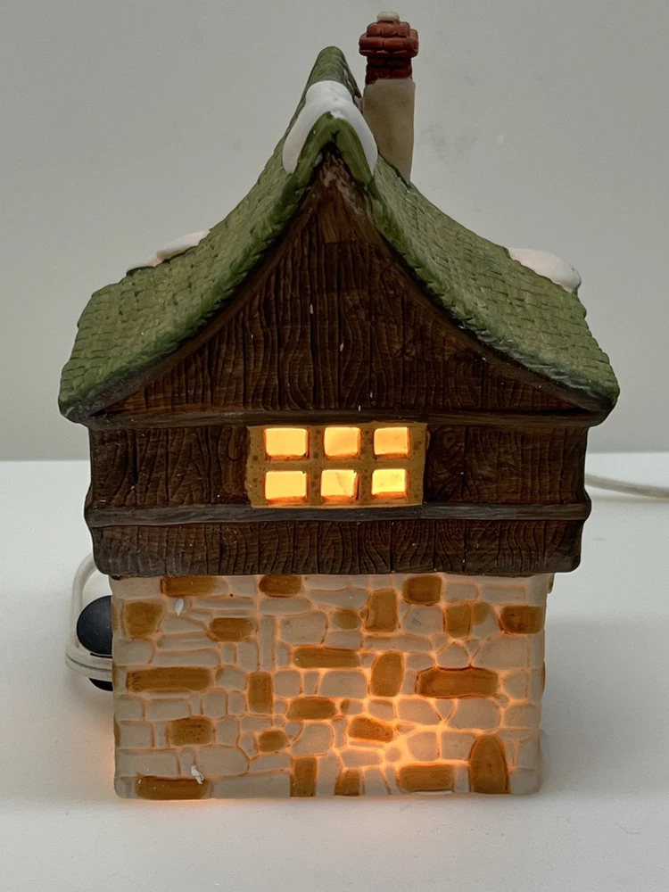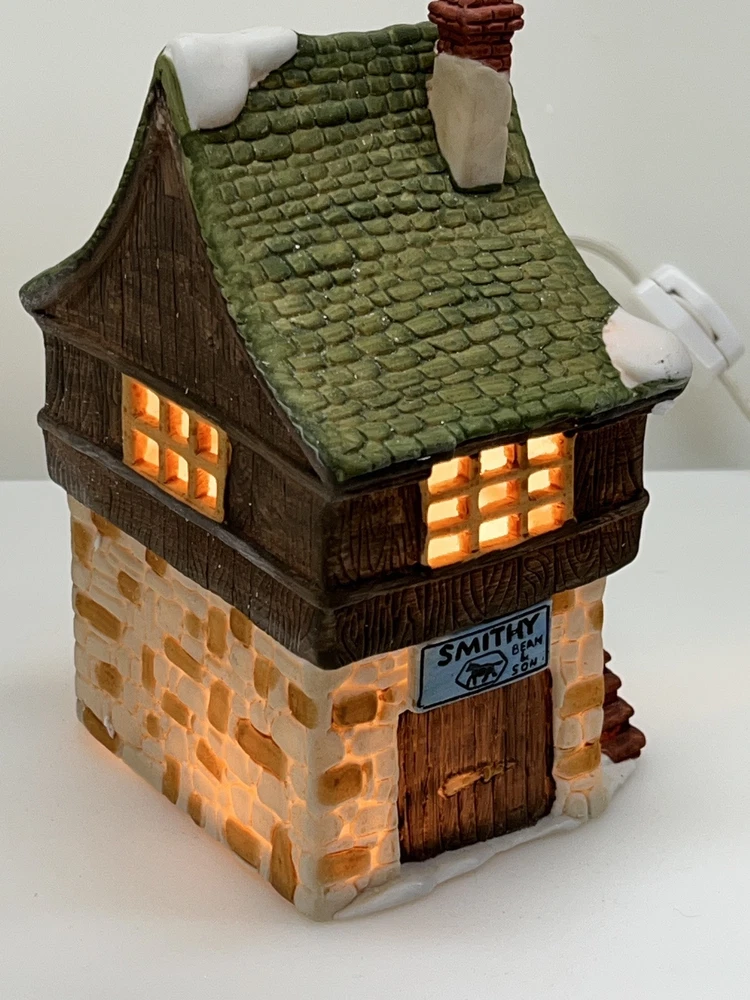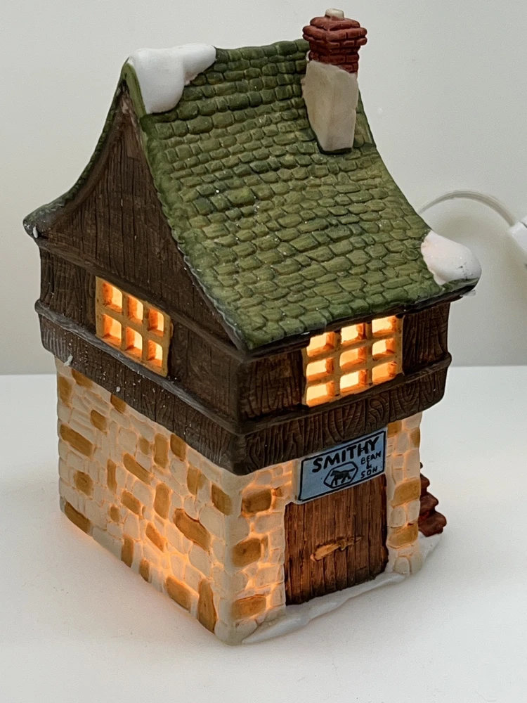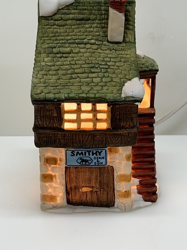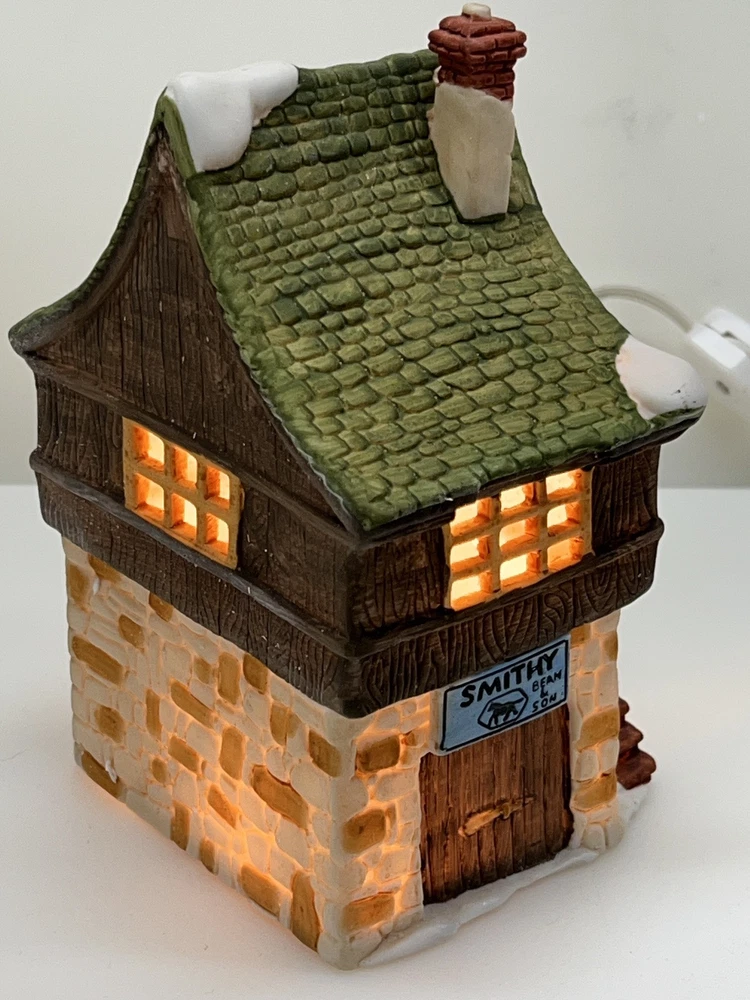 Dept 56 "Bean & Son Smithy Shop" from the Heritage Village Collection is a medium-sized, asymmetrical Victorian-style Christmas village house. It is hand-painted, illuminated, and retired, featuring a whimsical design. This porcelain house is part of the Dickens Village theme, suitable for a village display. With a multicolor finish, it measures 4" in length, 4" in width, and 7" in height. Manufactured in 1984, it is a unique addition to any room during the holiday season. 1984 !!! Absolutely perfect condition including all original packaging including cord & light