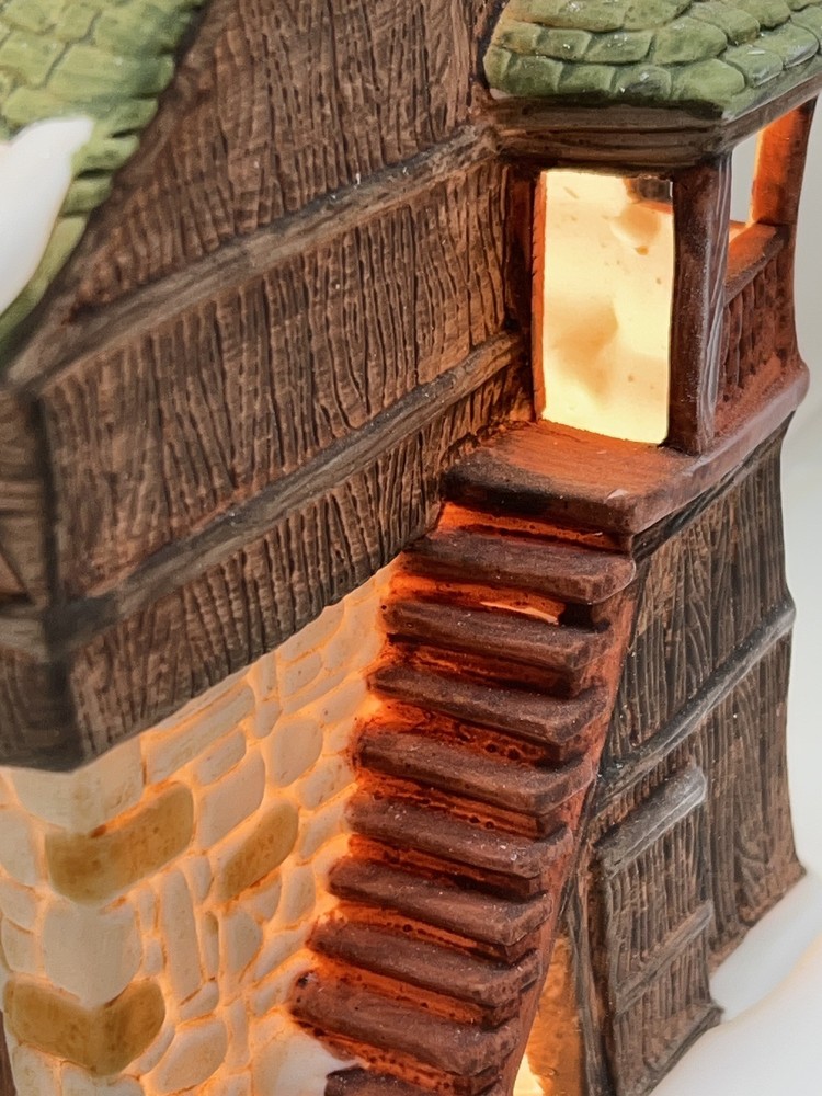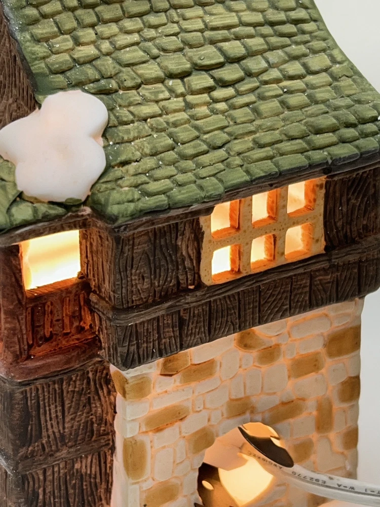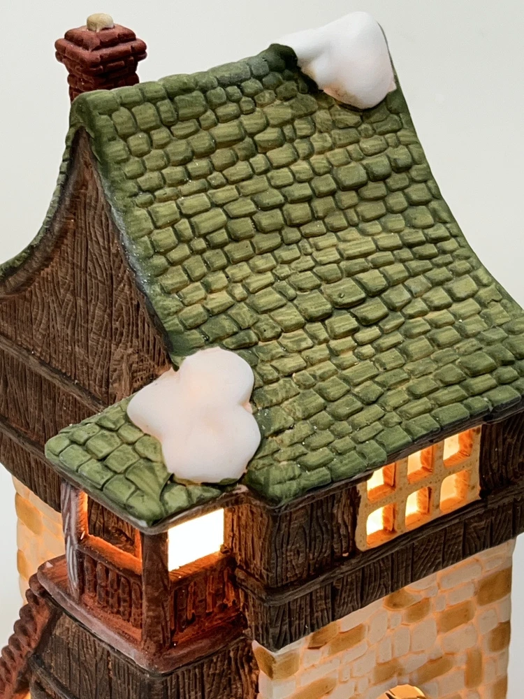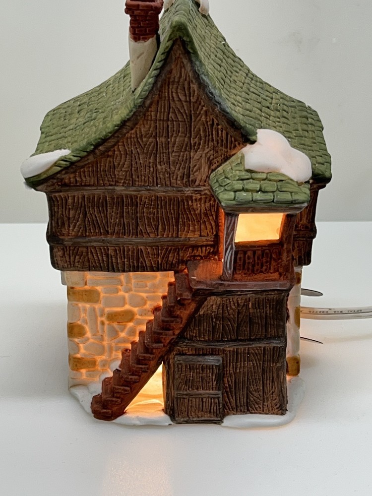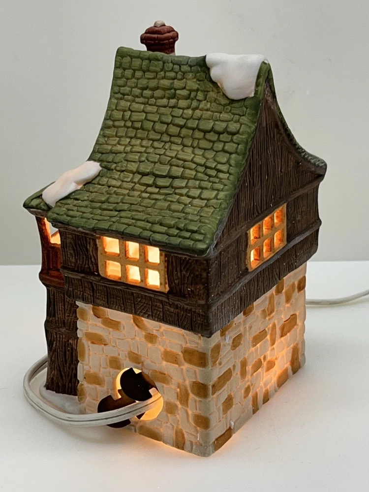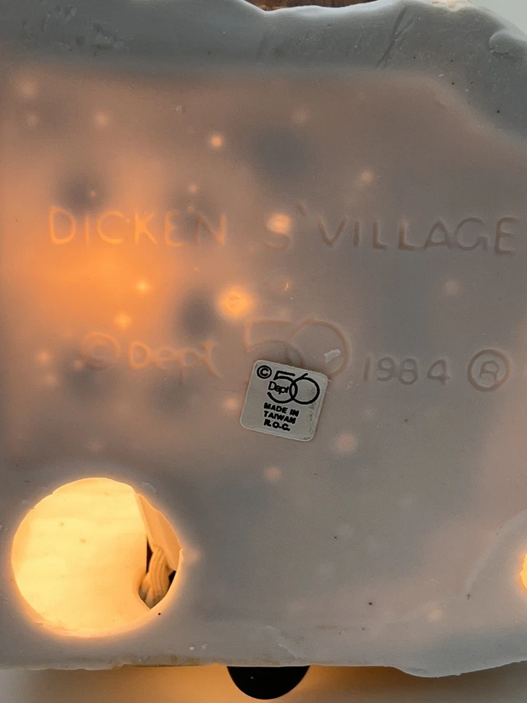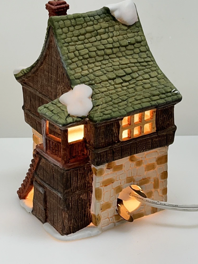 Dept 56 "Bean & Son Smithy Shop" from the Heritage Village Collection is a medium-sized, asymmetrical Victorian-style Christmas village house. It is hand-painted, illuminated, and retired, featuring a whimsical design. This porcelain house is part of the Dickens Village theme, suitable for a village display. With a multicolor finish, it measures 4" in length, 4" in width, and 7" in height. Manufactured in 1984, it is a unique addition to any room during the holiday season. 1984 !!! Absolutely perfect condition including all original packaging including cord & light