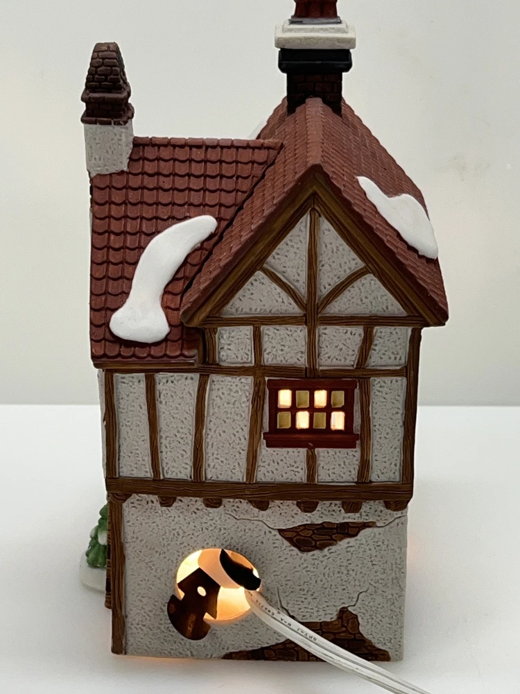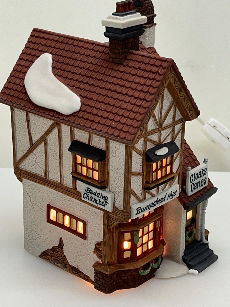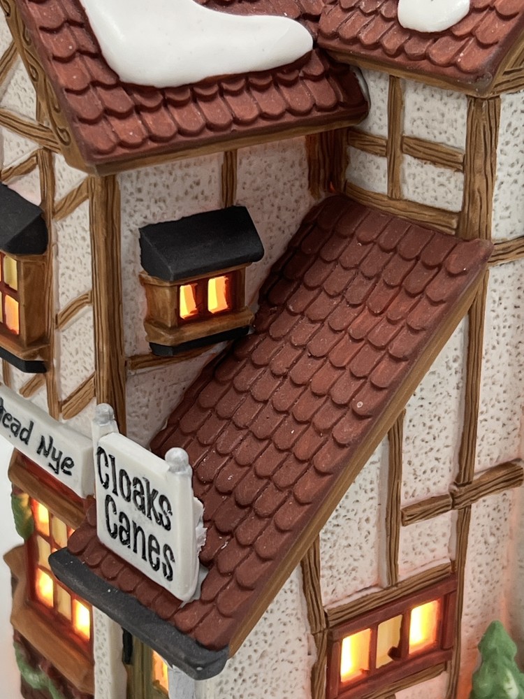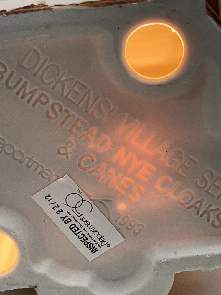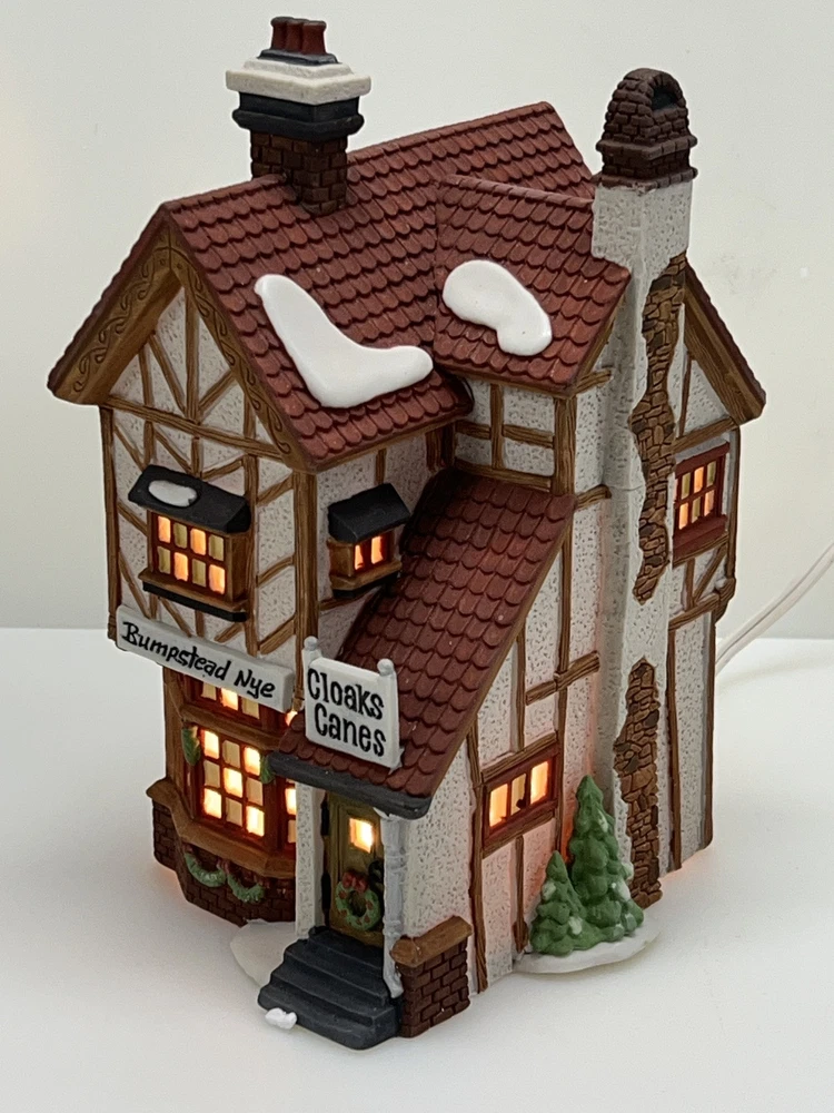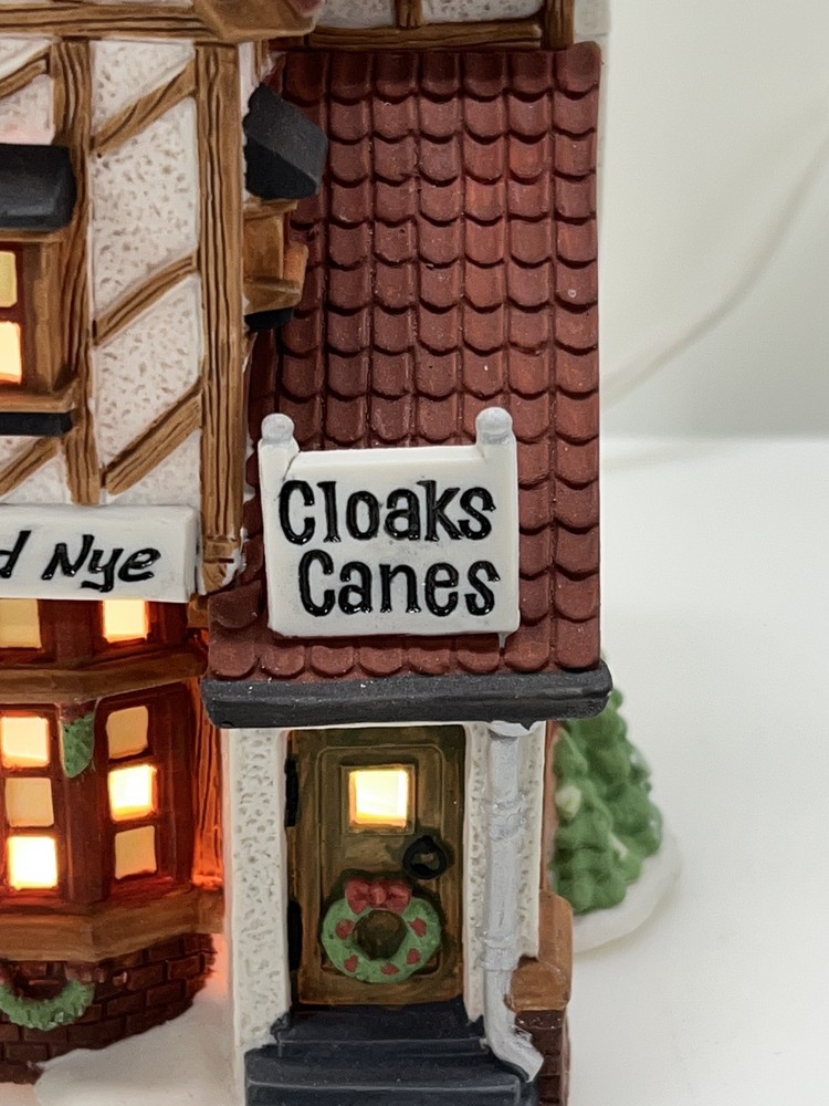 Dept 56 "Bumpstead Nye Cloaks And Canes" from the Dickens Village Collection is a medium-sized, hand-painted porcelain house with an asymmetrical shape. It features Victorian style, illuminated design, and is suitable for a seasonal village display. The multicolor house, part of the Heritage Village Collection, is from 1993 and measures 4-1/2" in length, 4-1/2" in width, and 8" in height. It comes boxed and is a retired piece. Pristine condition with all original packaging including cord & light