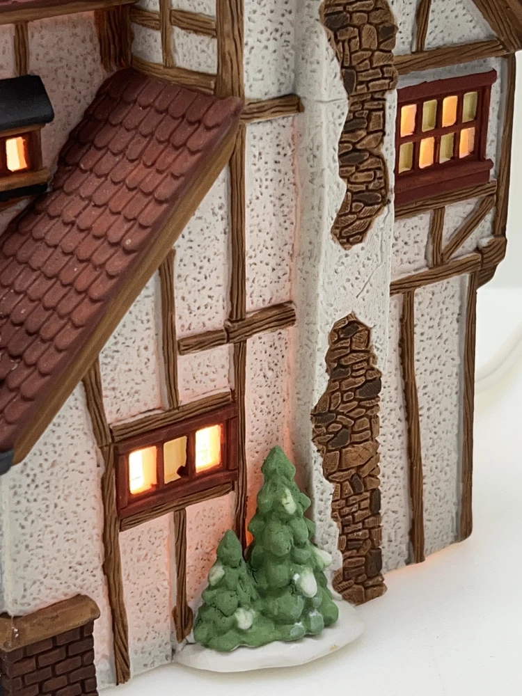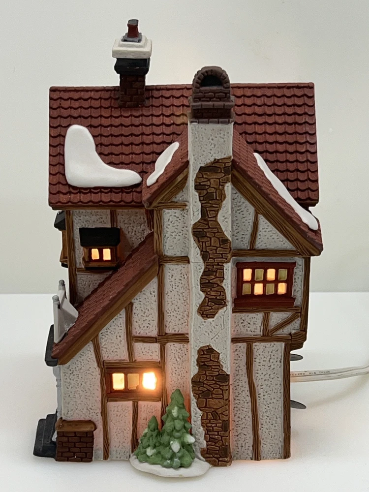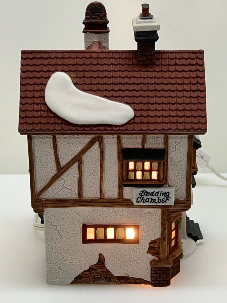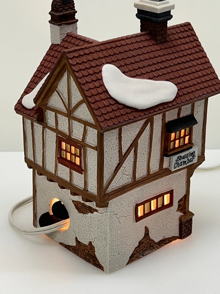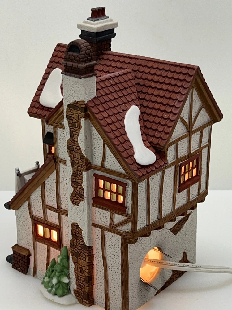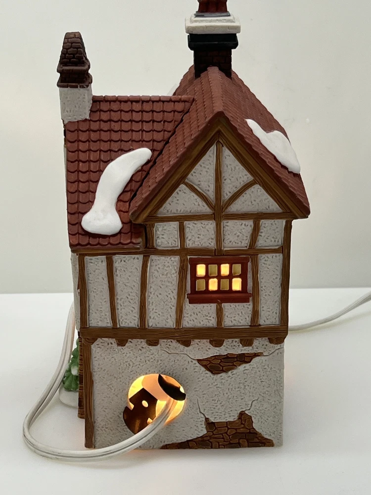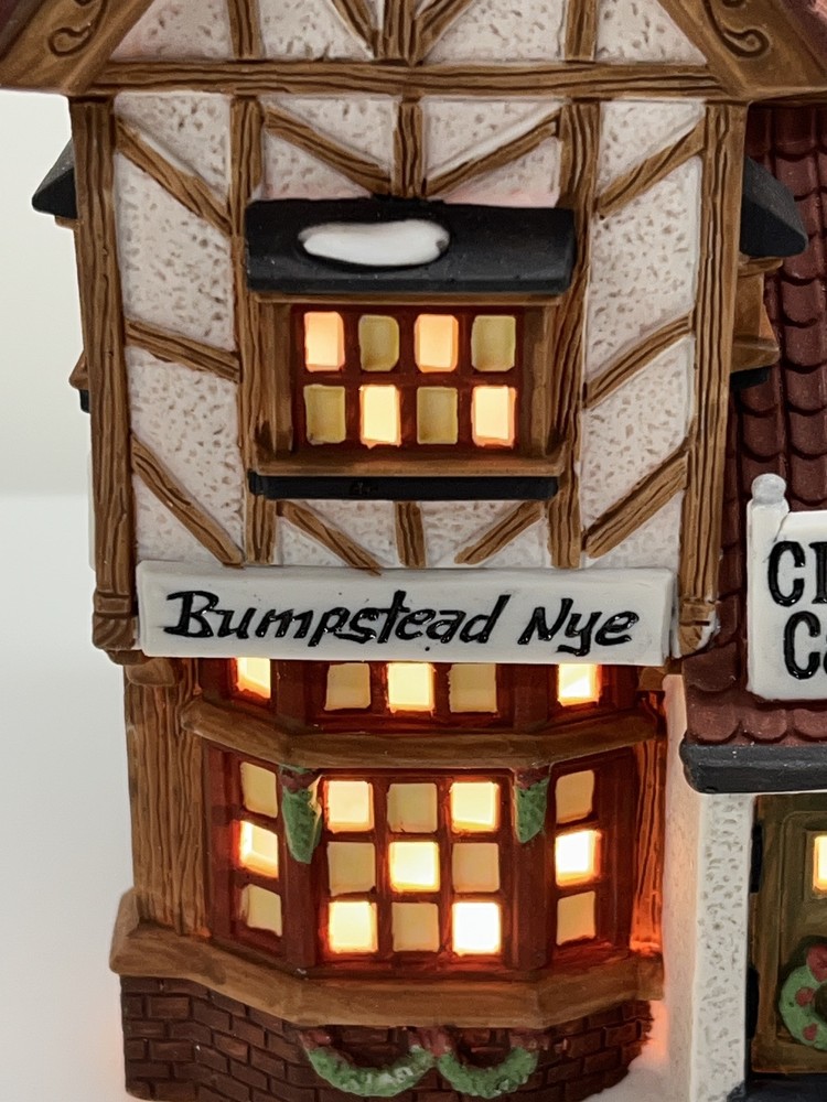 Dept 56 "Bumpstead Nye Cloaks And Canes" from the Dickens Village Collection is a medium-sized, hand-painted porcelain house with an asymmetrical shape. It features Victorian style, illuminated design, and is suitable for a seasonal village display. The multicolor house, part of the Heritage Village Collection, is from 1993 and measures 4-1/2" in length, 4-1/2" in width, and 8" in height. It comes boxed and is a retired piece. Pristine condition with all original packaging including cord & light