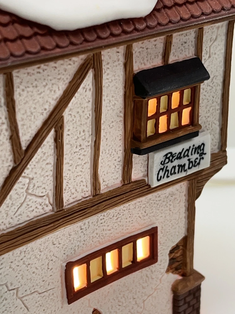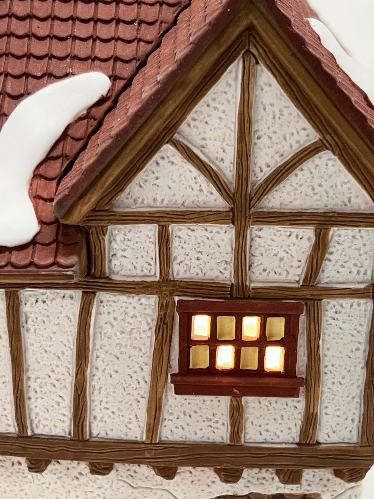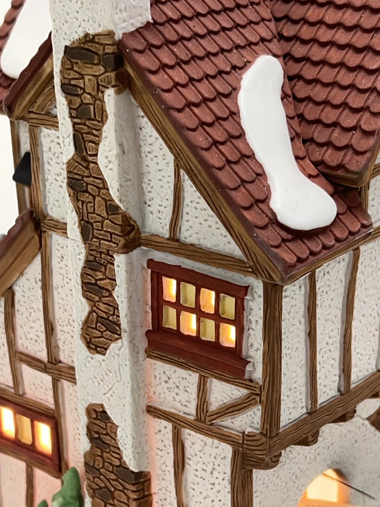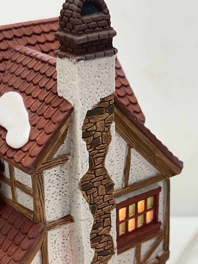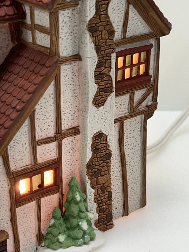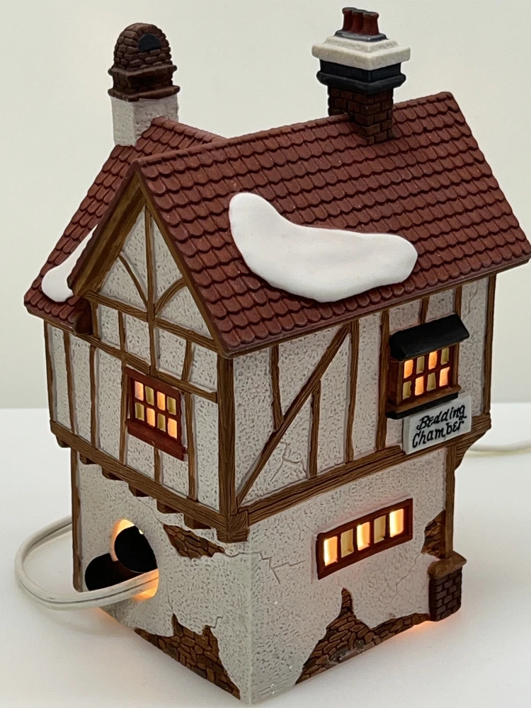 Dept 56 "Bumpstead Nye Cloaks And Canes" from the Dickens Village Collection is a medium-sized, hand-painted porcelain house with an asymmetrical shape. It features Victorian style, illuminated design, and is suitable for a seasonal village display. The multicolor house, part of the Heritage Village Collection, is from 1993 and measures 4-1/2" in length, 4-1/2" in width, and 8" in height. It comes boxed and is a retired piece. Pristine condition with all original packaging including cord & light