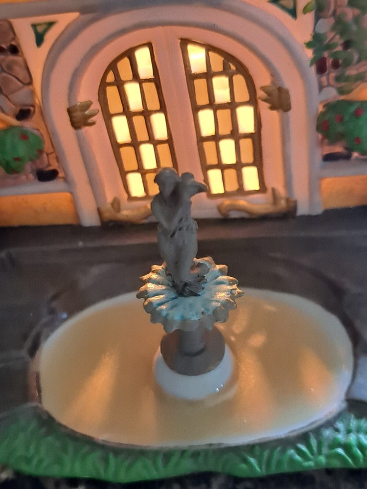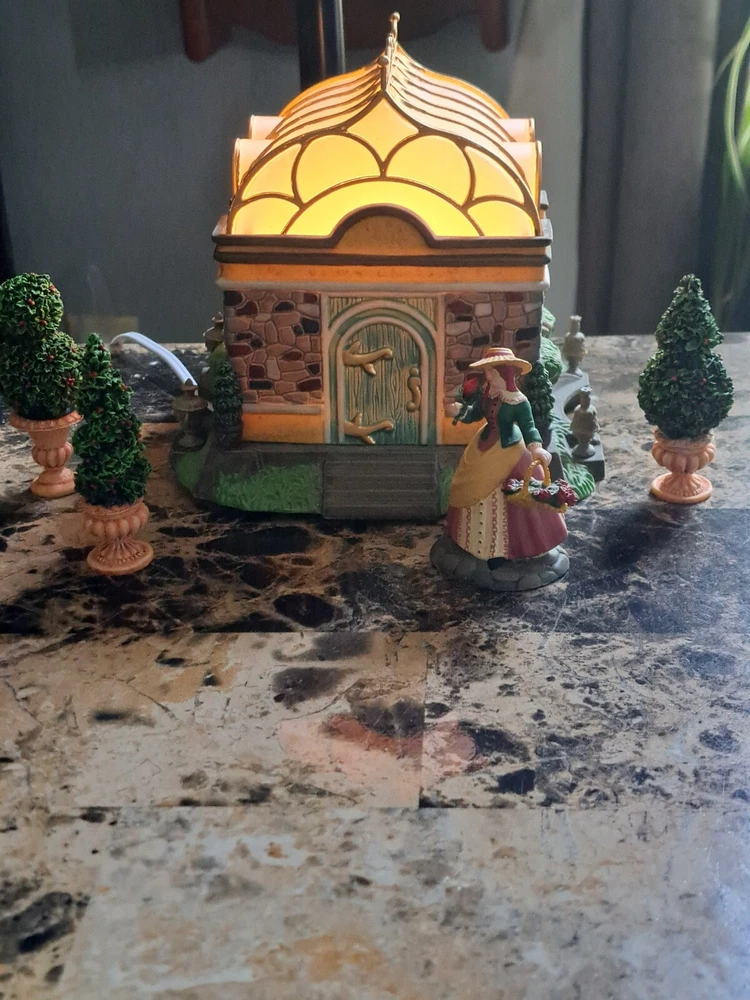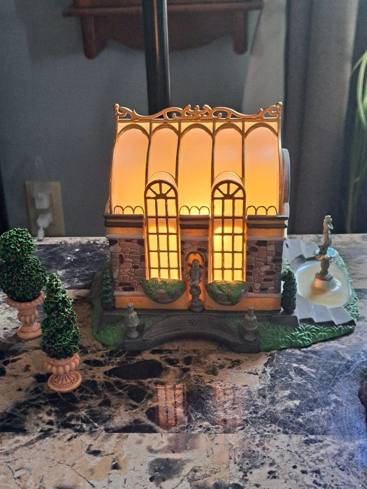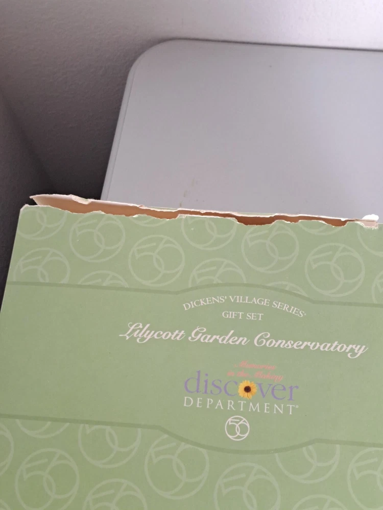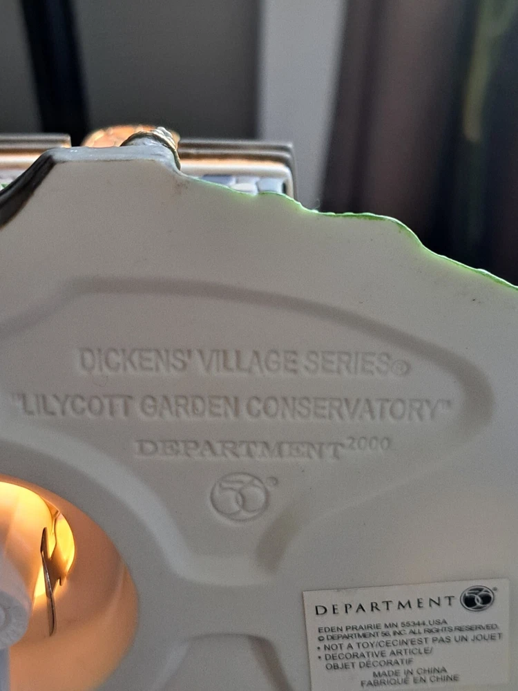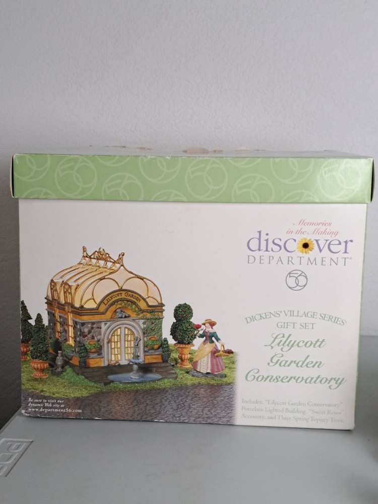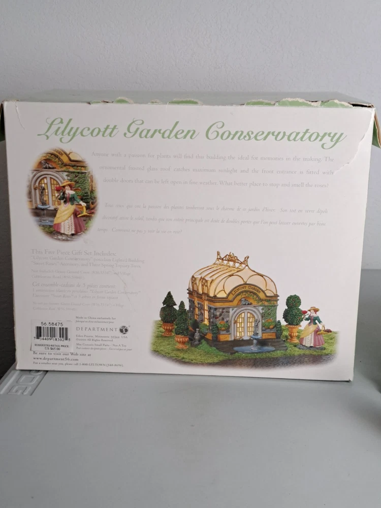 Dept. 56 Dickens Village Series Set LILYCOTT GARDEN CONSERVATORY is in Nice Pre-Owned Complete Condition. 2 Urn Pots On Building Side Have Been Reglued. Brand New Cord w/ Light Bulb. Box Flap Has Tear On Back Side and Taped. VERY PRETTY PIECE!!