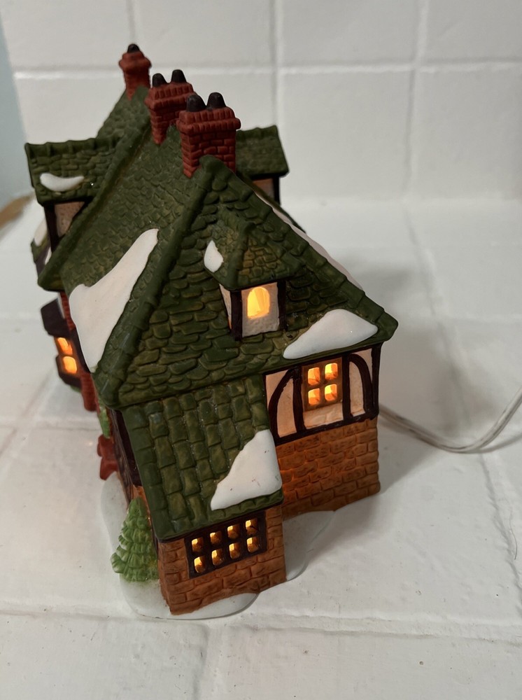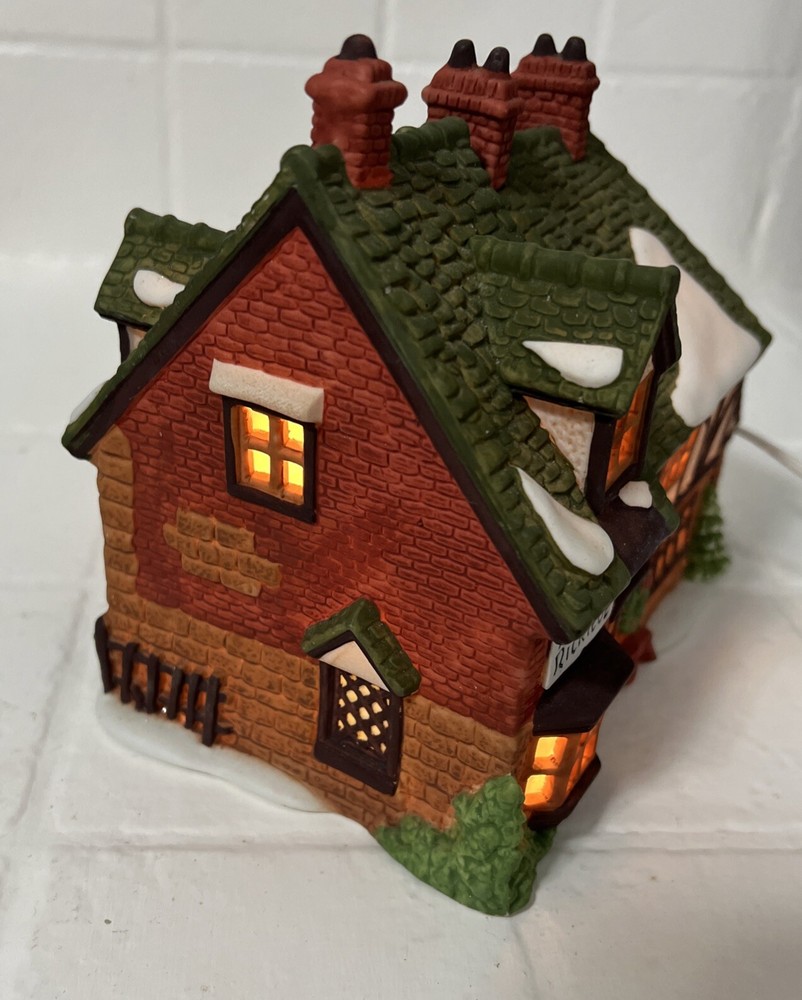 The Department 56 Dickens Village Nicholas Nickleby Cottage is a multicolored porcelain Christmas village piece from 1988. Part of the Dickens Village collection, this original and retired cottage features a quaint design inspired by the classic tale of Nicholas Nickleby. It does not come in its original box and was retired in 1991, adding to its collectible value for adults who enjoy creating holiday village displays.