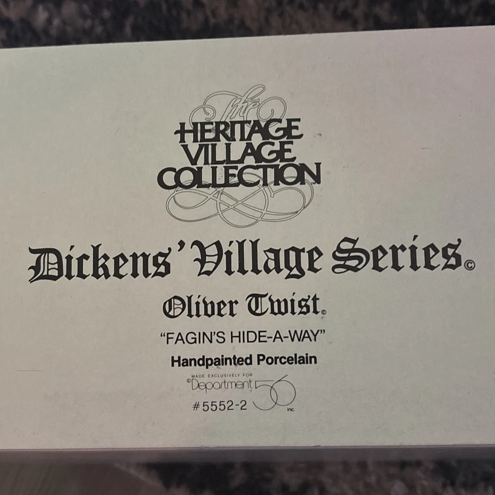 The product is a vintage Department 56 Dickens Village Series house from 1990, titled "Oliver Twist 'Fagin's Hideaway'. This asymmetrical, Victorian-style ceramic and porcelain building is hand-painted and illuminated, perfect for Christmas decor. The medium-sized piece features intricate details and a textured matte finish, making it suitable for display on a window, floor, or furniture in any room. Packaged in a box, this collectible item is a part of the Dickens Village collection, adding a touch of nostalgia and seasonal charm to any holiday display.