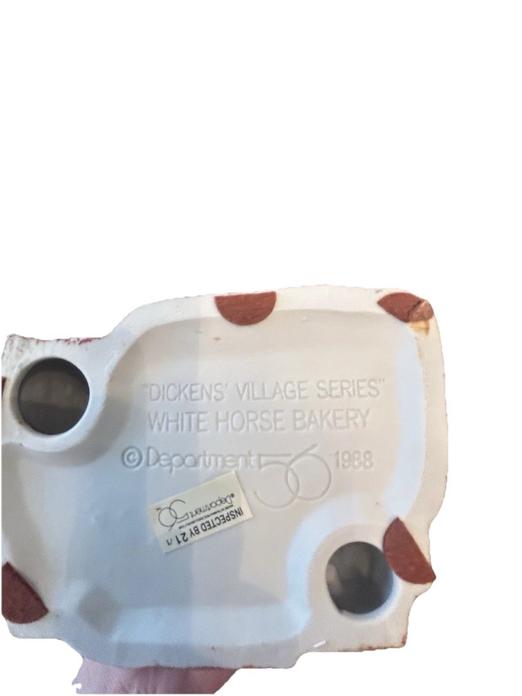 This is a medium-sized porcelain Christmas village house from the Dept 56 Dickens Village Series, featuring the White Horse Bakery. It was manufactured in 1988 and is an original piece. The house is hand-painted and comes in a box, but does not come with a light. The bakery is part of a collection of Christmas Carol character family buildings, and its style is Victorian. It weighs 2 lbs and is suitable for any room. The house is retired and boxed, making it a great addition to any holiday or seasonal collection.