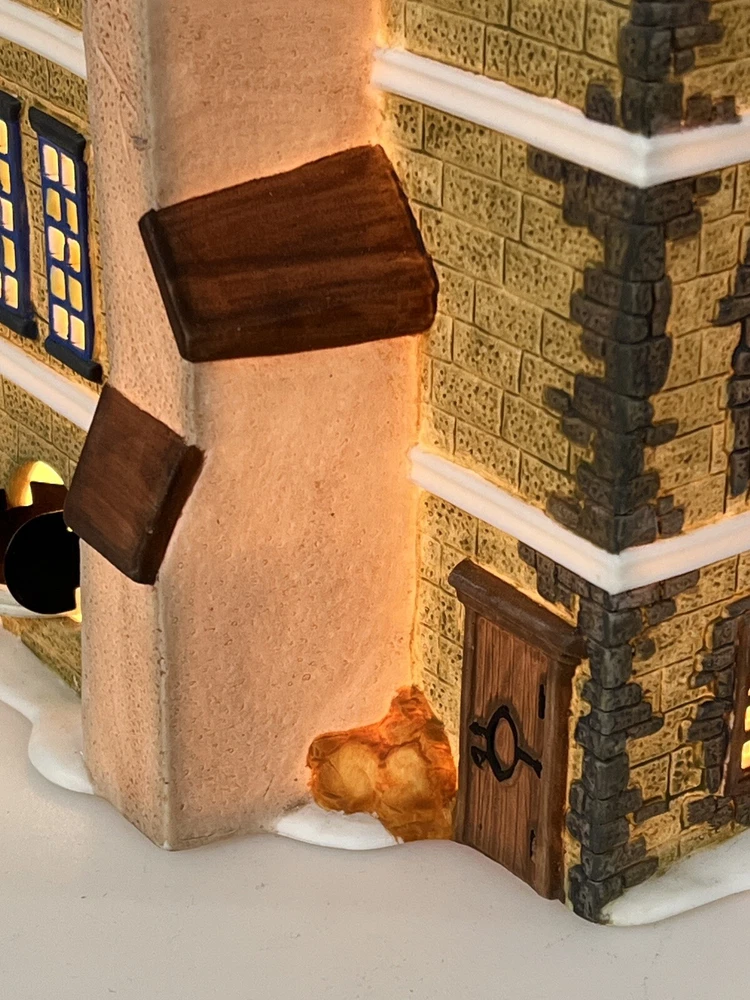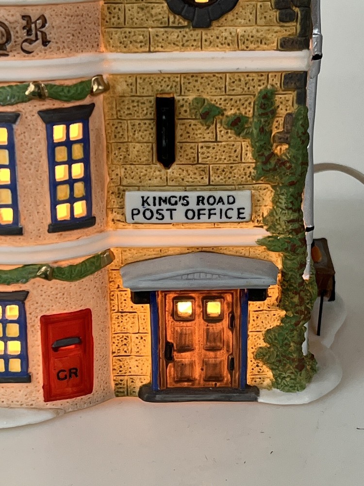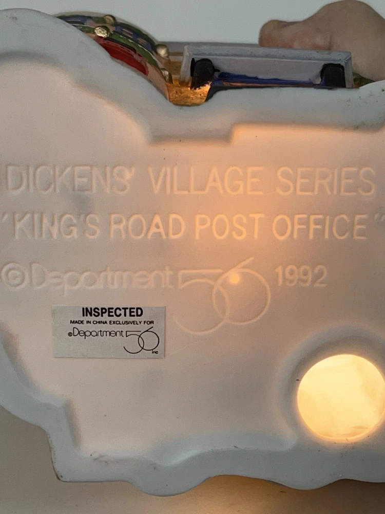This is a Department 56 Kings Road Post Office from the Dickens Village series. It is a medium-sized, asymmetrical ceramic and porcelain Christmas village house that is hand-painted and illuminated. The house is part of the traditional Dickens Village collection and features a whimsical design. It measures 6 inches in length, 8 inches in height, and 4 inches in width. The item is suitable for seasonal display and is a retired piece from 1992. No original box, comes with cord & light