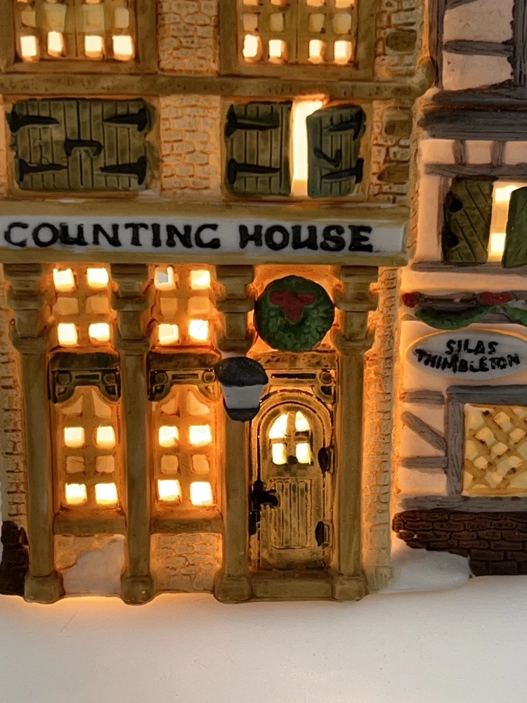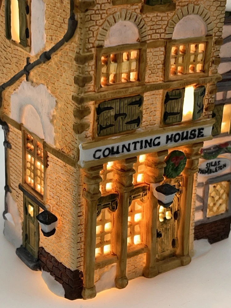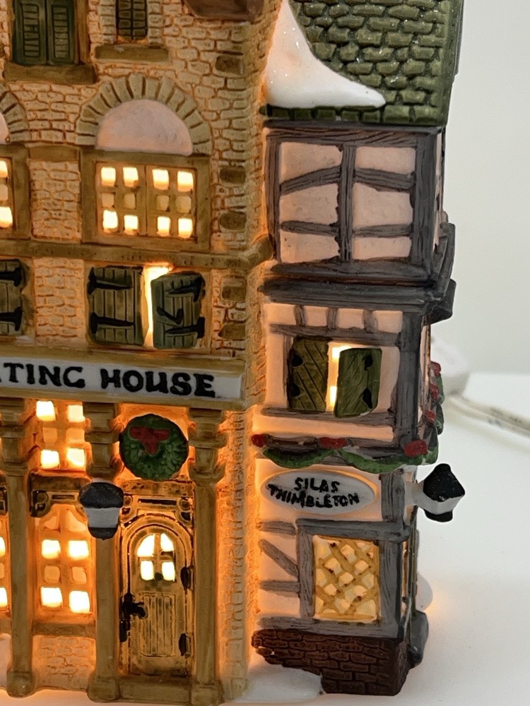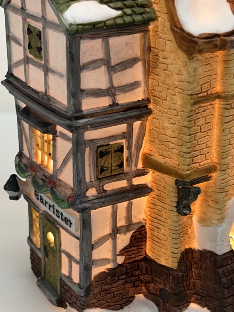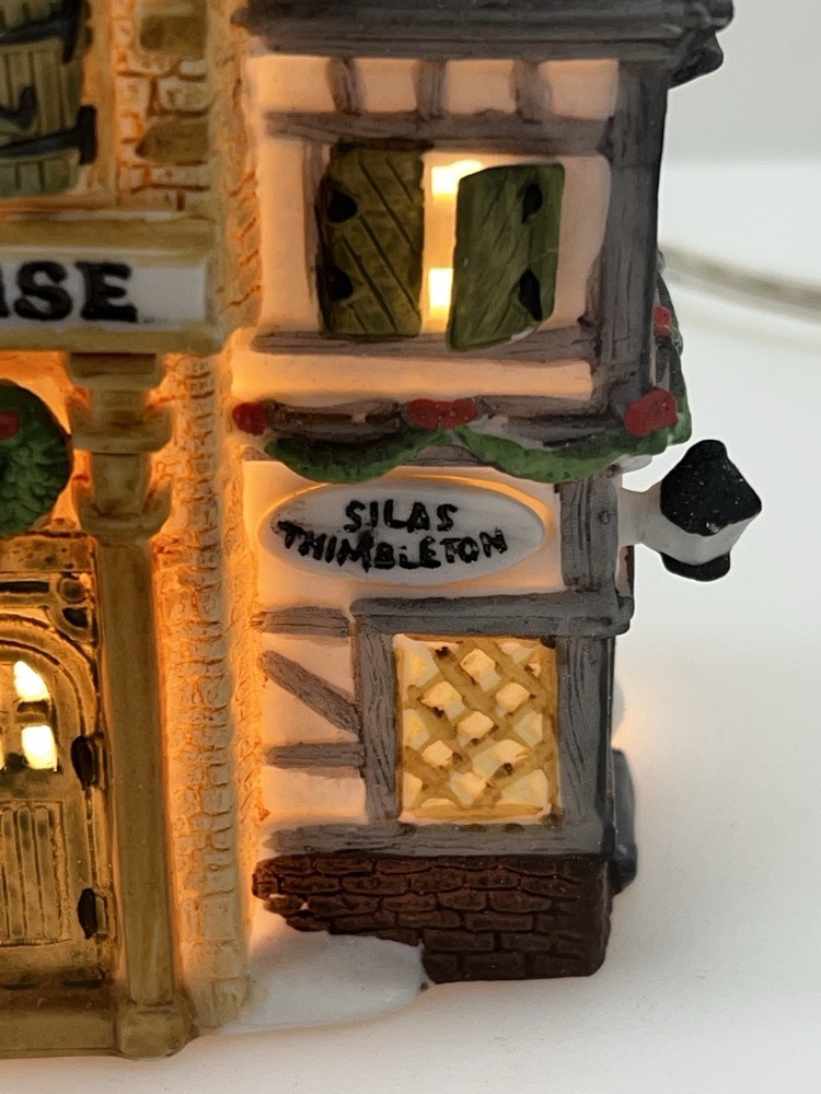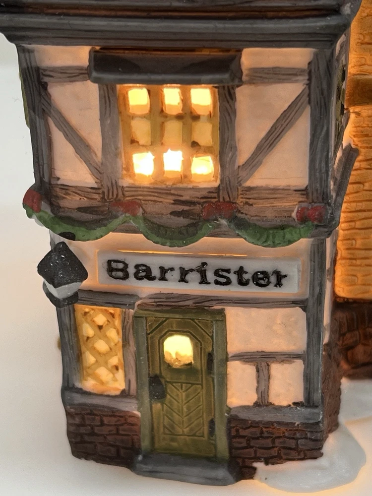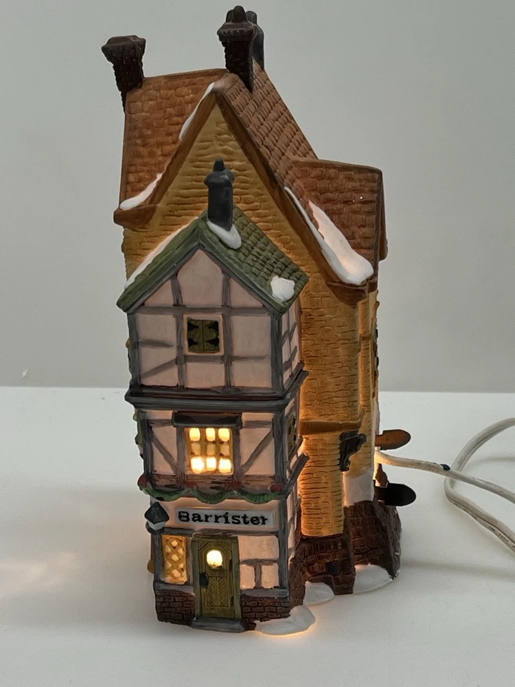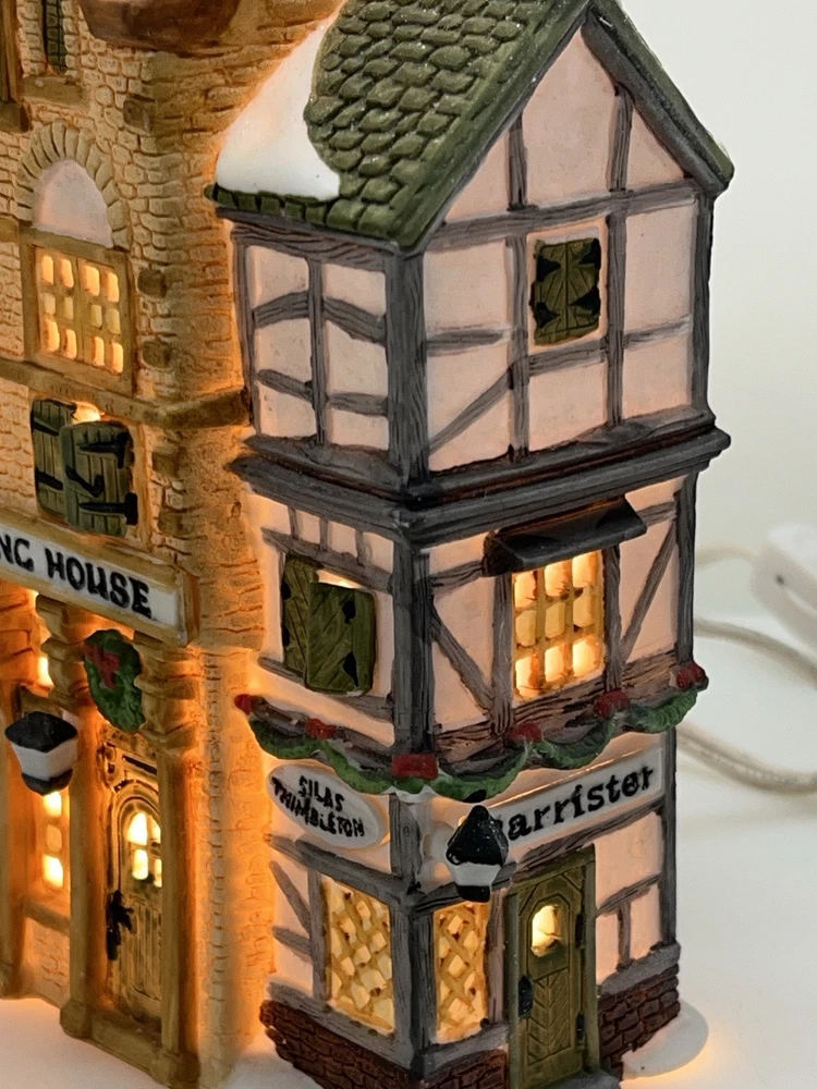 Add a touch of Victorian charm to your Christmas decor with this exquisite Dept 56 Heritage Village Collection piece. This hand-painted porcelain figurine features Silas Thimbleton Barrister, a beloved character from the Dickens Village series. The asymmetrical piece measures 4-1/2" in length, 8" in height, and 4" in width, making it a medium-sized addition to your collection. This retired, illuminated figurine is boxed and in excellent condition, ready to be displayed in any room of your home. Its whimsical pattern and multicolor finish make it a delightful addition to any Christmas village collection. Celebrate the season with this unique, original piece from the late 20th century, manufactured in Taiwan. Pristine condition with all original packaging including cord & light