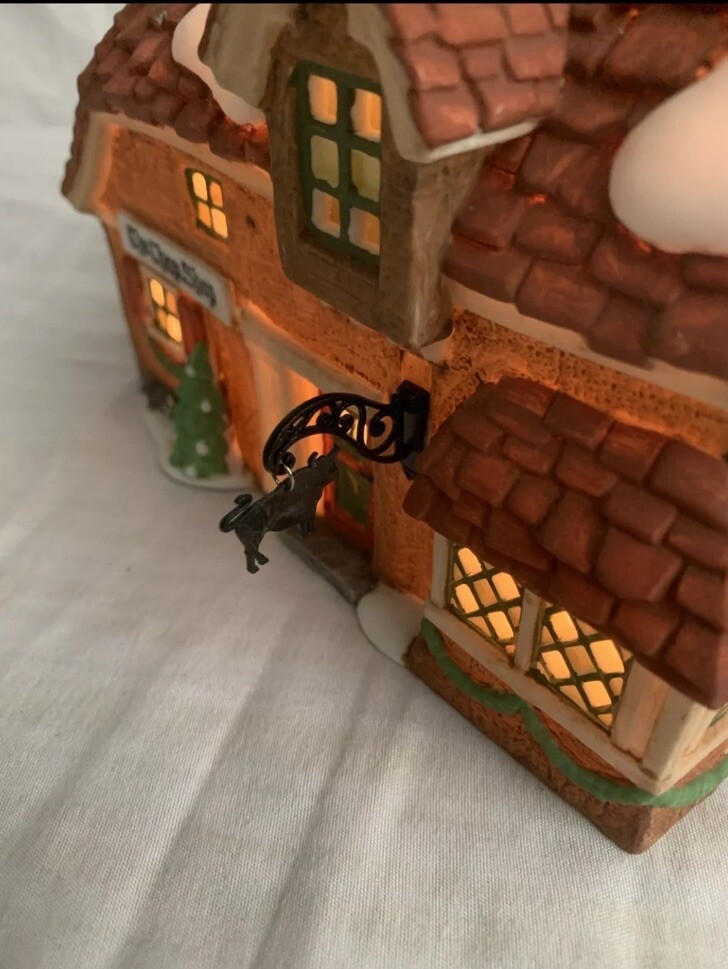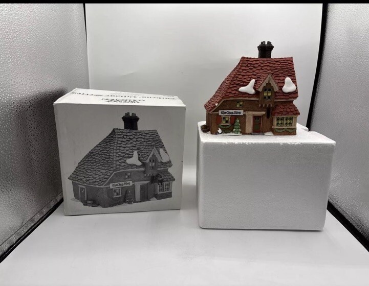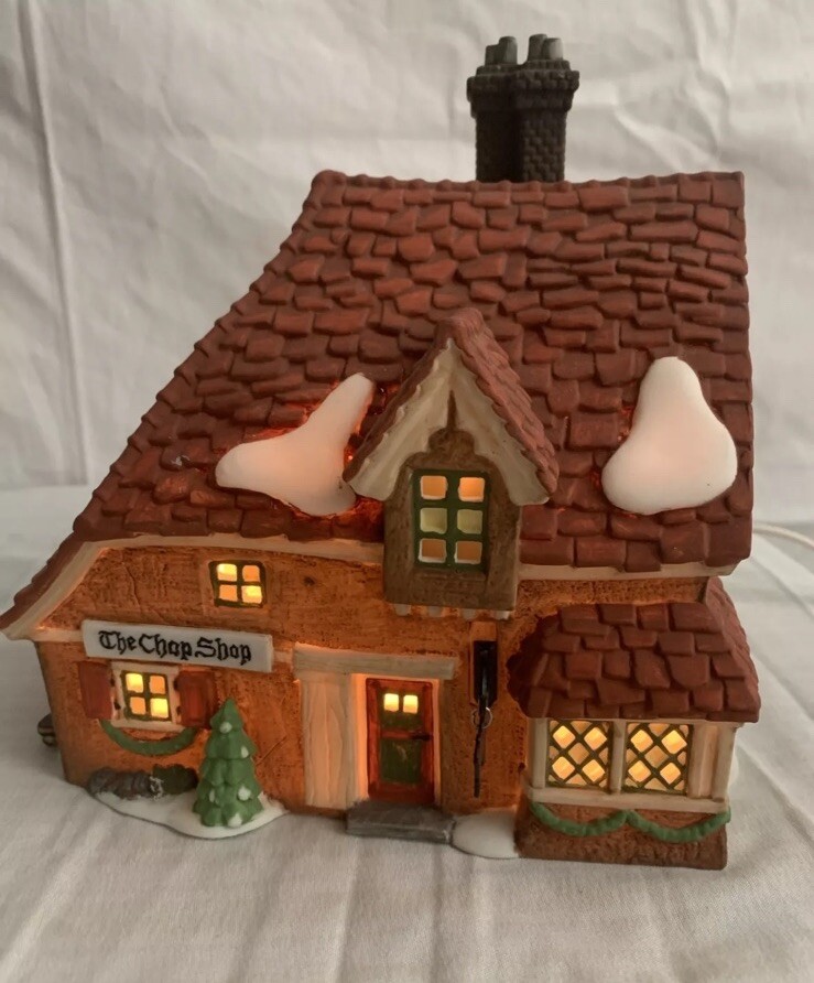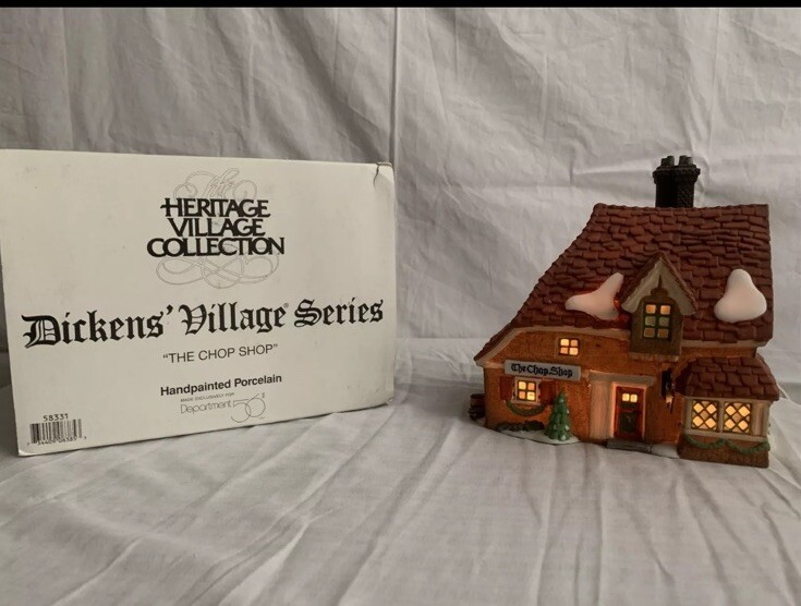 This is a Department 56 Christmas Village piece from the Dickens Village Series. The building is called The Chop Shop and is hand-painted with multi-colors. It measures 7 inches in height, 7.25 inches in length, and 5 inches in width. The item is made of porcelain and features a light. It was manufactured in 1995 and is a retired piece. The item is in its original packaging box.