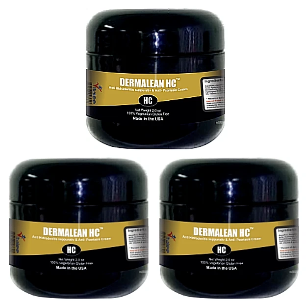 HS Hurley stage 2 economy pack : recurrent abscesses in several different areas of the body, with the initial formation of sinus tracts. 3 months of continuous use of Dermalean HC is recommended for optimum results. Hidradenitis Suppurativa (HS) is a skin disease that most commonly affects areas bearing apocrine sweat glands or sebaceous glands, such as the underarms, under the breasts, inner thighs, groin, and buttocks. Hidradenitis Suppurativa is a long-term (chronic) skin condition. There are 3 stages of Hidradenitis Suppurativa: Hurley stage 1 : single or a few lesions with no evidence of scarring or sinus tracts. Hurley stage 2 : recurrent abscesses in several different areas of the body, with the initial formation of sinus tracts. 3 months of continuous use of Dermalean HC is recommended for optimum results. Hurley stage 3 : many abscesses throughout the body and a network or sinus tracts under the skin, with evidence of scarring and pus leaking. 6 months of continuous use of Dermalean HC is highly recommended for optimum results. The non-contagious disease manifests as clusters of chronic abscesses, epidermoid cysts, sebaceous cysts, pilonidal cyst or multi-localized infections, which can be as large as baseballs or as small as a pea. It can also start as a single abscess and once it pops, can make tracks of many more abscesses. These cysts can be extremely painful to the touch and may persist for years with occasional to frequent periods of inflammation, culminating in incision and drainage of pus, often leaving open wounds that will not heal. For unknown reasons, people with Hidradenitis develop plugging or clogging of their apocrine glands. HS causes chronic scarring and pus formation. Dermalean may help psoriasis, Dry skin, eczema, Meriones line, under eye circle, dull skin, inflammatory acne, anti-blemish, acne scar, Allergic contact dermatitis, blackheads, whiteheads, Helps lessen age spots, sun spots, and discoloration. Psoriasis is characterized by skin that becomes thick, red, and marked by dry scales that flake off. The affected area may be raised with patches of silvery scales. It can be extremely uncomfortable, negatively affecting daily activities. Key Usage Benefits : • Anti Boil, Anti-aging • Alleviates the skin inflammation, pain, and discomfort associated with Hidradenitis Suppurativa and Sebaceous Hyperplasia. • Helps to unclog apocrine glands. • Improve Skin Elasticity • Antiseptic and potent antioxidant • Helps reduce inflammation • Helps lessen age spots, sun spots, and skin discoloration. • Help reduce abscesses epidermoid cysts and P ilonidal sinus. Application: R ecommended at bedtime. Apply with fingertip evenly over the entire affected area and massage twice a day until it is totally absorbed. Wash or shower with warm to hot water in the morning. The length of time from when you start using Dermalean HC cream until you see results varies with each person. While some people see changes as soon as 15 days, it may take others longer or sooner to see a difference. Caution for optimum results: Flare-ups may be triggered by fragrance, dairy products, perspiration, hormonal changes (such as monthly cycles in women), humidity and heat, and friction from synthetic clothing. Do not use fragranced antiperspirant, avoid smoking and tight clothing . Lifestyle modification is imperative if you want to get rid of Hidradenitis Suppurativa or any other skin disorder. Avoid fragrance and dairy products as they may trigger flare-ups. These statements have not been evaluated by the Food and Drug Administration. This product is not intended to diagnose, treat, cure, or prevent any disease.