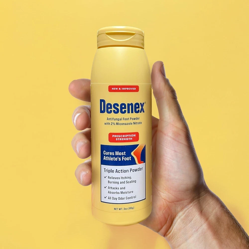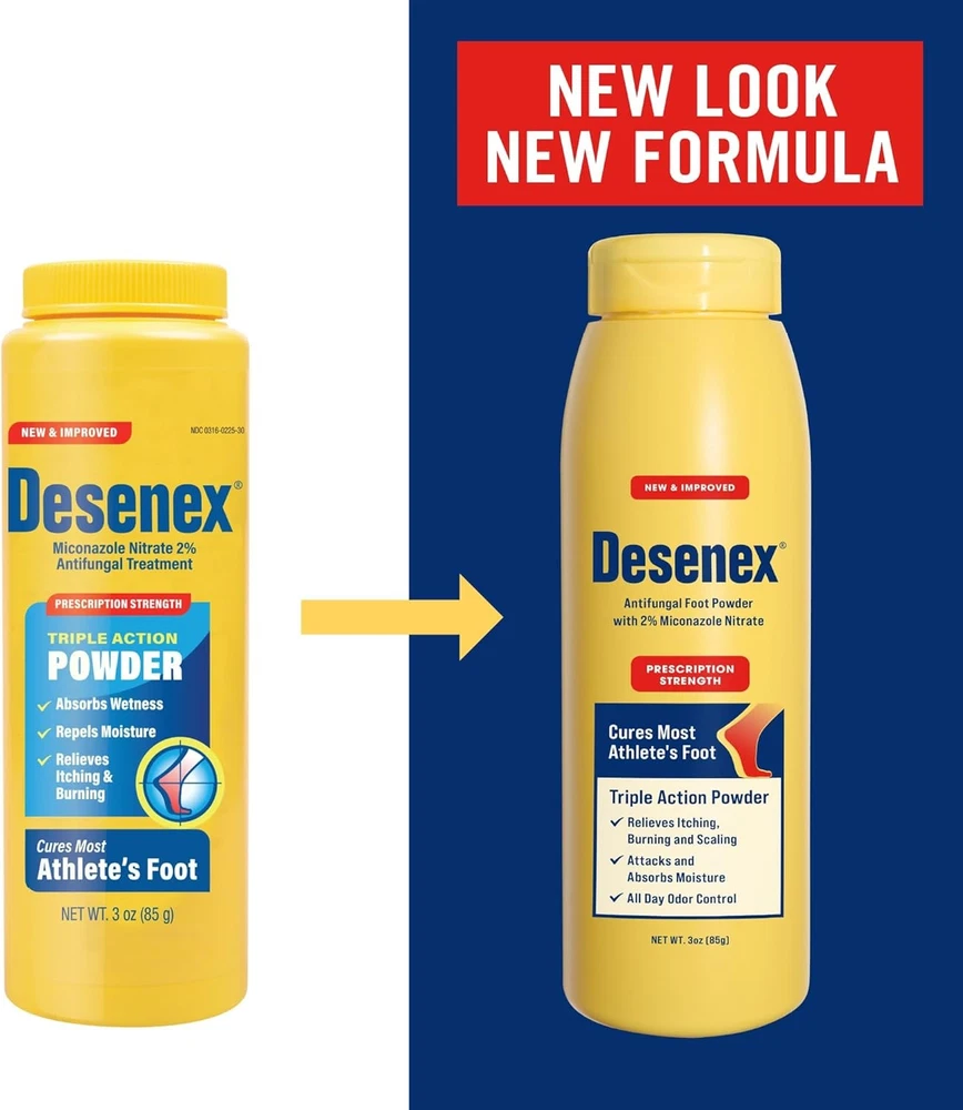 Desenex Anti-Fungal Foot Powder, Cures Most Athlete’s 3 Ounce (Pack of 1) Product Details Product Dimensions : 2 x 2 x 6.09 inches; 3 ounces Brand: Desenex Item Form: Powder Scent: Unscented Material Type Free: Talc Free Special Feature: Odor Protection, All Day Protection This effective powder cures most athlete's foot. It gives you lasting relief from the itching, burning, and scaling caused by athlete's foot. Powerful, prescription-strength 2% Miconazole Nitrate targets fungus that causes athlete’s foot. Triple-Action Formula: 1) Relieves athlete's foot symptoms, 2) Attacks and absorbs moisture to discourage fungal growth and keep you feeling comfortable, and 3) Provides all-day odor control for foot freshness. When you’re working hard, you want a foot powder that gets the job done. 96% of users agreed Desenex absorbed sweat and moisture immediately and 93% agreed powder destroys & neutralizes odor (Data on file). Free from talc, parabens, and aluminum. Since World War II, we’ve been a reliable choice for hardworking people dealing with athlete's foot. Trusted for decades, Desenex powder relieves the symptoms of athlete’s foot so you can get back on your feet with confidence. Desenex’s antifungal formula attacks excess moisture and soothes the itching, burning and cracking associated with athlete’s foot.