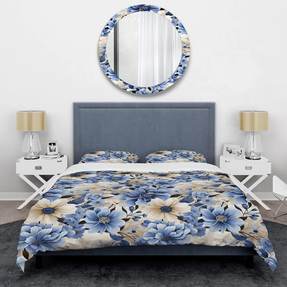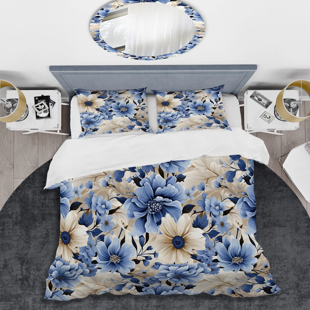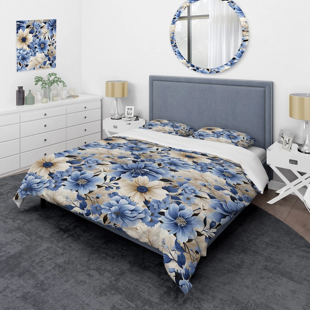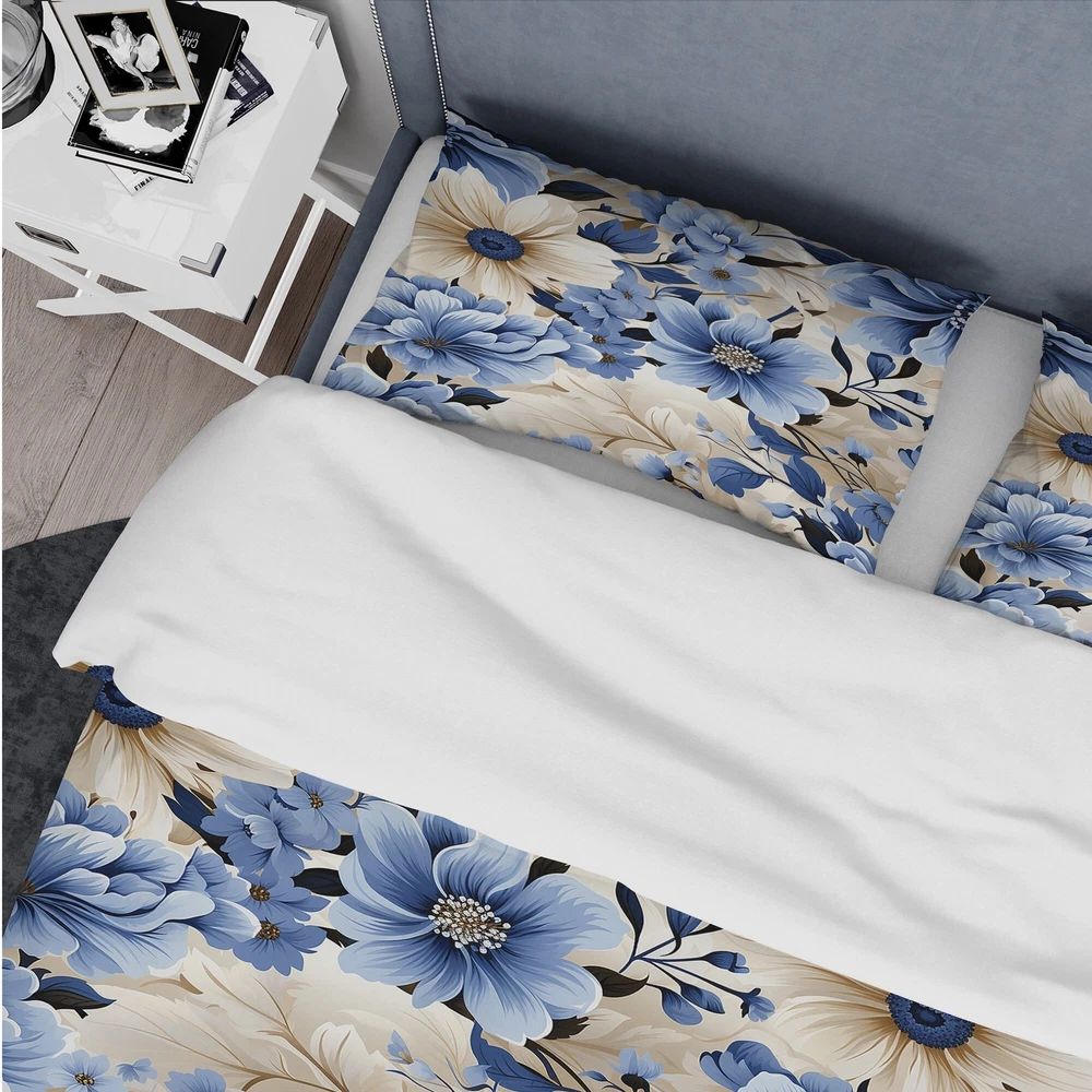 There is just nothing better than a beautiful, inviting comfortable bed after a long day. This Floral bed set is created using the richest colors stemming from high density Italian ink and the softest fabrics making it the perfect way to spruce up your bedroom, while keeping it ultra-comfortable. This luxurious Blue Coastal Dreams Floral Pattern I bed design is made with 100% microfiber polyester, making it ultra-soft to ensure you sleep comfortably all night long. This Cottage set includes 1 Bed Cover and 2 Shams and is available in twin, queen and king sizes.This Bedding Set is easily integrated into your already decorated space.What's Included? - Duvet Cover - Shams - Pillow Cases not included but can be buy separately - Comforter Insert NOT INCLUDEDFeatures - Free Shipping Over $49.99* Details Designart "Blue Coastal Dreams Floral Pattern I" Beige Cottage Bedding Cover Set Product Description: There is just nothing better than a beautiful, inviting comfortable bed after a long day. This Floral bed set is created using the richest colors stemming from high density Italian ink and the softest fabrics making it the perfect way to spruce up your bedroom, while keeping it ultra-comfortable. This luxurious Blue Coastal Dreams Floral Pattern I bed design is made with 100% microfiber polyester, making it ultra-soft to ensure you sleep comfortably all night long. This Cottage set includes 1 Bed Cover and 2 Shams and is available in twin, queen and king sizes. This Bedding Set is easily integrated into your already decorated space. What's Included? - Duvet Cover - Shams - Pillow Cases not included but can be buy separately - Comforter Insert NOT INCLUDED Features - Printed using High Density Italian Ink making the colors extra vibrant. - Made from ultra-soft, lightweight 100% microfiber polyester. Wrinkle resistant fabric. Down-like comfort, odorless. - The Cottage bed set includes one bed cover and two standard pillow shams to create a complete and stylish look. - The elegant and soft colors are both trendy and fun to brighten and update your bedroom. - Made in Canada - Decorative Wall Art and throw pillows to match this set are available but sold separately. - Actual comforter inserts and pillow inserts are not included. This set includes the two pillow shams and comforter cover only. King Dimensions: - 1 Duvet Cover104 inches wide x 88 inches long - 2 King Shams20 inches wide x 36 inches long Queen Dimensions: - 1 Duvet Cover88 inches wide x 88 inches long - 2 Standard Shams16 inches wide x 26 inches long Twin Dimensions: - 1 Duvet Cover68 inches wide x 88 inches long - 1 Standard Sham16 inches wide x 26 inches long Product Details - MaterialPolyester. - PatternFloral - ColorBlue; Beige - StyleCottage; traditional - ReversibleNo Directions: Fabric Care InstructionsMachine wash on cold gentle cycle. Wash separately on first wash. Use only non- chlorine bleach when needed. Tumble dry low. Remove promptly.
