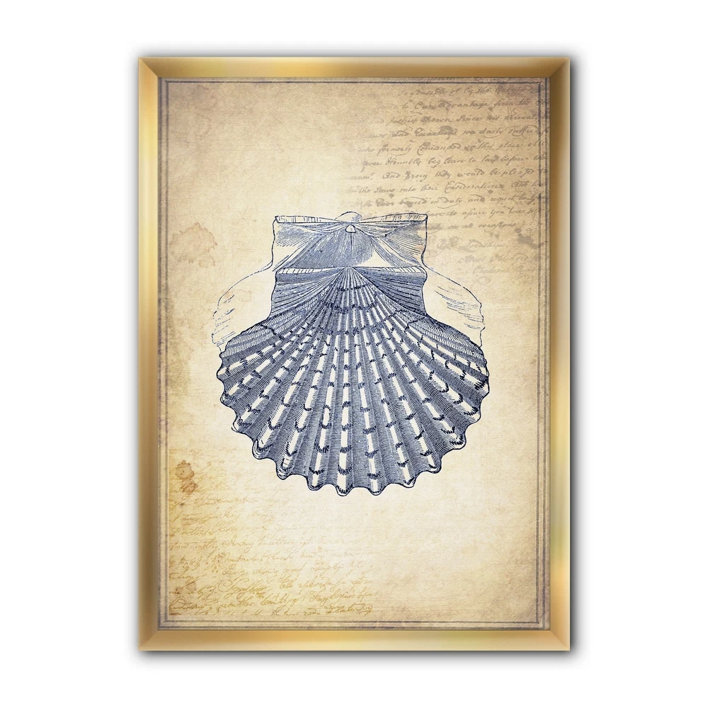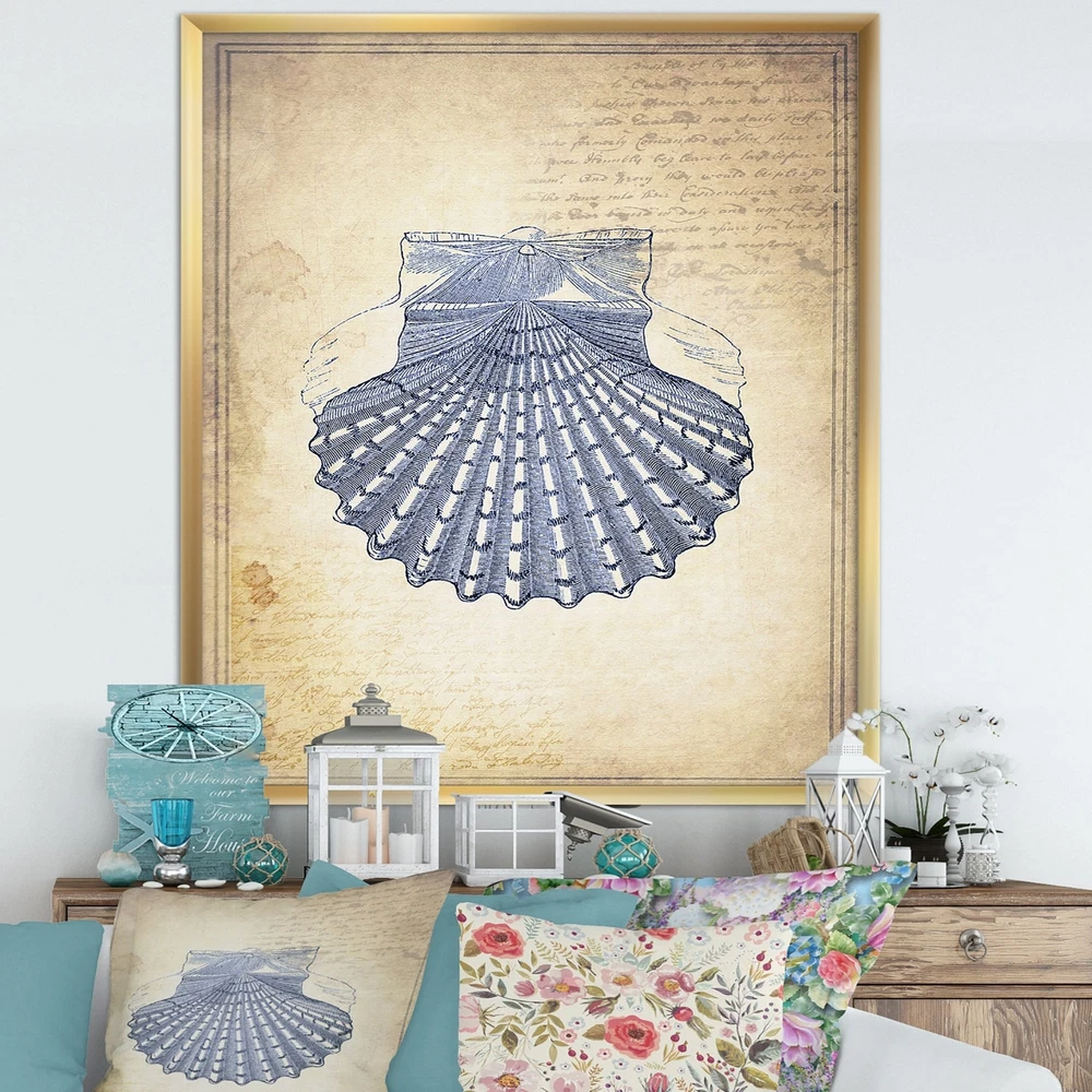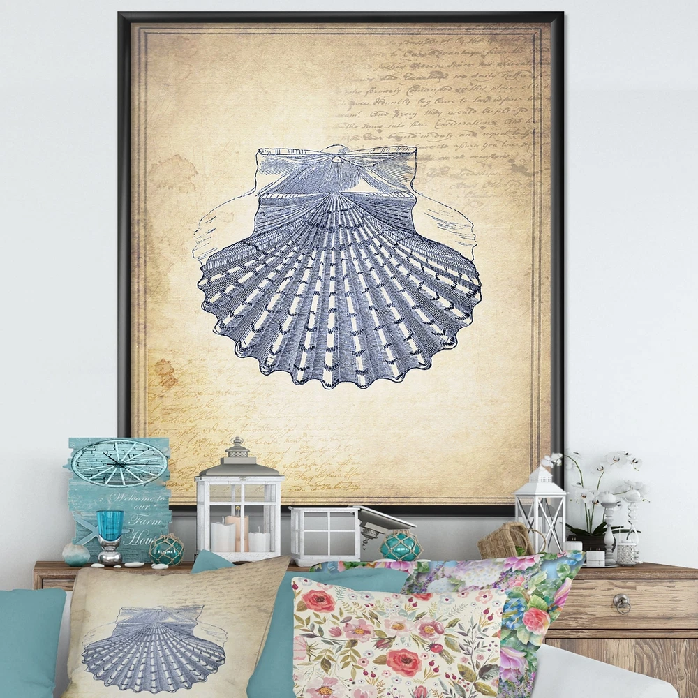 Bring memories of your last seaside vacation into your living room with this 'Blue Sea 3' framed art print by Designart. Featuring a large, drawn seashell on a light gold background with faint writing, this art print has a nautical and classic design for your beach house or beach-themed guest room. The art work is printed on a premium canvas with high-quality inks that resist fading to keep it looking like new for many years. The art print arrives with a hanging kit for easy installation.This framed art print is available in many different color frames. All of our framed art prints are carefully packaged with corner protectors, fragile labeling, and sturdy boxes to ensure a safe delivery. Every framed art arrives ready to hang on the wall, with the hanging kit included.Features:Style : Free Shipping Over $49.99* Details Designart "Blue Sea 3" Nautical & Coastal Framed Art Print Product Description: Bring memories of your last seaside vacation into your living room with this 'Blue Sea 3' framed art print by Designart. Featuring a large, drawn seashell on a light gold background with faint writing, this art print has a nautical and classic design for your beach house or beach-themed guest room. The art work is printed on a premium canvas with high-quality inks that resist fading to keep it looking like new for many years. The art print arrives with a hanging kit for easy installation. This framed art print is available in many different color frames. All of our framed art prints are carefully packaged with corner protectors, fragile labeling, and sturdy boxes to ensure a safe delivery. Every framed art arrives ready to hang on the wall, with the hanging kit included. Features: Style Traditional Subject Beach Color Blue Premium quality cotton canvas mounted. Available in several frame colors. Arrives with instructions and hanging kit