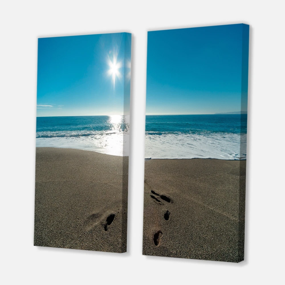 This beautiful Nautical & Coastal 2 piece set of Canvas Art is printed using the highest quality fade-resistant ink on canvas. Every one of our fine art giclee canvas prints is printed on premium quality cotton canvas, using the finest quality inks which will not fade over time. Each giclee print is stretched tightly over a 1-inch wood sub frame ensuring the canvas is taught and does not buckle. This canvas art print is gallery-wrapped (the design continues on the sides), giving it a real art gallery feel. All of our canvas prints are carefully packaged with plastic protection, fragile labeling, and sturdy boxes to ensure safe delivery. Every canvas print arrives ready to hang on the wall, with the hanging kits included.- Style : Nautical & Coastal- Subject : Beach, Landscapes- Color : Free Shipping Over $49.99* Details Designart "Blue Sea and Footprints in Sand" Seascape Canvas Wall Art Print 2 Product Description: This beautiful Nautical & Coastal 2 piece set of Canvas Art is printed using the highest quality fade-resistant ink on canvas. Every one of our fine art giclee canvas prints is printed on premium quality cotton canvas, using the finest quality inks which will not fade over time. Each giclee print is stretched tightly over a 1-inch wood sub frame ensuring the canvas is taught and does not buckle. This canvas art print is gallery-wrapped (the design continues on the sides), giving it a real art gallery feel. All of our canvas prints are carefully packaged with plastic protection, fragile labeling, and sturdy boxes to ensure safe delivery. Every canvas print arrives ready to hang on the wall, with the hanging kits included. - Style Nautical & Coastal - Subject Beach, Landscapes - Color Blue - This canvas giclee print is gallery-wrapped (the design continues on the sides), giving it a real art gallery feel. - Premium quality cotton canvas. - Arrives ready to hang on the wall - Easy to Hang