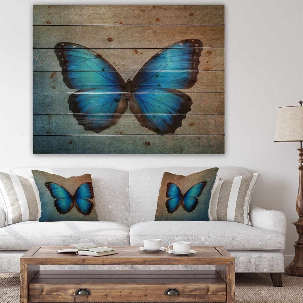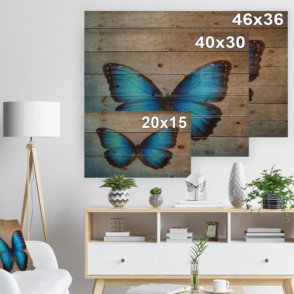 Alas, a modern take on wood wall art. Once typically a wall art piece found only in rustic or farmhouse style decor settings, this Floral wood wall art will easily fit into even the most contemporary of designs.Using the highest quality 6 Color Canon UV Ink, this Bohemian & Eclectic wood wall art incorporates several aspects of fine design into one stunning piece. With its slightly visible wood grain appearing through the colors and sleekly finished edges, it is a wonderful choice for any room in your home or office, being it a traditional or modern space. As each piece of wood has natural grain differences from the next, each of these wood wall arts is a truly unique addition to your space.Each Wood wall art is 100% handmade in Canada on Natural pine wood, using the highest quality ink Free Shipping Over $49.99* Details Designart 'Blue Vintage Butterfly' Floral Art Print on Natural Pine Wood - Blue Product Description: Alas, a modern take on wood wall art. Once typically a wall art piece found only in rustic or farmhouse style decor settings, this Floral wood wall art will easily fit into even the most contemporary of designs. Using the highest quality 6 Color Canon UV Ink, this Bohemian & Eclectic wood wall art incorporates several aspects of fine design into one stunning piece. With its slightly visible wood grain appearing through the colors and sleekly finished edges, it is a wonderful choice for any room in your home or office, being it a traditional or modern space. As each piece of wood has natural grain differences from the next, each of these wood wall arts is a truly unique addition to your space. Each Wood wall art is 100% handmade in Canada on Natural pine wood, using the highest quality ink which will not fade over time. Available in 3 Differents sizes 20x15, 40x30, 46x36 - OrientationHorizontal - SubjectFloral TypeWood Wall Art, Fine Art, Wood Fine Art, Print on Plaque - Arrives ready to hang on the wall with hanging kit included - MaterialMade with 100% natural pine wood - StyleBohemian & Eclectic- Number of Pieces1 - SizeMedium, Large, Small - ColorBlue