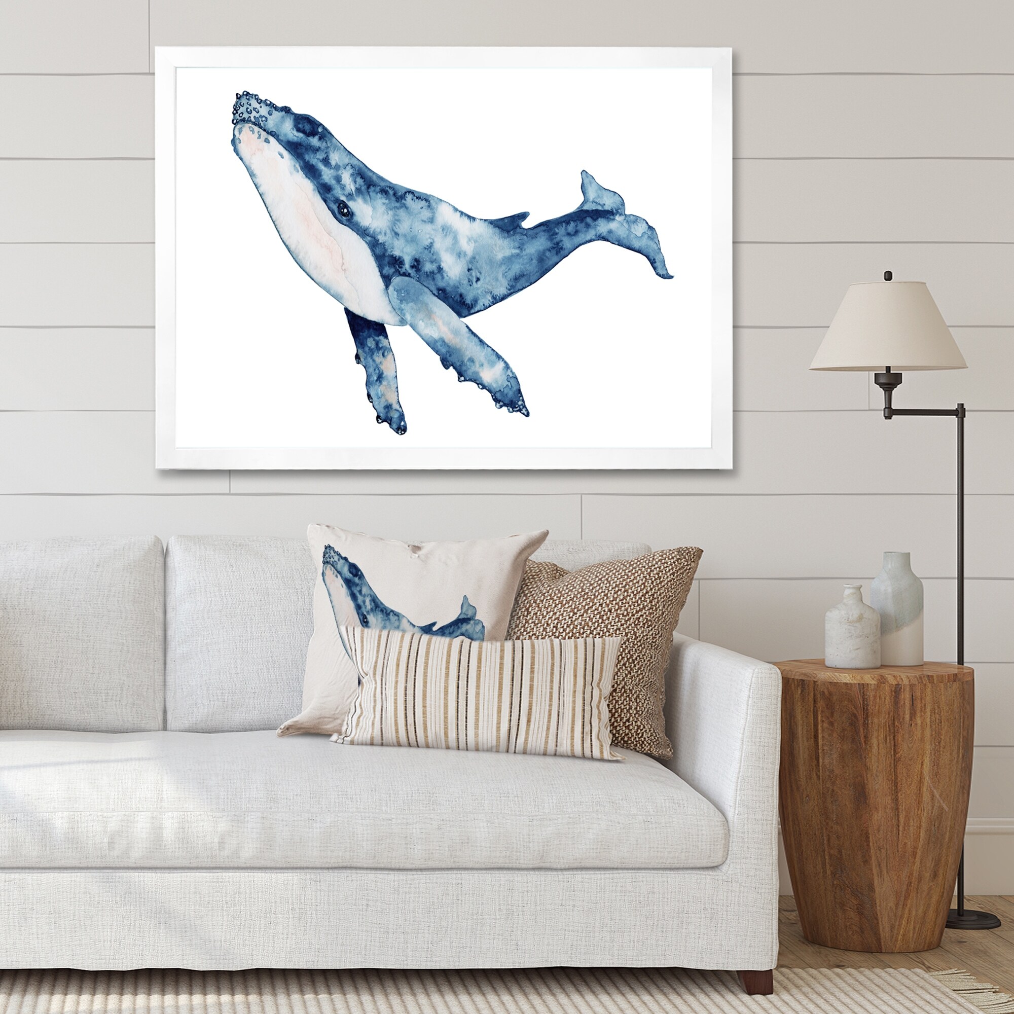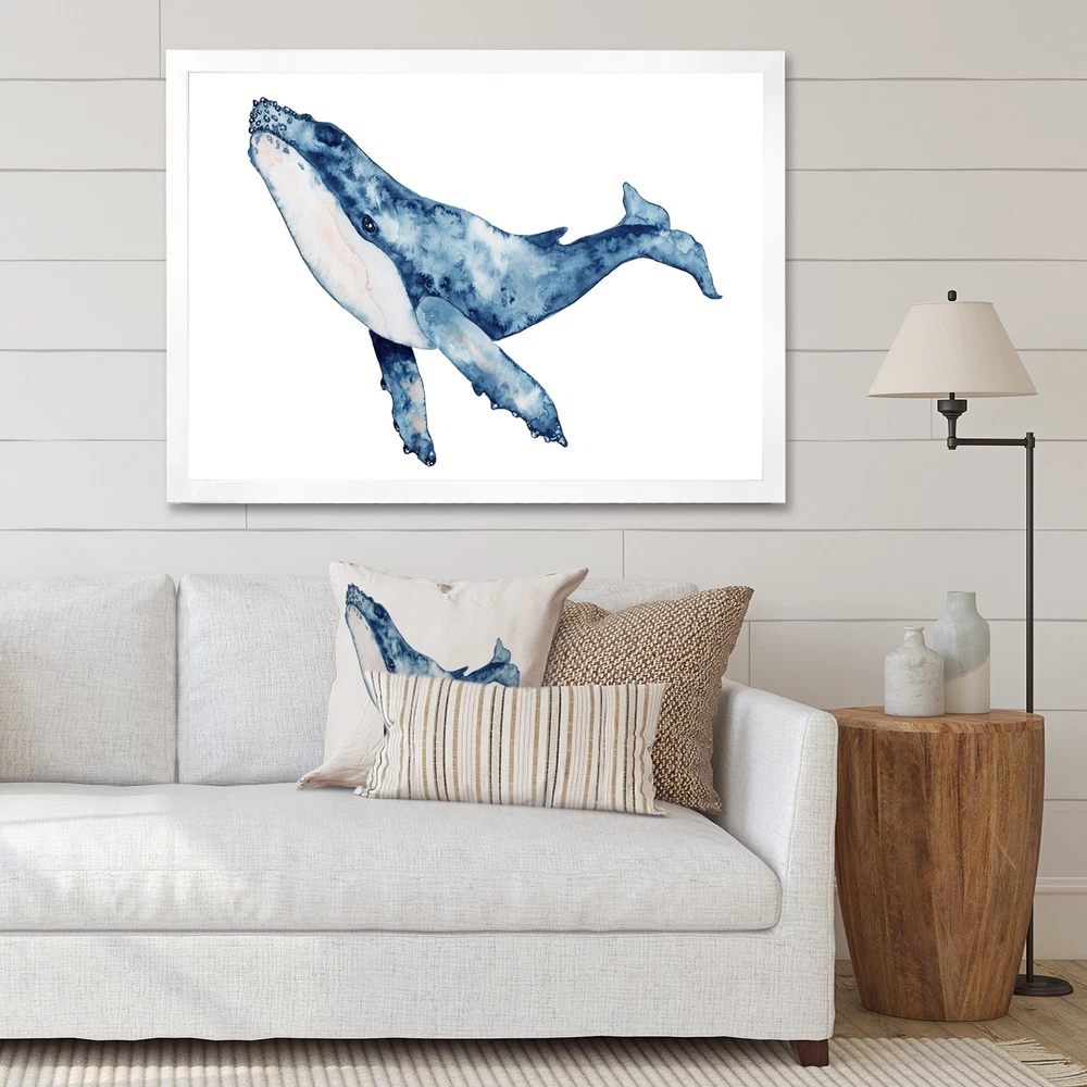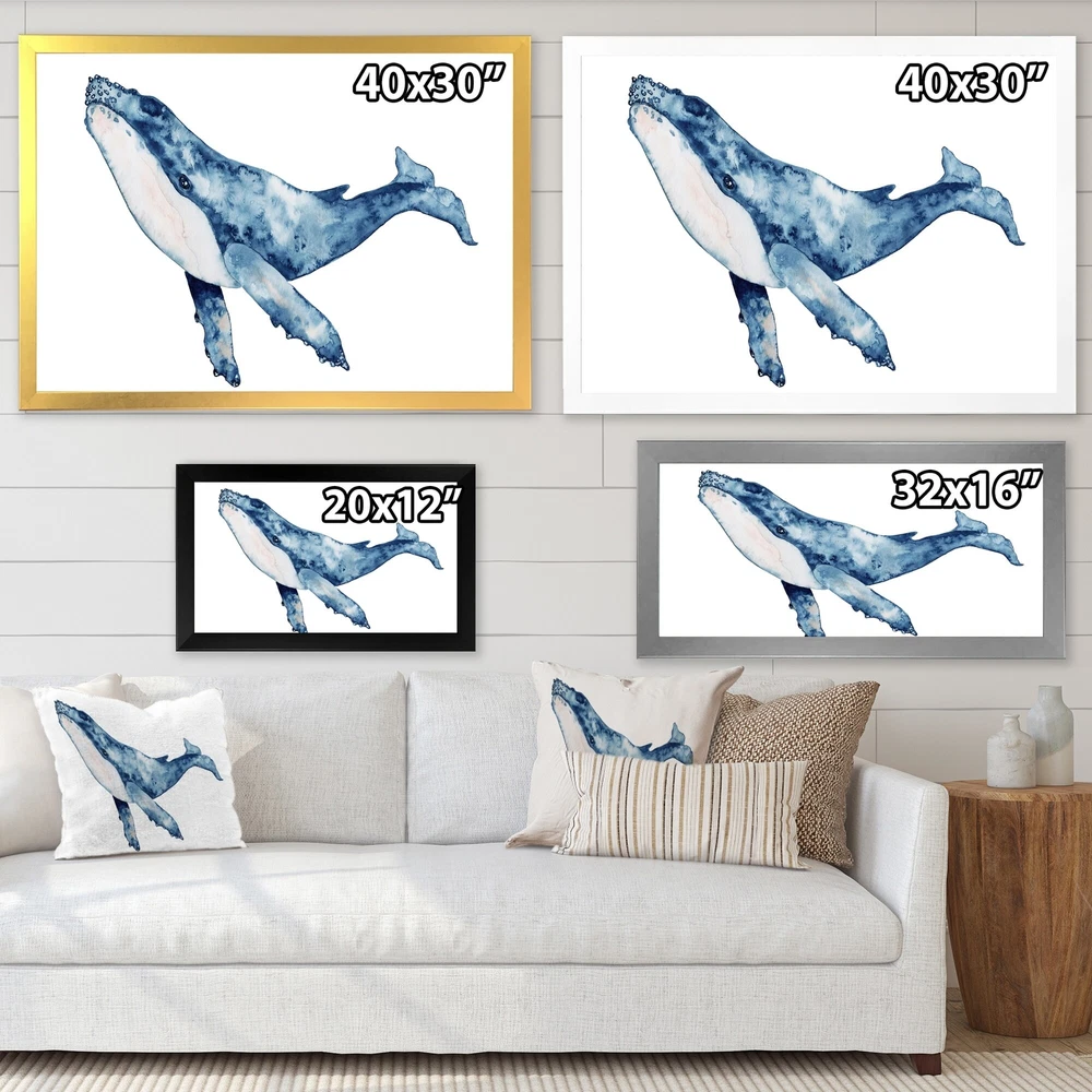 This beautiful Blue Whale On White II Framed wall Art is printed using the highest quality fade resistant ink on canvas. Every one of our Framed Giclee Prints is printed on premium quality canvas, using the finest quality inks which will not fade over time and then mounted and framed on a 1.5 inch wide frame.This framed art print is available in many different color frames. All of our framed art prints are carefully packaged with corner protectors, fragile labeling, and sturdy boxes to ensure a safe delivery. Every framed art arrives ready to hang on the wall, with the hanging kit included.Features:- Style : Nautical & Coastal- Subject : Animals- Color : Blue- Premium quality cotton canvas mounted.- Available in several frame colors. - Arrives with instructions and hanging kit Free Shipping Over $49.99* Details Designart "Blue Whale On White II" Nautical & Coastal Framed Art Print Product Description: This beautiful Blue Whale On White II Framed wall Art is printed using the highest quality fade resistant ink on canvas. Every one of our Framed Giclee Prints is printed on premium quality canvas, using the finest quality inks which will not fade over time and then mounted and framed on a 1.5 inch wide frame. This framed art print is available in many different color frames. All of our framed art prints are carefully packaged with corner protectors, fragile labeling, and sturdy boxes to ensure a safe delivery. Every framed art arrives ready to hang on the wall, with the hanging kit included. Features: - Style Nautical & Coastal - Subject Animals - Color Blue - Premium quality cotton canvas mounted. - Available in several frame colors. - Arrives with instructions and hanging kit