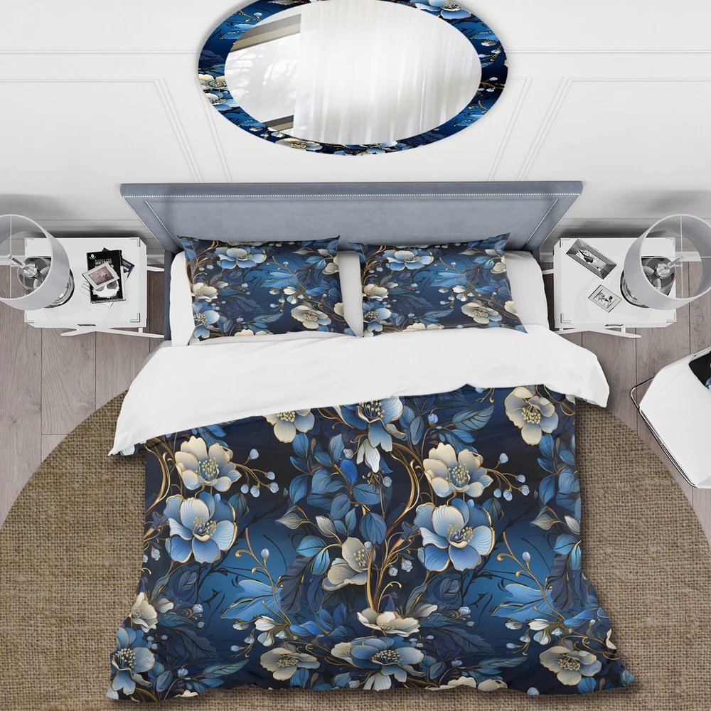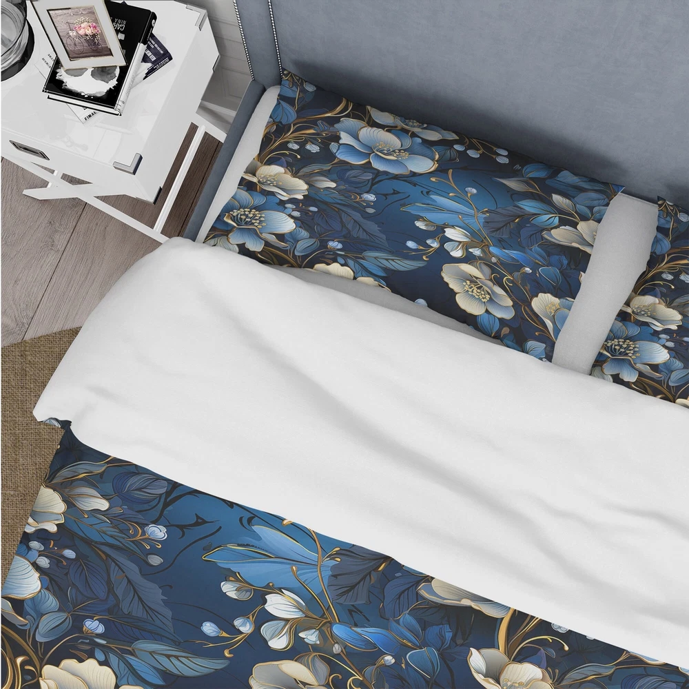 There is just nothing better than a beautiful, inviting comfortable bed after a long day. This Floral bed set is created using the richest colors stemming from high density Italian ink and the softest fabrics making it the perfect way to spruce up your bedroom, while keeping it ultra-comfortable. This luxurious Cobalt Blue Nouveau Vines Victorian Pattern II bed design is made with 100% microfiber polyester, making it ultra-soft to ensure you sleep comfortably all night long. This Cottage set includes 1 Bed Cover and 2 Shams and is available in twin, queen and king sizes.This Bedding Set is easily integrated into your already decorated space.What's Included? - Duvet Cover - Shams - Pillow Cases not included but can be buy separately - Comforter Insert NOT INCLUDEDFeatures Free Shipping Over $49.99* Details Designart "Cobalt Blue Nouveau Vines Victorian Pattern II" Cottage Bedding Cover Product Description: There is just nothing better than a beautiful, inviting comfortable bed after a long day. This Floral bed set is created using the richest colors stemming from high density Italian ink and the softest fabrics making it the perfect way to spruce up your bedroom, while keeping it ultra-comfortable. This luxurious Cobalt Blue Nouveau Vines Victorian Pattern II bed design is made with 100% microfiber polyester, making it ultra-soft to ensure you sleep comfortably all night long. This Cottage set includes 1 Bed Cover and 2 Shams and is available in twin, queen and king sizes. This Bedding Set is easily integrated into your already decorated space. What's Included? - Duvet Cover - Shams - Pillow Cases not included but can be buy separately - Comforter Insert NOT INCLUDED Features - Printed using High Density Italian Ink making the colors extra vibrant. - Made from ultra-soft, lightweight 100% microfiber polyester. Wrinkle resistant fabric. Down-like comfort, odorless. - The Cottage bed set includes one bed cover and two standard pillow shams to create a complete and stylish look. - The elegant and soft colors are both trendy and fun to brighten and update your bedroom. - Made in Canada - Decorative Wall Art and throw pillows to match this set are available but sold separately. - Actual comforter inserts and pillow inserts are not included. This set includes the two pillow shams and comforter cover only. King Dimensions: - 1 Duvet Cover104 inches wide x 88 inches long - 2 King Shams20 inches wide x 36 inches long Queen Dimensions: - 1 Duvet Cover88 inches wide x 88 inches long - 2 Standard Shams16 inches wide x 26 inches long Twin Dimensions: - 1 Duvet Cover68 inches wide x 88 inches long - 1 Standard Sham16 inches wide x 26 inches long Product Details - MaterialPolyester. - PatternFloral - ColorBlue - StyleCottage; traditional - ReversibleNo Directions: Fabric Care InstructionsMachine wash on cold gentle cycle. Wash separately on first wash. Use only non- chlorine bleach when needed. Tumble dry low. Remove promptly.