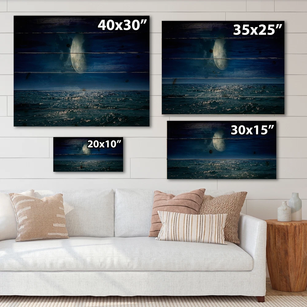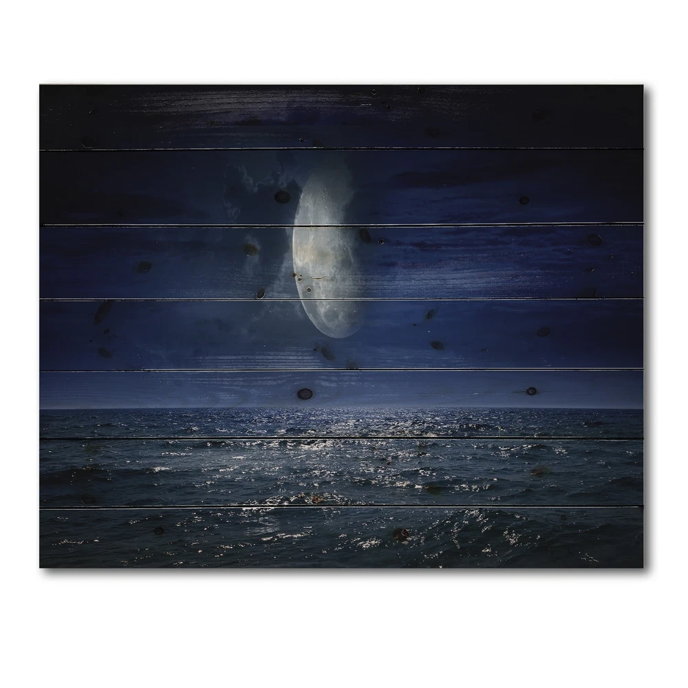 Alas, a modern take on wood wall art. Once typically a wall art piece found only in rustic or farmhouse style decor settings, this Landscapes wood wall art will easily fit into even the most contemporary of designs.Using the highest quality 6 Color Canon UV Ink, this Nautical & Coastal wood wall art incorporates several aspects of fine design into one stunning piece. With its slightly visible wood grain appearing through the colors and sleekly finished edges, it is a wonderful choice for any room in your home or office, being it a traditional or modern space. As each piece of wood has natural grain differences from the next, each of these wood wall arts is a truly unique addition to your space.Each Wood wall art is 100% handmade in Canada on Natural pine wood, using the highest quality ink Free Shipping Over $49.99* Details Designart 'Full Moon Over Dark Ocean At Night' Nautical & Coastal Print on Product Description: Alas, a modern take on wood wall art. Once typically a wall art piece found only in rustic or farmhouse style decor settings, this Landscapes wood wall art will easily fit into even the most contemporary of designs. Using the highest quality 6 Color Canon UV Ink, this Nautical & Coastal wood wall art incorporates several aspects of fine design into one stunning piece. With its slightly visible wood grain appearing through the colors and sleekly finished edges, it is a wonderful choice for any room in your home or office, being it a traditional or modern space. As each piece of wood has natural grain differences from the next, each of these wood wall arts is a truly unique addition to your space. Each Wood wall art is 100% handmade in Canada on Natural pine wood, using the highest quality ink which will not fade over time. Available in Differents sizes - OrientationHorizontal - SubjectLandscapes TypeWood Wall Art, Fine Art, Wood Fine Art, Print on Plaque - Arrives ready to hang on the wall with hanging kit included - MaterialMade with 100% natural pine wood - StyleNautical & Coastal - Number of Pieces1 - ColorBlue