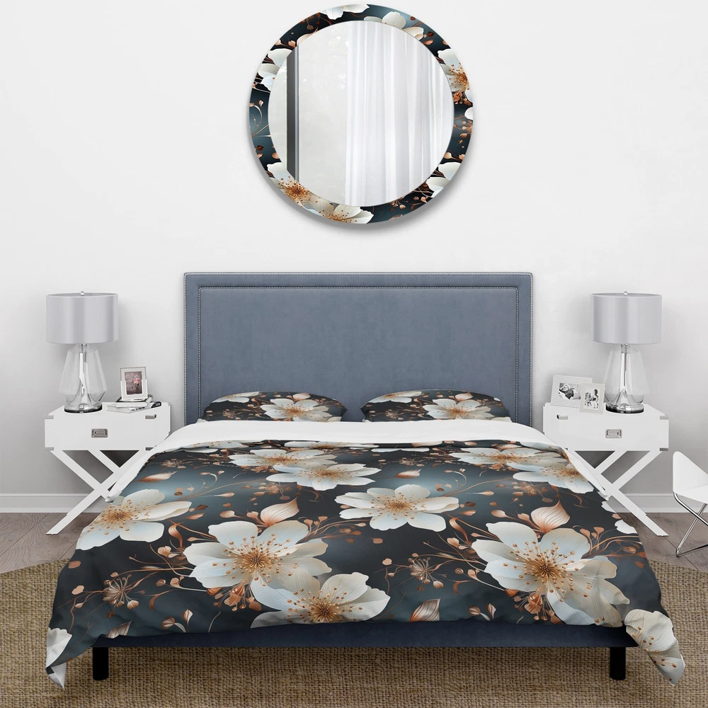 There is just nothing better than a beautiful, inviting comfortable bed after a long day. This Floral bed set is created using the richest colors stemming from high density Italian ink and the softest fabrics making it the perfect way to spruce up your bedroom, while keeping it ultra-comfortable. This luxurious Mystic Aura White And Gold Floral Delight bed design is made with 100% microfiber polyester, making it ultra-soft to ensure you sleep comfortably all night long. This Cottage set includes 1 Bed Cover and 2 Shams and is available in twin, queen and king sizes.This Bedding Set is easily integrated into your already decorated space.What's Included? - Duvet Cover - Shams - Pillow Cases not included but can be buy separately - Comforter Insert NOT INCLUDEDFeatures - Free Shipping Over $49.99* Details Designart "Mystic Aura White And Gold Floral Delight" Gold Cottage Bedding Set Product Description: There is just nothing better than a beautiful, inviting comfortable bed after a long day. This Floral bed set is created using the richest colors stemming from high density Italian ink and the softest fabrics making it the perfect way to spruce up your bedroom, while keeping it ultra-comfortable. This luxurious Mystic Aura White And Gold Floral Delight bed design is made with 100% microfiber polyester, making it ultra-soft to ensure you sleep comfortably all night long. This Cottage set includes 1 Bed Cover and 2 Shams and is available in twin, queen and king sizes. This Bedding Set is easily integrated into your already decorated space. What's Included? - Duvet Cover - Shams - Pillow Cases not included but can be buy separately - Comforter Insert NOT INCLUDED Features - Printed using High Density Italian Ink making the colors extra vibrant. - Made from ultra-soft, lightweight 100% microfiber polyester. Wrinkle resistant fabric. Down-like comfort, odorless. - The Cottage bed set includes one bed cover and two standard pillow shams to create a complete and stylish look. - The elegant and soft colors are both trendy and fun to brighten and update your bedroom. - Made in Canada - Decorative Wall Art and throw pillows to match this set are available but sold separately. - Actual comforter inserts and pillow inserts are not included. This set includes the two pillow shams and comforter cover only. King Dimensions: - 1 Duvet Cover104 inches wide x 88 inches long - 2 King Shams20 inches wide x 36 inches long Queen Dimensions: - 1 Duvet Cover88 inches wide x 88 inches long - 2 Standard Shams16 inches wide x 26 inches long Twin Dimensions: - 1 Duvet Cover68 inches wide x 88 inches long - 1 Standard Sham16 inches wide x 26 inches long Product Details - MaterialPolyester. - PatternFloral - ColorWhite; Gold - StyleCottage; traditional - ReversibleNo Directions: Fabric Care InstructionsMachine wash on cold gentle cycle. Wash separately on first wash. Use only non- chlorine bleach when needed. Tumble dry low. Remove promptly.