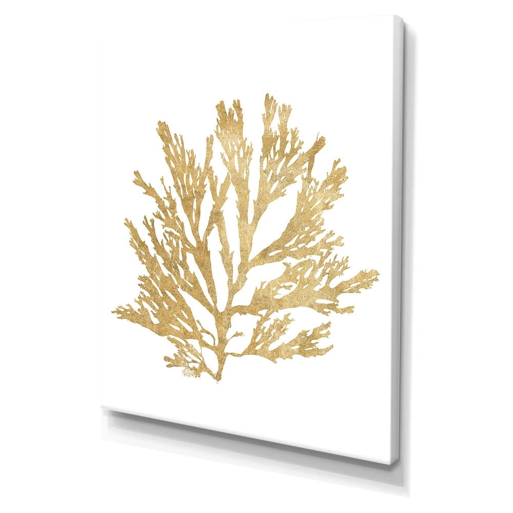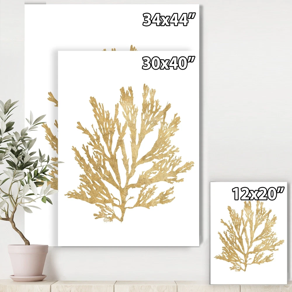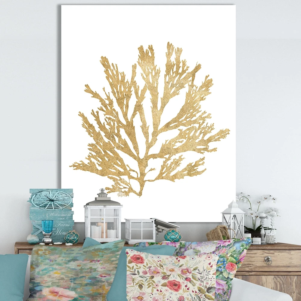 This beautiful Cottage Canvas Art is printed using the highest quality fade resistant ink on canvas. Every one of our fine art giclee canvas prints is printed on premium quality cotton canvas, using the finest quality inks which will not fade over time. Each giclee print is stretched tightly over a 1 inch wood sub frame for small size prints or a 1.5 inch wood sub frame for large size prints (40x30 60x28 ...) ensuring the canvas is taught and does not buckle. This canvas art print is gallery-wrapped (the design continues on the sides) , giving it a real art gallery feel. All of our canvas prints are carefully packaged with plastic protection, fragile labeling and sturdy boxes to ensure a safe delivery. Every canvas print arrives ready to hang on the wall, with the hanging kits included.- Free Shipping Over $49.99* Details Designart "Pacific Sea Mosses I Gold" Cottage Canvas Wall Art Product Description: This beautiful Cottage Canvas Art is printed using the highest quality fade resistant ink on canvas. Every one of our fine art giclee canvas prints is printed on premium quality cotton canvas, using the finest quality inks which will not fade over time. Each giclee print is stretched tightly over a 1 inch wood sub frame for small size prints or a 1.5 inch wood sub frame for large size prints (40x30 60x28 ...) ensuring the canvas is taught and does not buckle. This canvas art print is gallery-wrapped (the design continues on the sides) , giving it a real art gallery feel. All of our canvas prints are carefully packaged with plastic protection, fragile labeling and sturdy boxes to ensure a safe delivery. Every canvas print arrives ready to hang on the wall, with the hanging kits included. - Style Coastal - Subject Nature Scenes, Beach - Color Gold - This canvas giclee print is gallery-wrapped (the design continues on the sides) , giving it a real art gallery feel. - Premium quality cotton canvas. - Arrives ready to hang on the wall - Easy to Hang