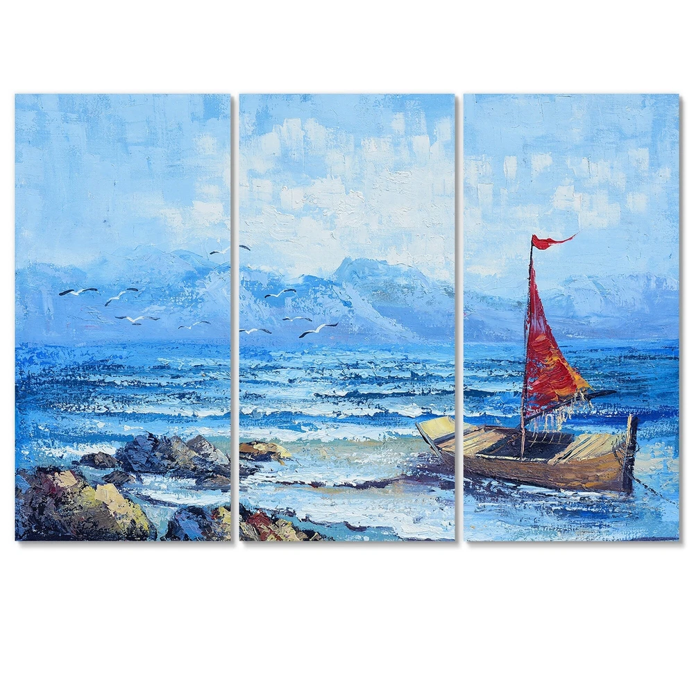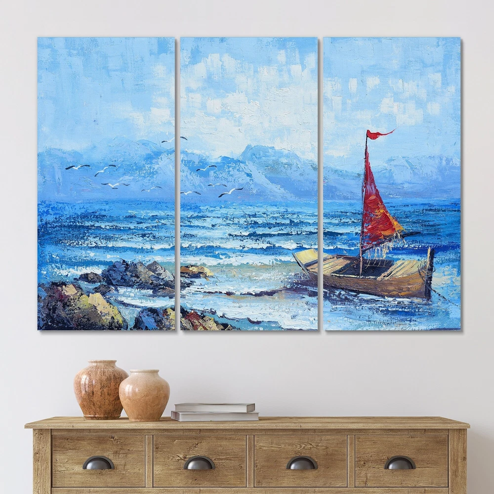 This beautiful Red Sailboat On Blue Ocean Multipanels canvas art is printed using the highest quality fade-resistant ink on canvas. Every one of our fine art giclee canvas prints is printed on premium quality cotton canvas, using the finest quality inks which will not fade over time. Each giclee print is stretched tightly over a 1-inch wood subframe ensuring the canvas is taught and does not buckle. This canvas art print is gallery-wrapped (the design continues on the sides), giving it a real art gallery feel. All of our canvas prints are carefully packaged with plastic protection, fragile labeling, and sturdy boxes to ensure safe delivery. Every canvas print arrives ready to hang on the wall, with the hanging kits included.- Style : Nautical & Coastal- Subject : Beach, Landscapes- Color : Free Shipping Over $49.99* Details Designart "Red Sailboat On Blue Ocean" Nautical & Coastal Canvas Wall Art Print Product Description: This beautiful Red Sailboat On Blue Ocean Multipanels canvas art is printed using the highest quality fade-resistant ink on canvas. Every one of our fine art giclee canvas prints is printed on premium quality cotton canvas, using the finest quality inks which will not fade over time. Each giclee print is stretched tightly over a 1-inch wood subframe ensuring the canvas is taught and does not buckle. This canvas art print is gallery-wrapped (the design continues on the sides), giving it a real art gallery feel. All of our canvas prints are carefully packaged with plastic protection, fragile labeling, and sturdy boxes to ensure safe delivery. Every canvas print arrives ready to hang on the wall, with the hanging kits included. - Style Nautical & Coastal - Subject Beach, Landscapes - Color Blue - This canvas giclee print is gallery-wrapped (the design continues on the sides) , giving it a real art gallery feel. - Premium quality cotton canvas. - Arrives ready to hang on the wall - Easy to Hang