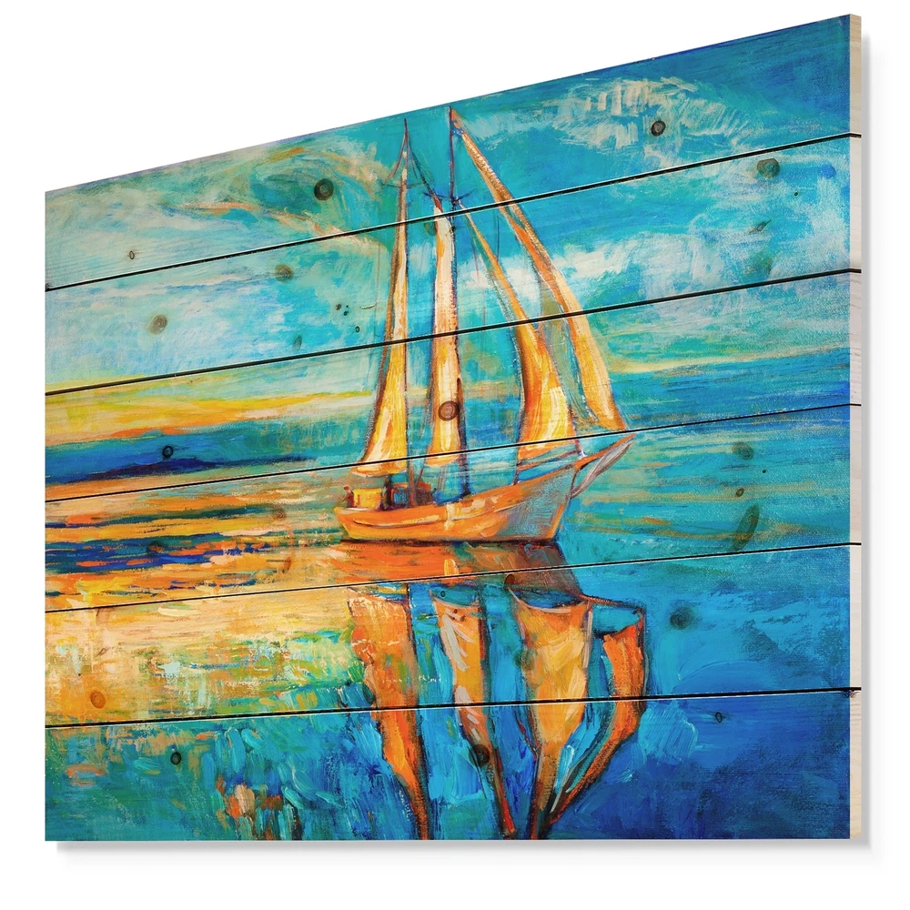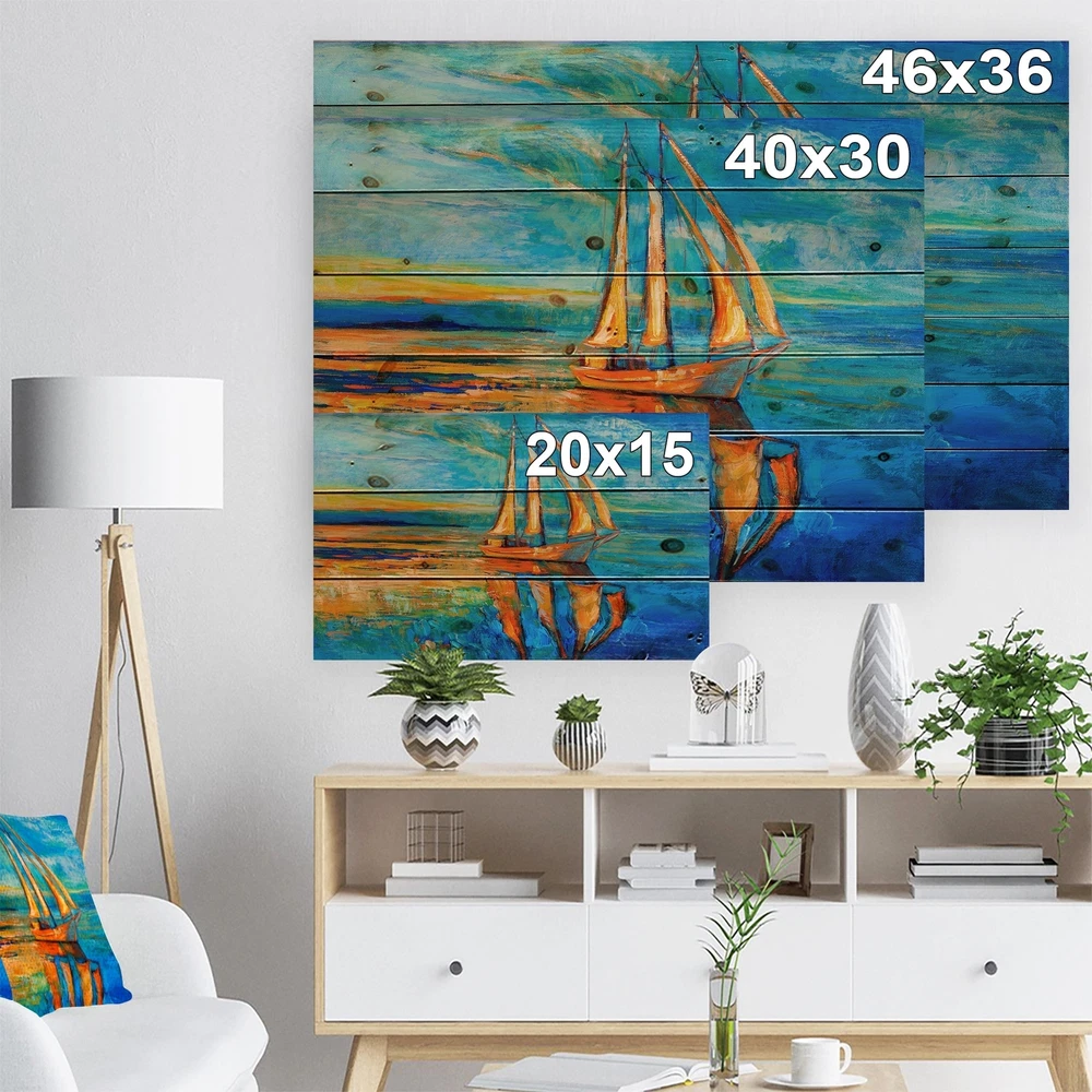 Alas, a modern take on wood wall art. Once typically a wall art piece found only in rustic or farmhouse style decor settings, this Sea & Shore wood wall art will easily fit into even the most contemporary of designs.Using the highest quality 6 Color Canon UV Ink, this Nautical & Coastal wood wall art incorporates several aspects of fine design into one stunning piece. With its slightly visible wood grain appearing through the colors and sleekly finished edges, it is a wonderful choice for any room in your home or office, being it a traditional or modern space. As each piece of wood has natural grain differences from the next, each of these wood wall arts is a truly unique addition to your space.Each Wood wall art is 100% handmade in Canada on Natural pine wood, using the highest quality Free Shipping Over $49.99* Details Designart 'Sail Ship at Sunset in Blue Sky' Sea & Shore Print on Natural Pine Product Description: Alas, a modern take on wood wall art. Once typically a wall art piece found only in rustic or farmhouse style decor settings, this Sea & Shore wood wall art will easily fit into even the most contemporary of designs. Using the highest quality 6 Color Canon UV Ink, this Nautical & Coastal wood wall art incorporates several aspects of fine design into one stunning piece. With its slightly visible wood grain appearing through the colors and sleekly finished edges, it is a wonderful choice for any room in your home or office, being it a traditional or modern space. As each piece of wood has natural grain differences from the next, each of these wood wall arts is a truly unique addition to your space. Each Wood wall art is 100% handmade in Canada on Natural pine wood, using the highest quality ink which will not fade over time. Available in 3 Differents sizes 20x15, 40x30, 46x36 - OrientationHorizontal - SubjectSea & Shore TypeWood Wall Art, Fine Art, Wood Fine Art, Print on Plaque - Arrives ready to hang on the wall with hanging kit included - MaterialMade with 100% natural pine wood - StyleNautical & Coastal- Number of Pieces1 - SizeMedium, Large, Small - ColorBlue